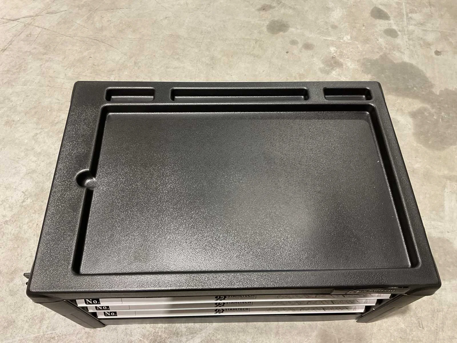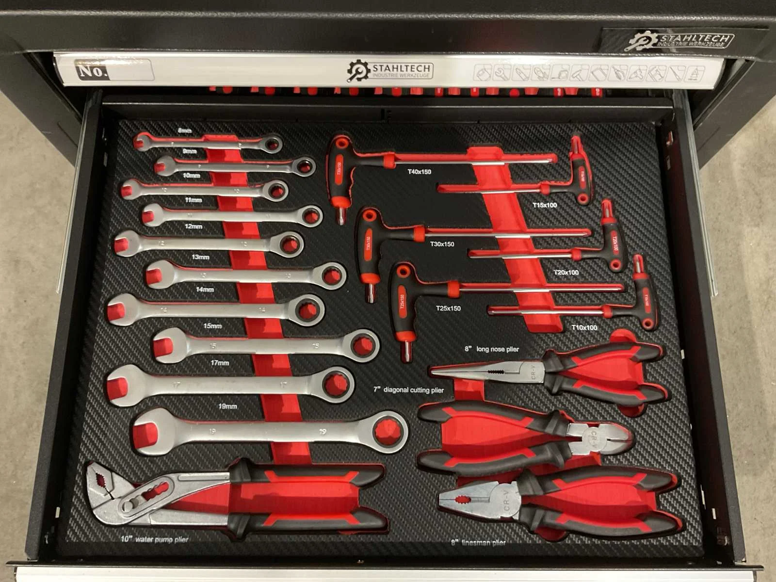 Voorzien van 1/2” en 1/4 sets doppen, tork; bitjes set; diverse tangen; 10x steeksleutel/ringsleutels; 6x tork schroevendraaier; 19x schroevendraaierset; inbussleutel set; afsluitbare kunstof ladekast met stalen lades; ongebruikt in doos Merk: Stahltech Type: Nl181477210806 3-la kast met 129 PCS tools Bouwjaar: 2025 Eigen gewicht: 37kg Totale afmeting L: 72.5mm Totale afmeting Breedte: 50mm Totale afmeting Hoogte: 38.5mm