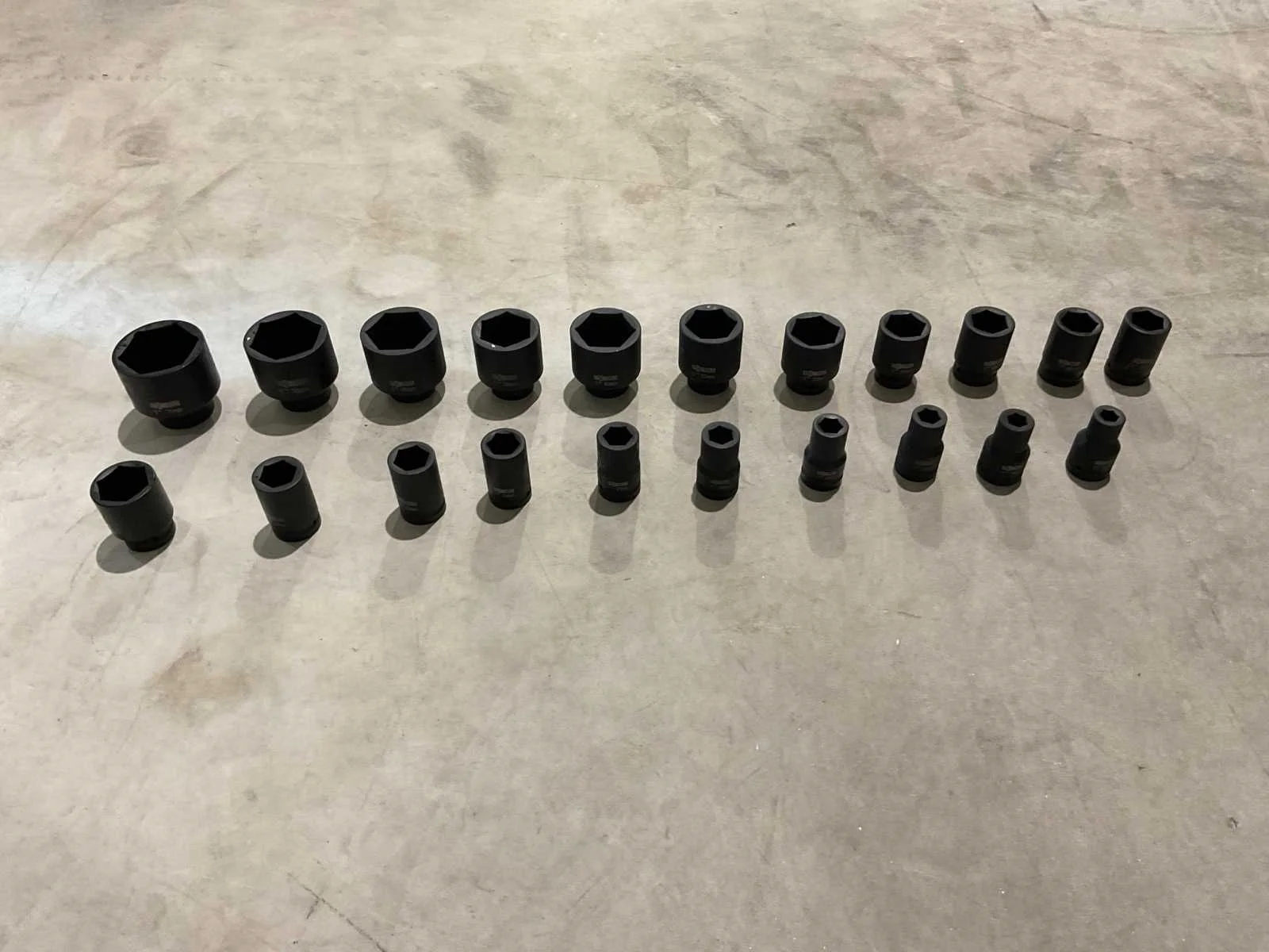 Voorzien van Krachtdoppenset; 3/4" maten: 17, 19, 21, 22, 24, 27, 30, 32, 33, 34, 36, 38, 41, 46, 50 mm; 1" doppen: 52, 55, 60, 65, 70, 75 mm; Ongebruikt in doos (gewicht inclusief verpakking 22,90 kg) Merk: SG Tools Delig: 21 Krachtdop uitvoering: true Type: 21 PCS impact Socket Set1 Bouwjaar: 2025