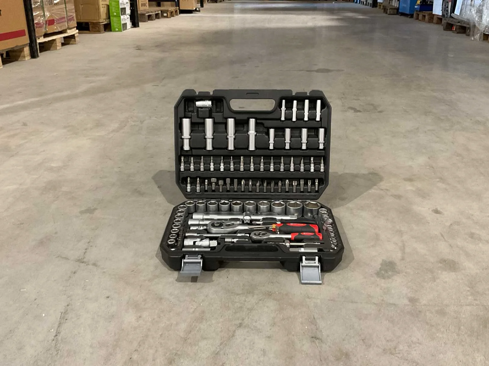 Voorzien van 13 x doppenset DR6PTREG maten 4-4,5-5-5,5-6-7-8-9-10-11-12-13-14; 8 1/4” DR6PT diepe doppen maten: 6-7-8-9-10-11-12-13; 3 x 1/4” DRBIT Doppen: FD 4-5,5-7; 2 x 1/4” DRBIT Doppen: PH1-PH2; 2 x 1/4” DRBIT doppen: PZ1-PZ2; 4 x 1/4” DRBIT Doppen: HW 3-4-5-6; 6 X 1/4” DRBIT Doppen: TX 8-10-15-20-25-30; 1 X 1/4” Doppenadapter; 1 x 1/4” DR Ratelsleutel; 2 x 1/4” DR verlengstuk 2”-4”; 1 x 1/4” verstelbare t sleutel; 1 x 1/4” DR universele koppeling; 1 x DR Spinnersleutel; 1 x DR Flexibele spinner sleutel; 18 x 1/2” DR6PTREG doppen: 10-11-12-13-14-15-16-17-18-19-20-21-22-23-24-27-30-32; 4 x 1/2” DR6PTDEEP doppen: 14-15-17-19; 2 x 1/2” DREXTENTION: 5-10’; 2 x 1/2” Bougie sleutel 16-21; 1 x 1/2” DR Universele koppeling; 1 x 1/2” DR 8 Hexagon bit koppeling; 1 x 3/8” Fx1/2”M 3weg adapter; 5 x inbussleutel 1,5-2-25 25-bits; kunststof koffer; Ongebruikt in doos Merk: Metallo Met koffer: true Delig: 106 Type: Meta-106W Bouwjaar: 2025
