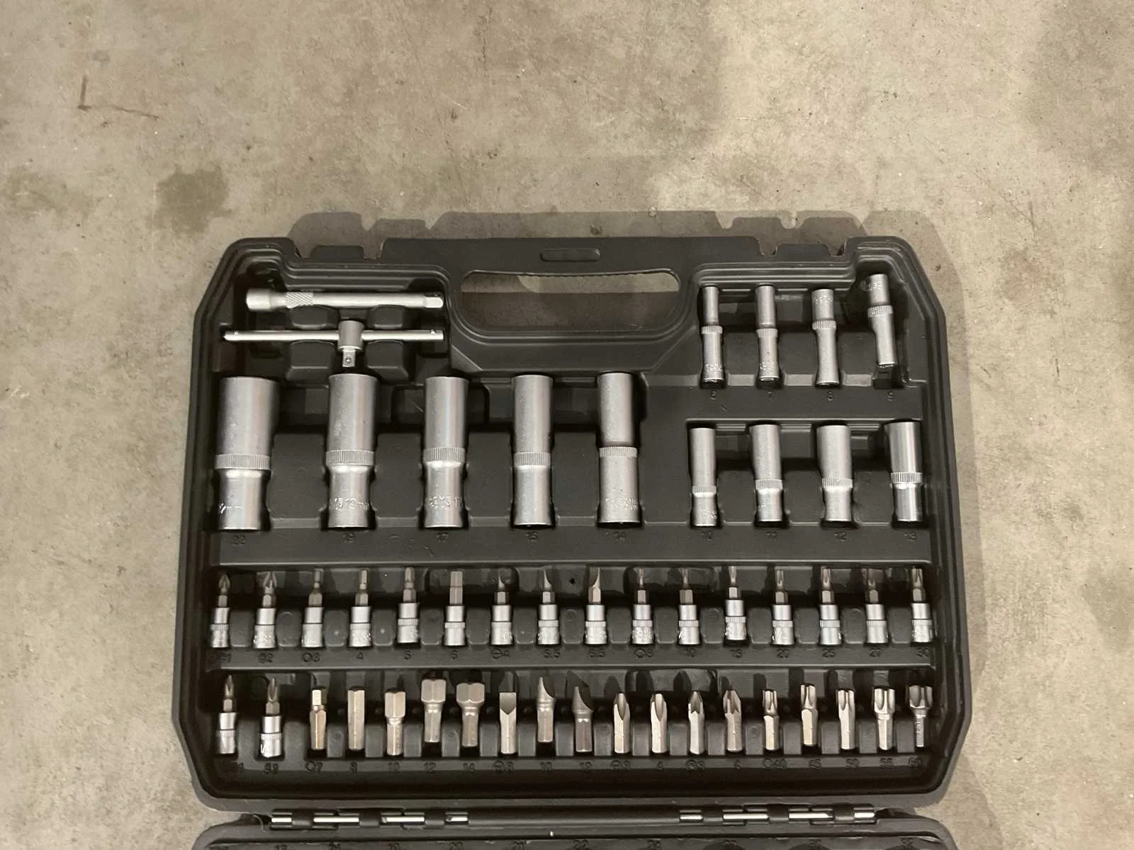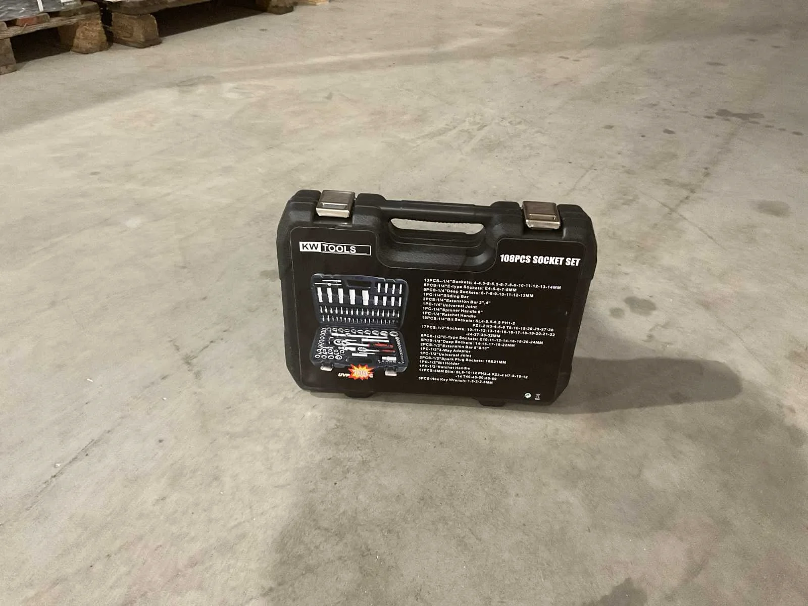 Voorzien van 1/4" Doppen 4-4.5-5-5.5-6-7-8-9-10-11-12-13-14mm; 1/4" Lange doppen 6-7-8-9-10-11-12-13mm; 1/4" Torx doppen E4-E5-E6-E7-E8; 1/4" Inbus op dop 3-4-5-6mm; 1/4" Philips op dop PH.1-PH.2; 1/4" Pozidriv op dop PZ.1-PZ.2 1/4" Platte bit op dop 4-5.5-6.5mm; 1/4" Torx op dop T8-T10-T15-T20-T25-T27-T30; 1/4" Ratel 72 tanden Quick release; 1/4" Verlengstukken 50-100mm; 1/4" Kniegewricht; 1/4'' T Hendel; 1/4" Spinner; 1/2" Doppen 10-11-12-13-14-15-16-17-18-19-20-21-22-24-27-30-32mm; 1/2" Lange doppen 14-15-17-19-22mm; 1/2" Torx doppen E10-E11-E12-E14-E16-E18-E20-E24; 1/2" Inbus bitten 7-8-10-12-14mm; 1/2" Philips bitten PH.3-PH.4; 1/2" Pozidriv bitten PZ.3-PZ.4; 1/2" Platte bitten 8-10-12mm; 1/2" Torx bitten T40-T45-T50-T55-T60; 1/2" Bit houder; 1/2" Ratel 72 tanden Quick release; 1/2" Verlengstukken 125-250mm; 1/2" Bougiedoppen 16-21mm; 1/2" Kniegewricht; Inbus L-sleutels 1.5-2-2.5mm; Ongebruikt in doos (Transport Afmeting 380 x 80 x 290, Gewicht 6.52kg) Merk: KW Tools Met koffer: true Delig: 108 Type: 108Pcs Socket set Bouwjaar: 2025