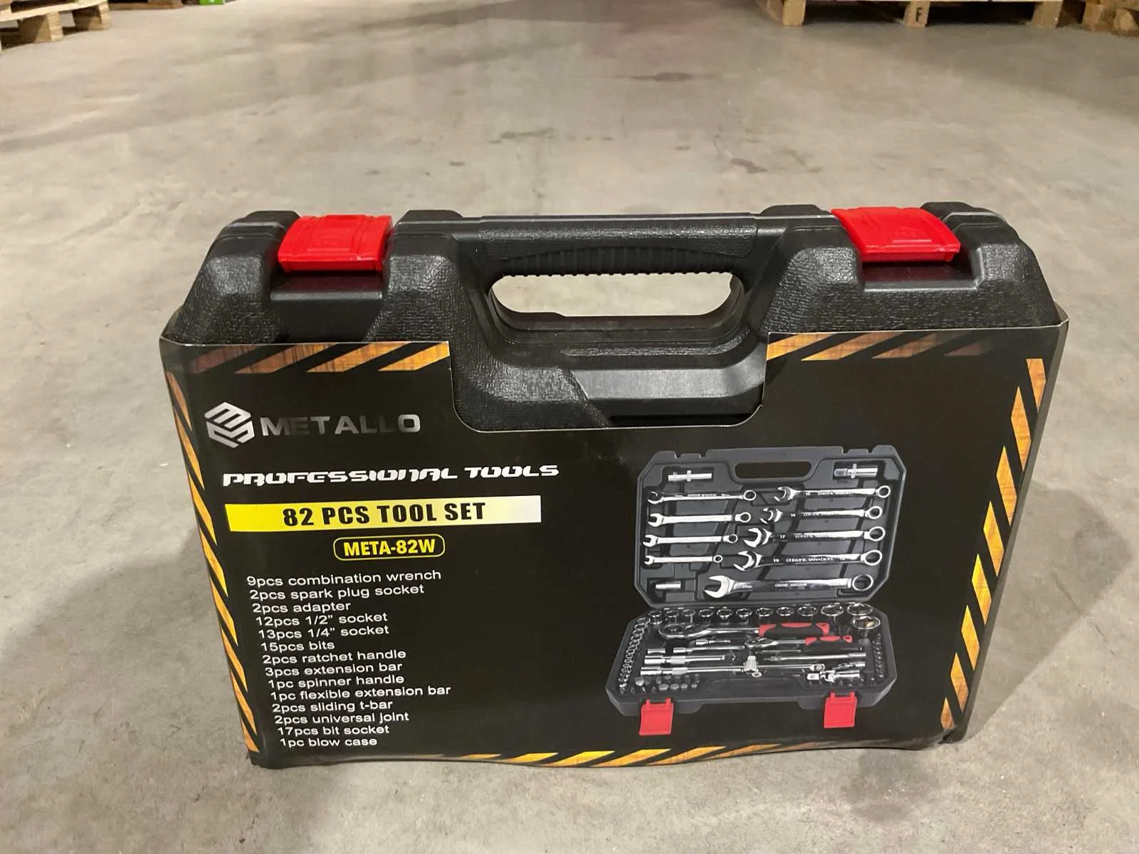 Voorzien van 9 x Ring/steeksleutel; 2 x Bougiesleutel; 2 x adapters; 12 x 1/2"Doppenset; 13 x 1/4" Doppenset; 15 x bitset; 2 x Ratelsleutel; 3 x verlengstukken; 1 x Spinner; 1 x Flexibele verlengstuk; 2 x Sliding T-Bar; 2 x Universele aansluiting; 17 x bitjes set; 1 x Kunststofkoffer; Ongebruikt in doos (Transport afmeting 385 x 80 x 290, Gewicht 5.75 KG Merk: Metallo Met koffer: true Delig: 82 Type: META-82W Bouwjaar: 2025