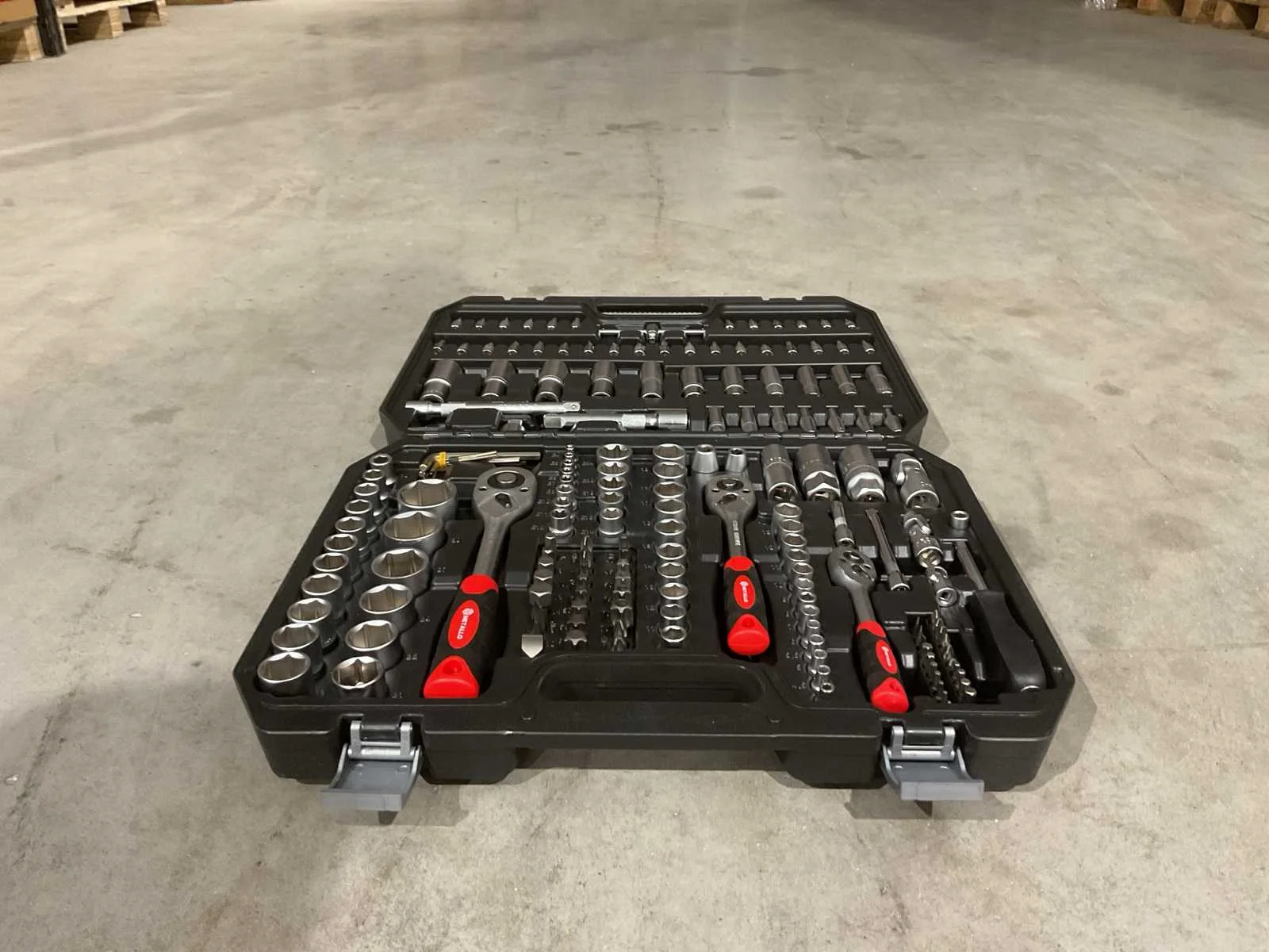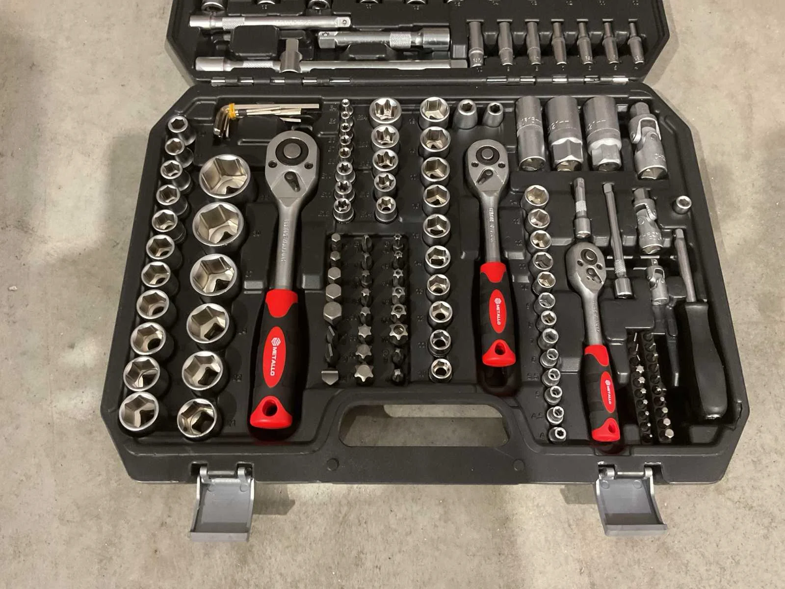 13 stuks 1/4 " Socket: 4,4,5,5,5,5,6,7,8,9,10,11,12,13,14 mm; 7 stuks 1/4 " diepe wandcontactdoos 4,5,6,7,8,9,10 mm; 5 stuks 1/4 " E-doppen E4, E5, E6, E7, E8; 2 stuks 1/4 " verlengstang 2 'en 4"; 1 stuk 1/4 " Sliding T-Bar; 1 stuk 1/4 " universele koppeling; 1 stuk 1/4 " koppeling; 1 stuk 1/4 " Quick Release ratelhendel; 30 stuks 1/4 " Bit-doppen; 10 stuks 3/8 " Doppen 10,11,12,13,14,15,16,17,18,19mm; 6 stuks 3/8 " Sockets 10,11,12,13,14,15; 5 stuks 3/8 " E-doppen E10, E11, E12, E14, E16, E18; 1 stuk 3/8 " Extention Bar 5"; 1 stuk 3/8 " koppeling ;1 stuk 3/8 " Bougie Dop 18 mm; 1 stuk 3/8 " Quick Release Ratchet Hanlde;18 stuks 1/2 " Sockets 10,11,12,13,14,15,16,17,18,19,20,21,22,23,24,27,30,32mm; 5 stuks 1/2 " diepe doppen 16,17,18,19,22 mm; 3 stuks 1/2 " E-doppen E20, E24; 2 stuks 1/2 " Extension Bar 5" & 10 "(met driewegadapter); 1 stuk 1/2 " universele verbinding; 1 stuk 1/2 " koppeling; 2 stuks 1/2 " Bougie Dop 16 mm en 21 mm; 1 stuk 1/2 " Quick Release ratelhendel; 1 stuk Inbussleutel Set 1,1.5,2,2.5,3,4,5mm; 20 stuks 25mm bits in bits houder; 24 stuks 30mm bits; 1 stuk spinnerhandvat; Ongebruikt in doos (Transport afmeting 450 x 90 x 350, Gewicht 8.4 KG) Merk: Metallo Met koffer: true Delig: 171 Type: META-171W Bouwjaar: 2025