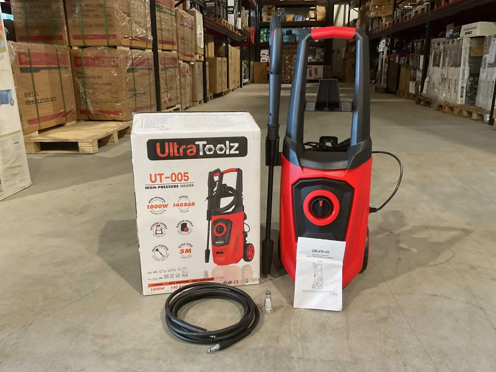 Voorzien van 1800W motor; 500 cm slang; foam spuit; ongebruikt in doos (transport afmetingen 40x40x55 cm) Merk: UltraToolz Type: UT-005 Bouwjaar: 2025 Max. druk: 140bar Kleur: Rood Gewicht: 10kg