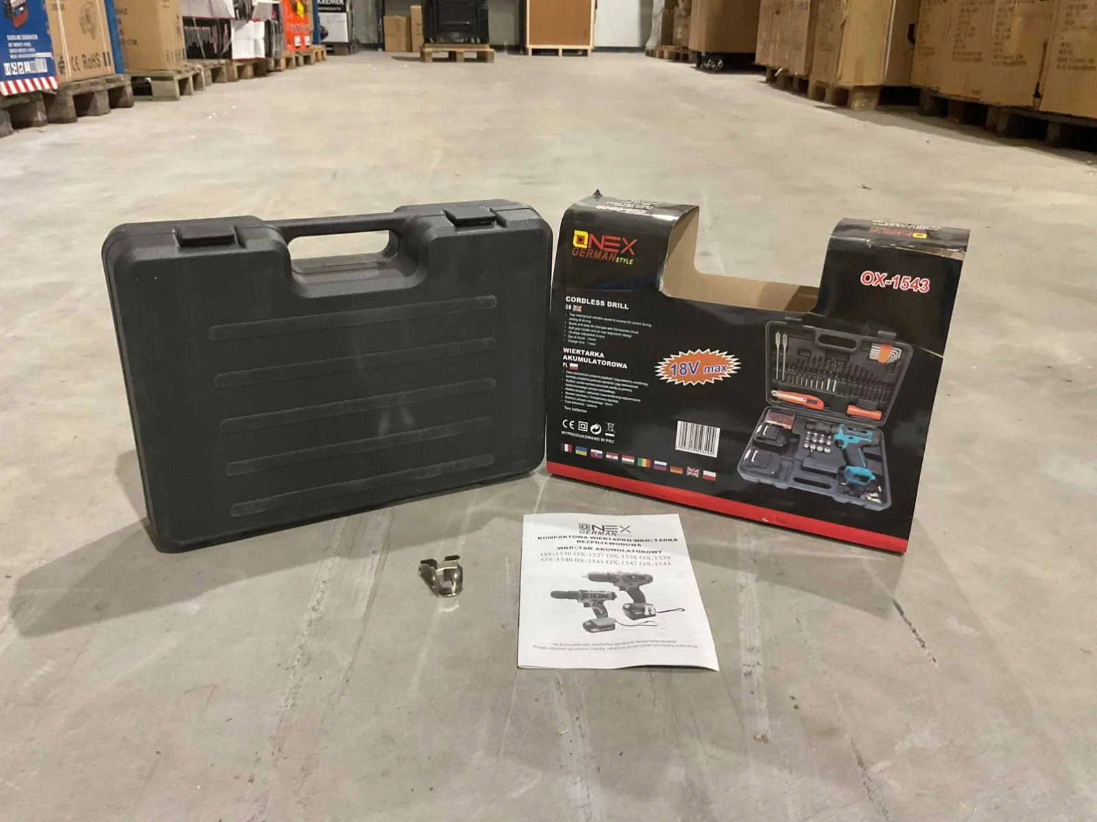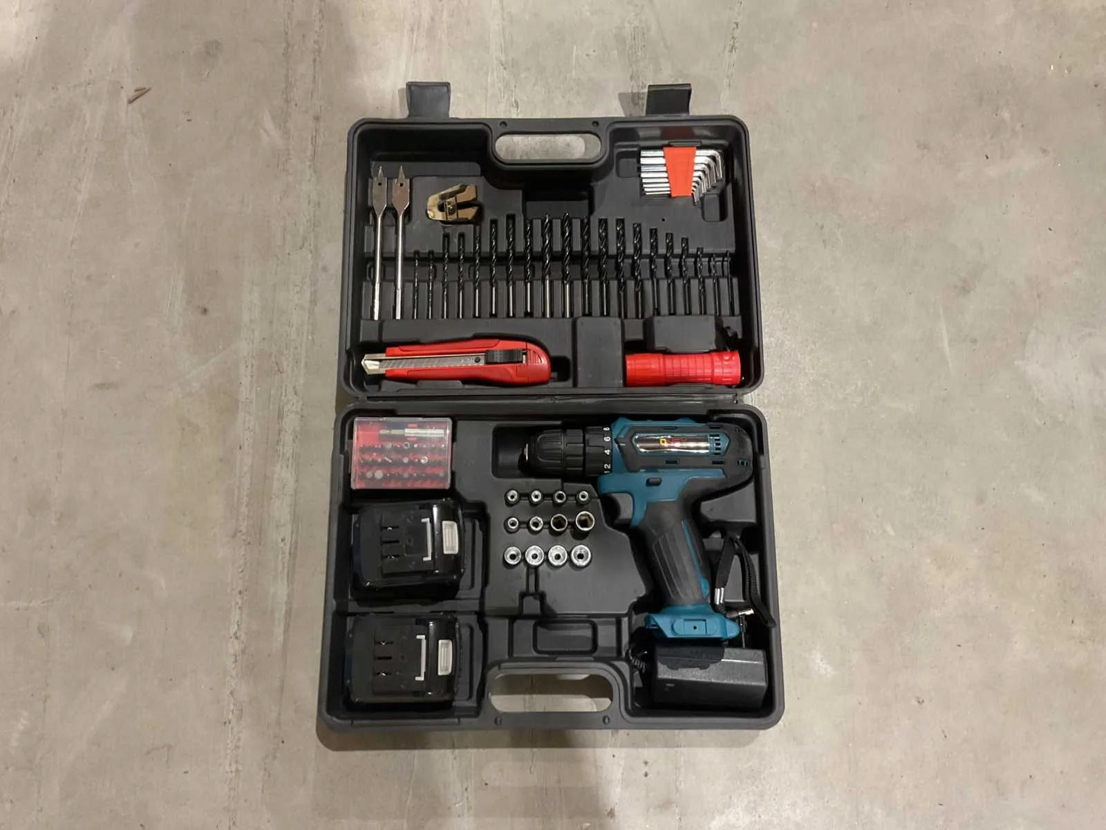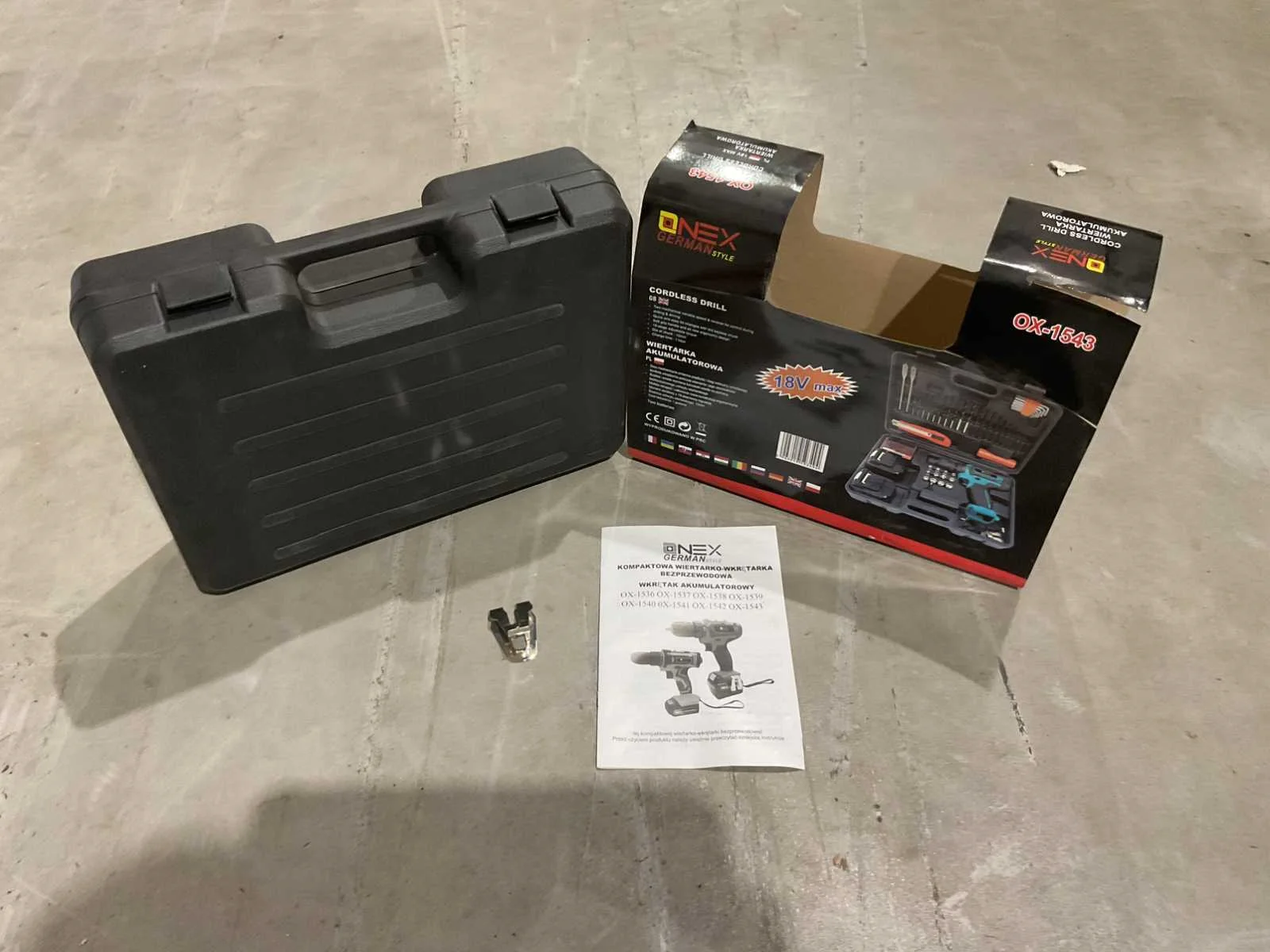 Onex boormachine met koffer voorzien van; 2 accu’s; accu lader; 12 doppen; bittenset; zakmes; zaklamp; 2 vlinderboren; 20 boren; 8 delige imbus set; ongebruikt Merk: Onex Type: OX-1543 Bouwjaar: 2024 Accuspanning: 18V Aantal accu's: 2 Accu type: LI-Ion Accu lader: true Vermogen: 27W Met koffer: true