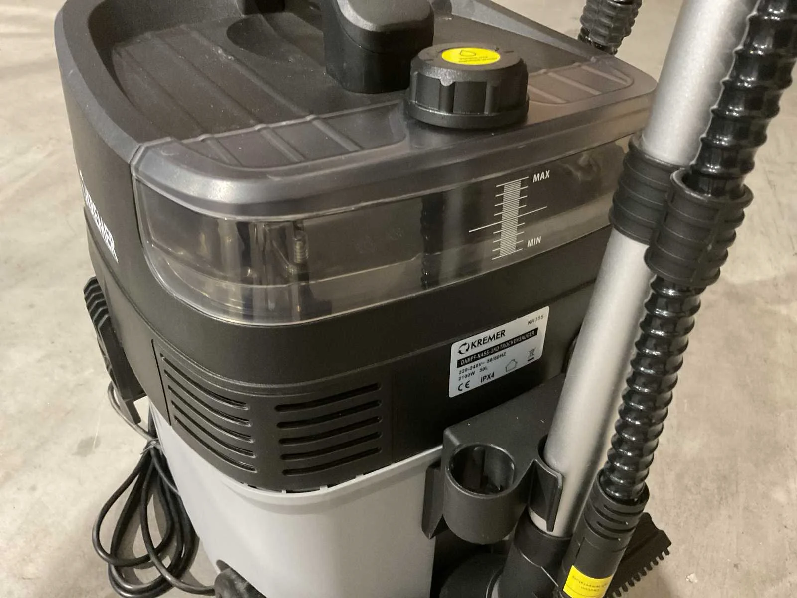 Voorzien van nat en droog functie; bescherming tegen oververhitting; Nat- en droog stofzuiger; Stoom functie; Sproei functie; Inhoud 30 Liter; Kunststof Ketel; 2100W; 2 Zwenkwielen; 2 Starre wielen spray en zuig functie; Ongebruikt in doos (Afmeting transport verpakking 615x435x545 mm lxbxh, gewicht 13.8 kg) Merk: Kremer Type: KR35S Bouwjaar: 2025 Capaciteit.: 30l/hr Mobiel: true Vermogen: 2100kW Aansluiting: 220V Eigen gewicht: 13.8kg Totale afmeting L: 615mm Totale afmeting Breedte: 435mm Totale afmeting Hoogte: 545mm