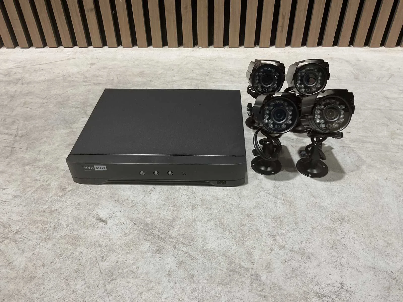 Voorzien van 4 camera’s; bewegingssensor; DVR; Resolutie VGA 1280X1024; 4 kabels 10mtr kabel; 2 x power adapter; 1 x muis; 2 x usb poorten; 1 x SATA harde schijf slot; netwerk aansluiting rj45; DC12V; video input: 4CH BNC; Video-output: 1x VGA, 1x CVBS, 1x HDMI; Audio input: 2 kanaal RCA; Audio output: 1ch RCA; 3.6 mm lens; kijkhoek: 60 graden; Nachtzicht: LED IR, 15M range; ongebruikt in doos Merk: CCTV Model: Security Recording system Product type: With internet & 5G phone viewing Kleur: Zwart Wifi: true Gewicht: 3kg Lengte: 34cm Breedte: 18cm Hoogte: 27cm