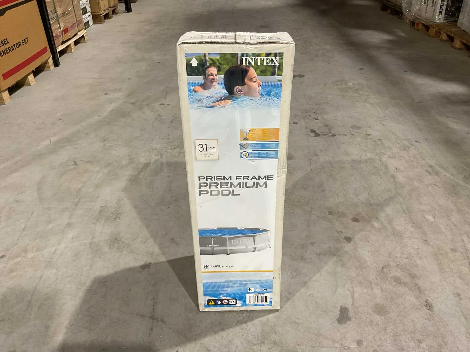 Voorzien van Opzetzwembad; 3-laags PVC met gerasterde polyester tussenlaag; Frame gepoedercoat staal; Vorm: Prism; Inhoud 4485 liter; Aanbevolen waterhoogte 61 cm; Pompaansluiting (mm) 32; Diameter (cm) 305; Hoogte (cm) 76; Dikte liner wand (mm) 0,50; Dikte liner bodem (mm) 0,32; Reparatieset; Ongebruikt in doos Merk: INTEX Model: 26700NP Prism Frame Premium Product type: 3,1m Kleur: Blauw Gewicht: 25.5kg Lengte: 35.6cm Breedte: 34cm Hoogte: 87.6cm Materiaal: Dubbelwandig PVC folie met gerasterde binnenlaag