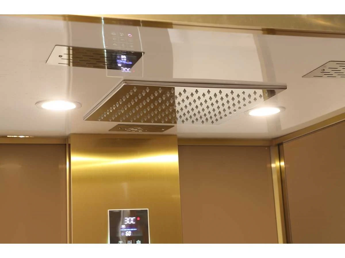 8mm veiligheidsglas, marmer bodem met PVC anti slip inleg (in stoomgedeelte) , digitaal bedieningspaneel (in zowel de sauna als het stoomcabine gedeelte), bluetooth met speakers, afvoer met flexibele waterslang, sauna deel 5 infrarood panelen totaal 3500 watt, stoomgenerator 2500 watt, totale stroom 220v 6000 watt 16a(met plug and play stekkers), 6 stuks massagejets in de achterwand verwerkt, afstandsbediening, sauna gedeelte bestaat uit hemlock hout. bankje geschikt voor 2 personen, thermometer sauna, diverse ledverlichting met kleurentherapie (7 kleuren), stoomcabine voorzien van design zitje, rvs deurgrepen (goud), aromatherapie, digitale temperatuur aanduiding, afzuiging met ventilator, ozone, waterdruk regelbaar, handdouche, planchet, verchroomd messing kraanwerk, 2 draaideuren met massieve RVS (gouden) ophangingen, regendouche in het plafond, handdouche Merk: Mawialux Model: Pico Kleur: Goud Gewicht: 400kg Lengte: 100cm Breedte: 200cm Hoogte: 200cm Materiaal: Hemlock hout en 8mm veiligheidsglas
