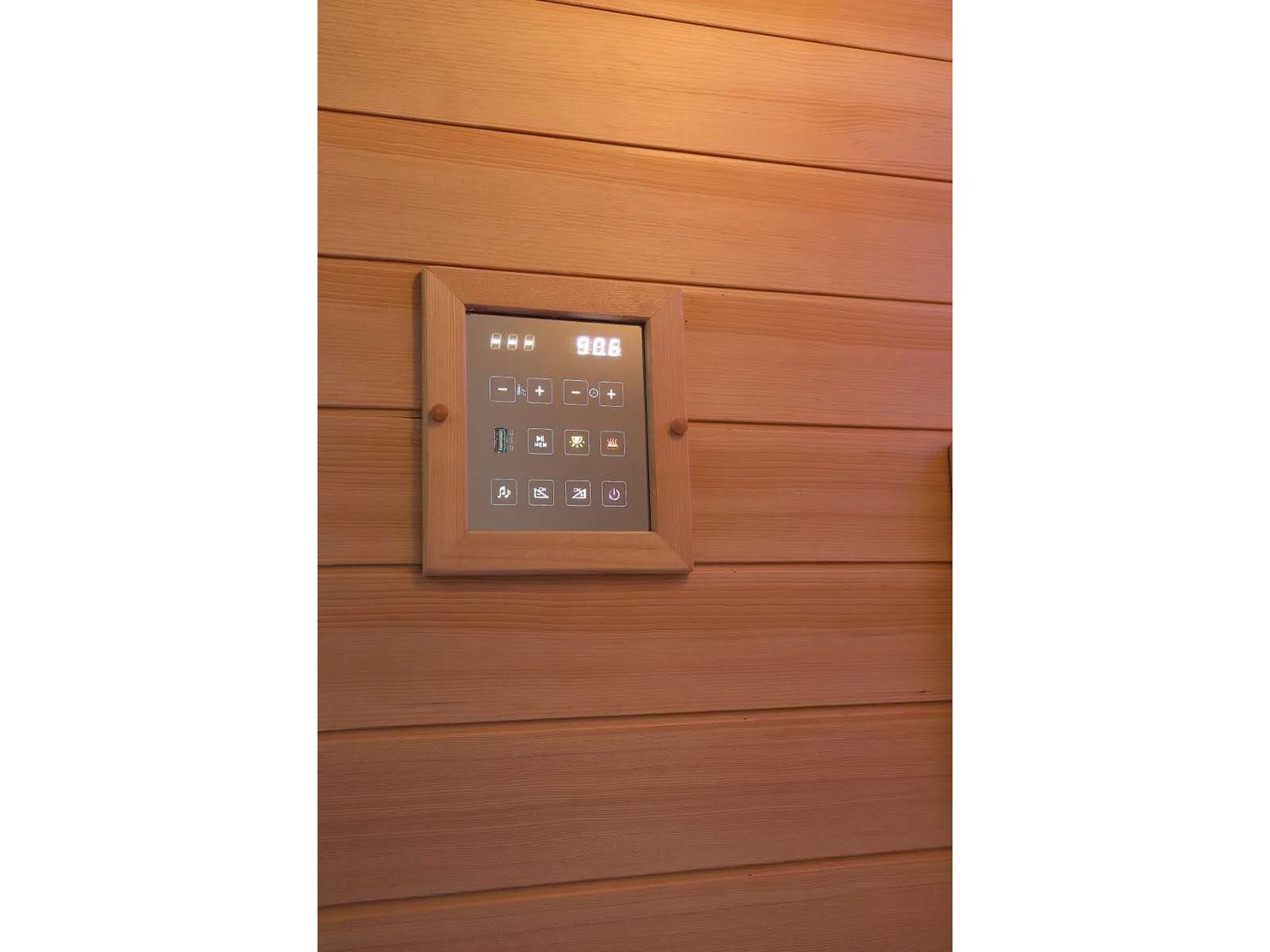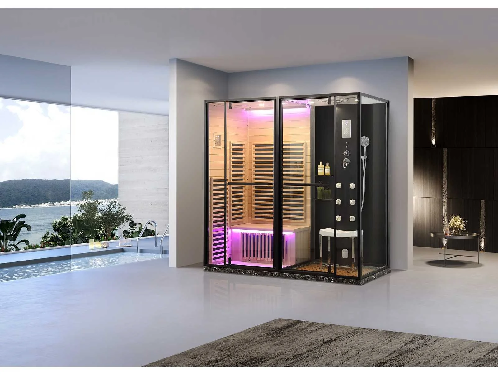 8mm veiligheidsglas, marmer bodem met PVC anti slip inleg (in stoomgedeelte) , digitaal bedieningspaneel (in zowel de sauna als het stoomcabine gedeelte), bluetooth met speakers, afvoer met flexibele waterslang, sauna deel 5 infrarood panelen totaal 3500 watt, stoomgenerator 2500 watt, totale stroom 220v 6000 watt 16a(met plug and play stekkers), 6 stuks massagejets in de achterwand verwerkt, afstandsbediening, sauna gedeelte bestaat uit hemlock hout. bankje geschikt voor 2 personen, thermometer sauna, diverse ledverlichting met kleurentherapie (7 kleuren), stoomcabine voorzien van design zitje, rvs deurgrepen (goud), aromatherapie, digitale temperatuur aanduiding, afzuiging met ventilator, ozone, waterdruk regelbaar, handdouche, planchet, verchroomd messing kraanwerk, 2 draaideuren met massieve RVS (gouden) ophangingen, regendouche in het plafond, handdouche Merk: Mawialux Model: Pico Kleur: Zwart Gewicht: 400kg Lengte: 100cm Breedte: 200cm Hoogte: 200cm Materiaal: Hemlock hout en 8mm veiligheidsglas
