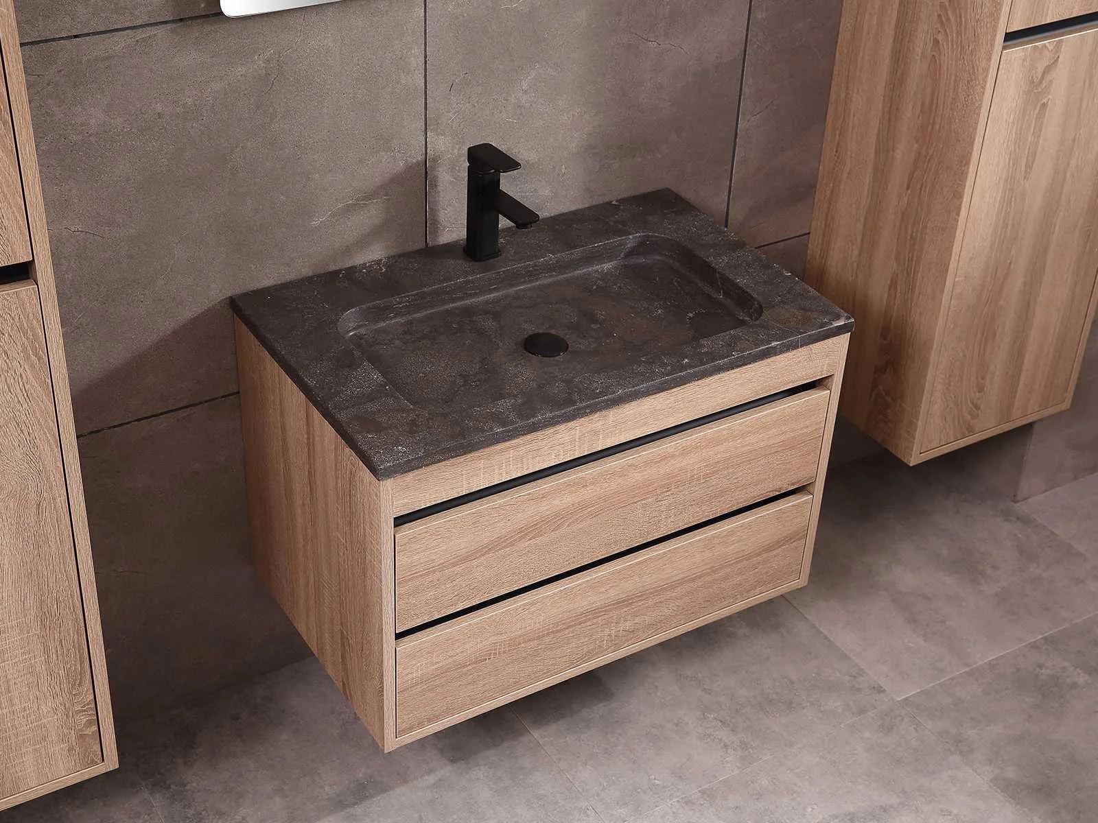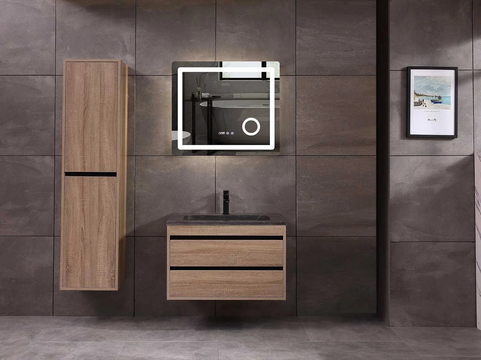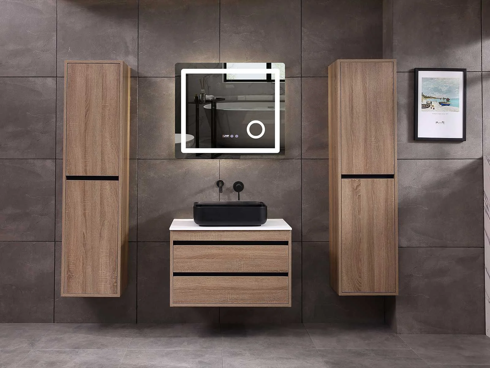 Afmeting meubel: bxdxh 80x49x50cm - hangkast 40x35x160cm, Kleur bruin eiken, Materiaal 2cm 5-laags multiplex(zeer sterk en vochtbestendig), Hangkast softclose deuren en extra planchets (hangkast is universeel en kan zowel links als rechts naast het meubel gehangen worden), Kranen exclusief, Lades 2 stuks met softclose, Wastafel natuursteen of solid surface (keuze uit diverse modellen van de laatste foto's vaste of losse wasbakken met een mat witte of mat zwarte solid surface top, vaste bakken zijn ook zonder kraangaten beschikbaar zodat u een muurkraan kunt gebruiken! Keuze graag aangeven op de afhaaldag), Spiegel ledspiegel met ledverlichting(6000K led-dioden)/vergrootglas/verwarming(anti condens)/klok met touchscreen (mag ook voor een ronde spiegel geruild worden indien gewenst of tegen een kleine meerprijs een luxure variant met display, bluetooth en speakers, neem daarvoor contact met ons op voor een passende aanbieding op info@mawialux.nl), Afvoeren exclusief , Conditie: Nieuw in doos, Bijzonderheden 2 jaar garantie, compleet met installatiekit, mat zwarte aluminium grepen achter de inkepingen van de lades en deuren, natuursteen wastafel is behandeld met coating, zeer hoge kwaliteit, Extra's de hangkast mag geruild worden voor een kraan en afvoerset naar keus(graag aangeven op de afhaaldag) of als u een extra hangkast nodig heeft kunt u ons ook mailen voor een passende aanbieding Merk: mawialux Hoogte: 50cm Lengte: 49cm Breedte: 80cm Materiaal: 2cm 5-laags multiplex(zeer sterk en vochtbestendig) Kleur: bruin eiken Spiegel met verlichting: ja Lades: 2