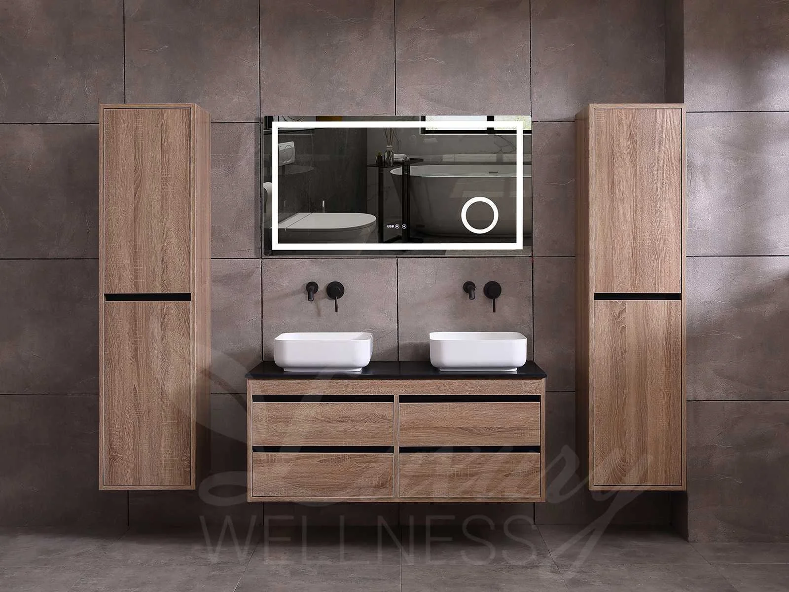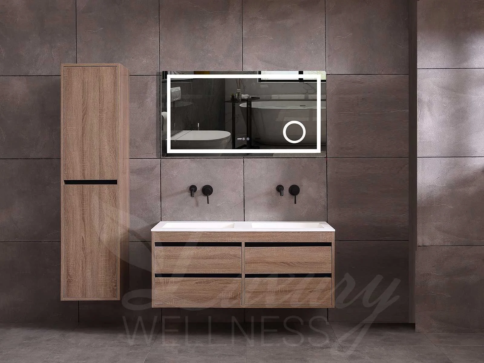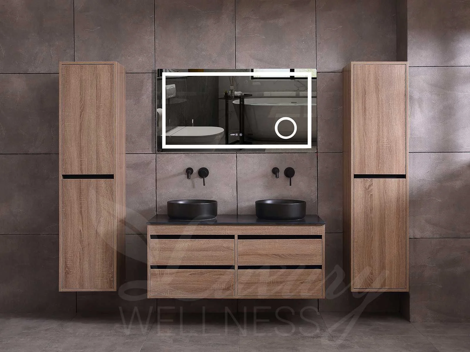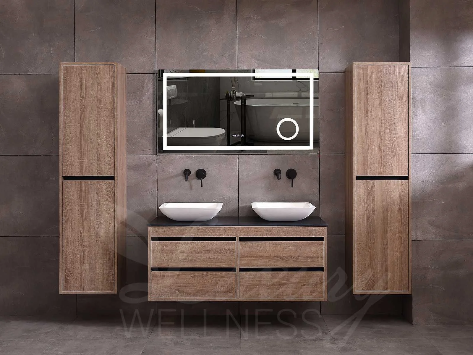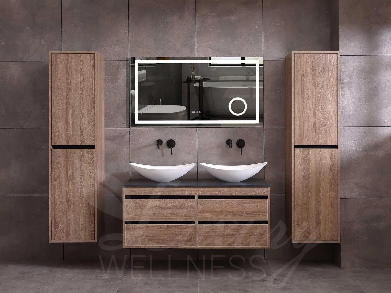 Afmeting meubel: bxdxh 120x49x50cm - hangkast 40x35x160cm, Kleur bruin eiken, Materiaal 2cm 5-laags multiplex(zeer sterk en vochtbestendig), Hangkast softclose deuren en extra planchets (hangkast is universeel en kan zowel links als rechts naast het meubel gehangen worden), Kranen exclusief , Lades 4 stuks met softclose, Wastafel natuursteen of solid surface (keuze uit diverse modellen van de laatste foto's vaste of losse wasbakken met een mat witte of mat zwarte solid surface top, vaste bakken zijn ook zonder kraangaten beschikbaar zodat u muurkranen kunt gebruiken! Keuze graag aangeven op de afhaaldag), Spiegel ledspiegel met ledverlichting(6000K led-dioden)/vergrootglas/verwarming(anti condens)/klok met touchscreen (mag ook voor een 80 of 100cm ronde spiegel geruild worden indien gewenst of tegen een kleine meerprijs een luxure variant met display, bluetooth en speakers, neem daarvoor contact met ons op voor een passende aanbieding op info@mawialux.nl), Afvoeren exclusief , Conditie: Nieuw in doos, Bijzonderheden 2 jaar garantie, compleet met installatiekit, mat zwarte aluminium grepen achter de inkepingen van de lades en deuren, natuursteen wastafel is behandeld met coating, zeer hoge kwaliteit, Extra's de hangkast mag geruild worden voor een set kranen en popup afvoeren naar keus(graag aangeven op de afhaaldag) of als u een extra hangkast nodig heeft kunt u ons ook mailen voor een passende aanbieding Merk: mawialux Hoogte: 50cm Lengte: 49cm Breedte: 120cm Materiaal: 2cm 5-laags multiplex(zeer sterk en vochtbestendig) Kleur: bruin eiken Spiegel met verlichting: ja Lades: 4