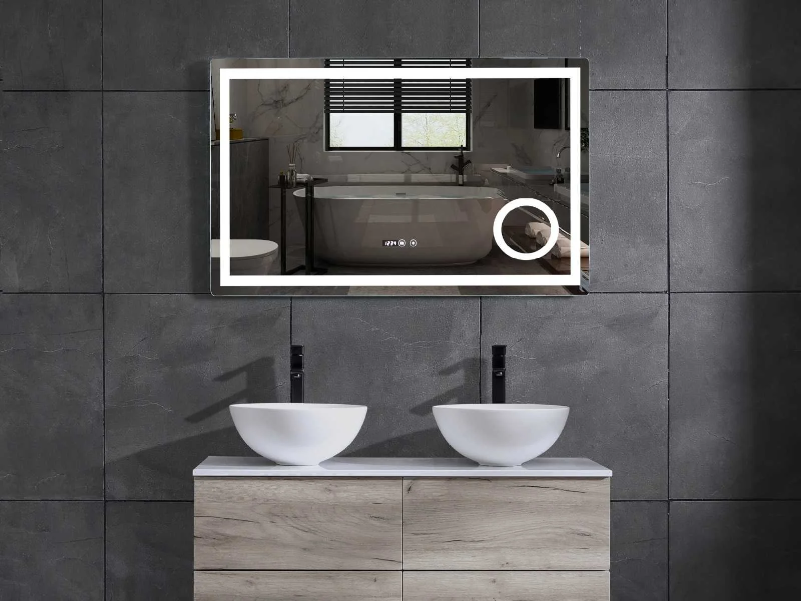 Keuze uit 2 kleuren wasbak: een mat witte of mat zwarte acryl bak met of zonder kraangat(keuze kleur graag doorgeven op de afhaaldag), materiaal 5-laags multiplex(zeer sterk en vochtbestendig), kranen exclusief , Lades 2 stuks met softclose, wasbak van acryl, spiegel met verwarming, klok en vergrootglas met ledverlichting rondom aan voorkant met 3 verstelbare kleuren led 3000/4500/6000k led-dioden (geel/blauw/wit licht) met de volgende opties: digitaal display, geïntegreerde vergrotingsspiegel van 10cm doorsnede met ledverlichting(vergroot 3x), digitale klok, digitale temperatuur aanduiding, 220volt stekker(plug and play), verwarming ter voorkoming van condens, 1.5mm kopervrij met explosion-proof laag met dezelfde functie als gehard glas, afvoeren exclusief, Conditie: Nieuw in doos, Bijzonderheden: 2 jaar garantie, wasbak is met en zonder kraangaten mogelijk), compleet met installatie materiaal, zeer hoge kwaliteit, Let op: er mag ook voor een andere spiegel gekozen worden indien gewenst Merk: Mawialux Model: Jane Hoogte: 50cm Lengte: 46cm Breedte: 100cm Materiaal: 5-laag multiplex + acryl Kleur: mat zwart Kraan: exclusief Wastafel: Mat wit of mat zwart (acryl) Spiegel met verlichting: ja Verlichting: ja Lades: 2 Softclose: true Bevestigingsmateriaal: true Zijkast: nee