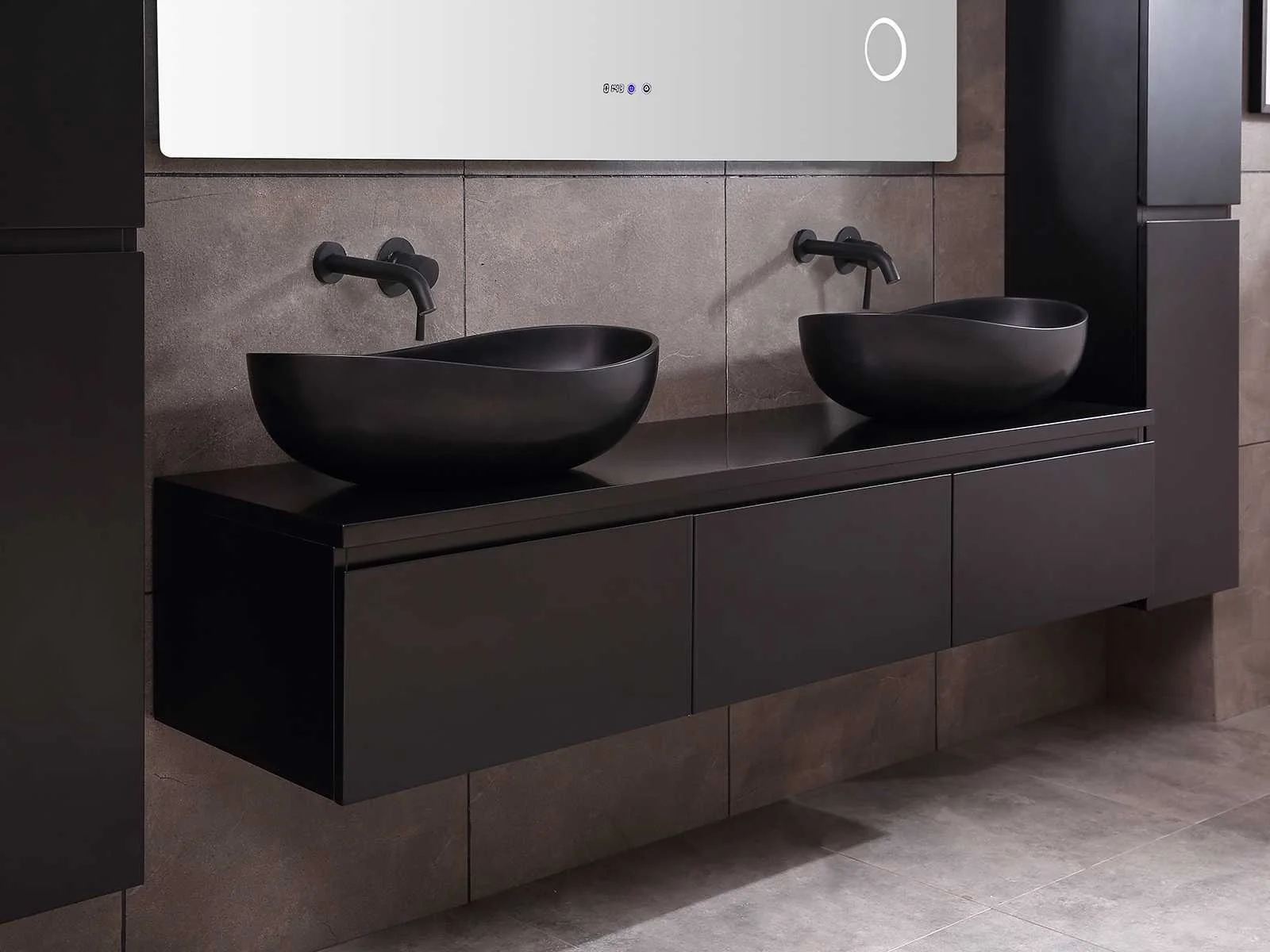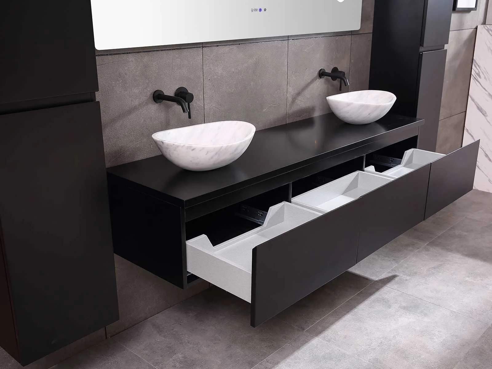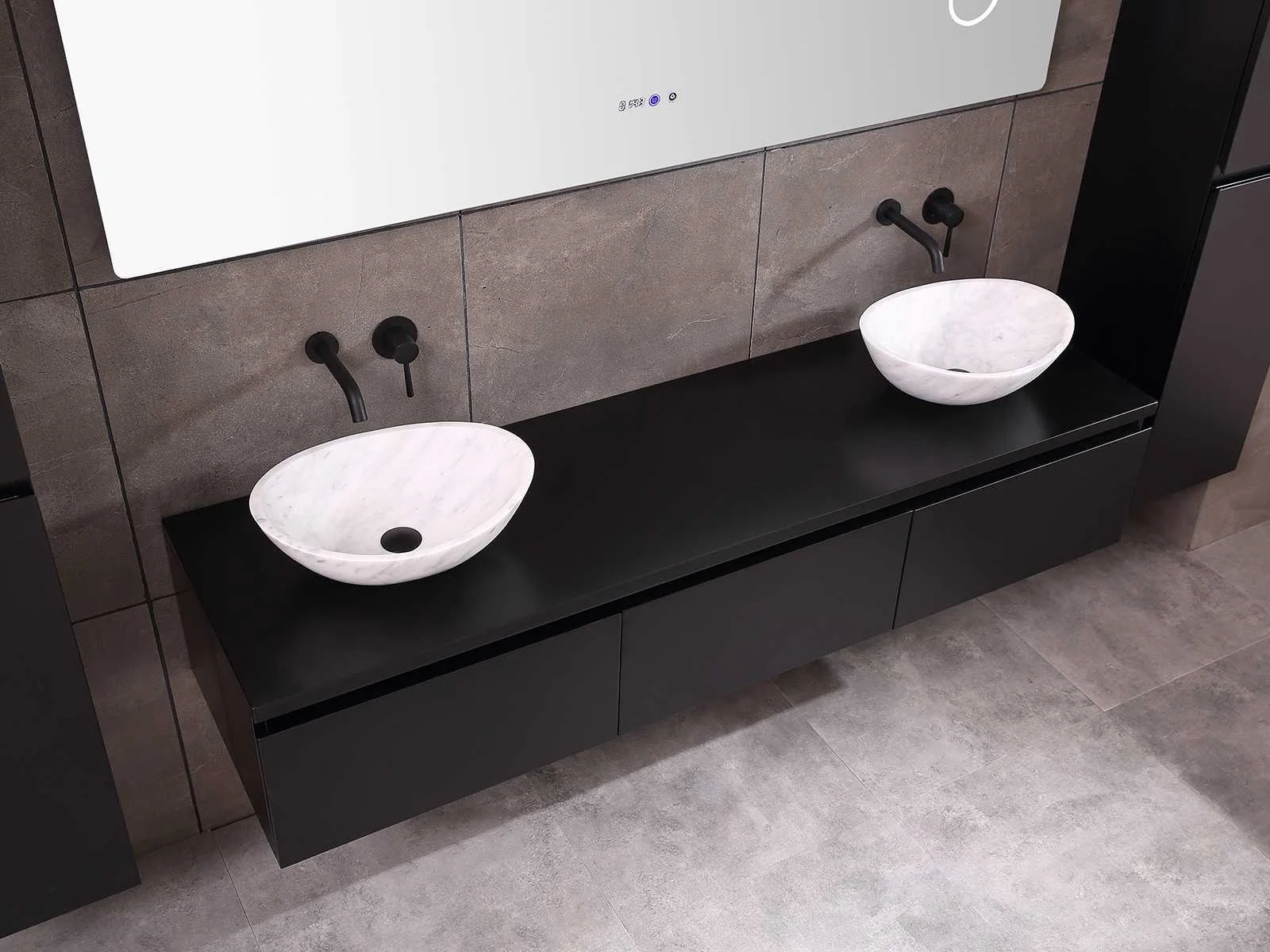 Afmeting meubel bxdxh 150/180x50x35cm (keuze breedte 150 of 180cm graag doorgeven op de afhaaldag - hangkast 35x35x160cm (wordt met 1 hangkast geleverd), kleur mat zwart, materiaal 5-laags multiplex met 3cm eiken top(zeer sterk en vochtbestendig), Hangkast softclose deuren en extra planchets (hangkast kan zowel links als rechts van het meubel worden gehangen), kranen exclusief , Lades 3 stuks met softclose, Wasbakken solid surface, natuursteen of italiaans marmer (keuze uit diverse modellen van de laatste 3 foto's, graag keuze doormailen op info@mawialux.nl), spiegel met verwarming/bluetooth/radio/klok en vergrootglas met ledverlichting rondom aan de achterkant met 3 verstelbare kleuren led 3000/4500/6000k led-dioden (geel/blauw/wit licht) met de volgende opties: digitaal display, geïntegreerde vergrotingsspiegel van 10cm doorsnede met ledverlichting(vergroot 3x), bluetooth met speaker, digitale klok, digitale temperatuur aanduiding, 220volt stekker(plug and play), verwarming ter voorkoming van condens, 1.5mm kopervrij met explosion-proof laag met dezelfde functie als gehard glas , afvoeren exclusief, Conditie: Nieuw in doos, Bijzonderheden 2 jaar garantie, gaten zijn niet in het topblad voorgeboord zodat u zowel muurkranen als kranen vanaf het blad kunt gebruiken of zelf 1 wastafel in plaats van 2 stuks(gaten boren door een installateur is zelf gemakkelijk uit te voeren), compleet met installatie materiaal, zeer hoge kwaliteit, let op! de hangkast mag geruild worden voor een set kranen en popup afvoeren naar keus of als u een extra hangkast nodig graag op de afhaaldag aangeven voor een passende aanbieding Merk: Mawialux Model: Jeremy Hoogte: 35cm Lengte: 50cm Breedte: 150-180cm Materiaal: 5-laags multiplex met 3cm massief top(zeer sterk en vochtbestendig) Kleur: mat zwart Kraan: exclusief Waskom: Diverse keuzes Spiegel met verlichting: ja Verlichting: ja Onderkast: ja Lades: 3 Softclose: true Bevestigingsmateriaal: true Zijkast: ja 1x
