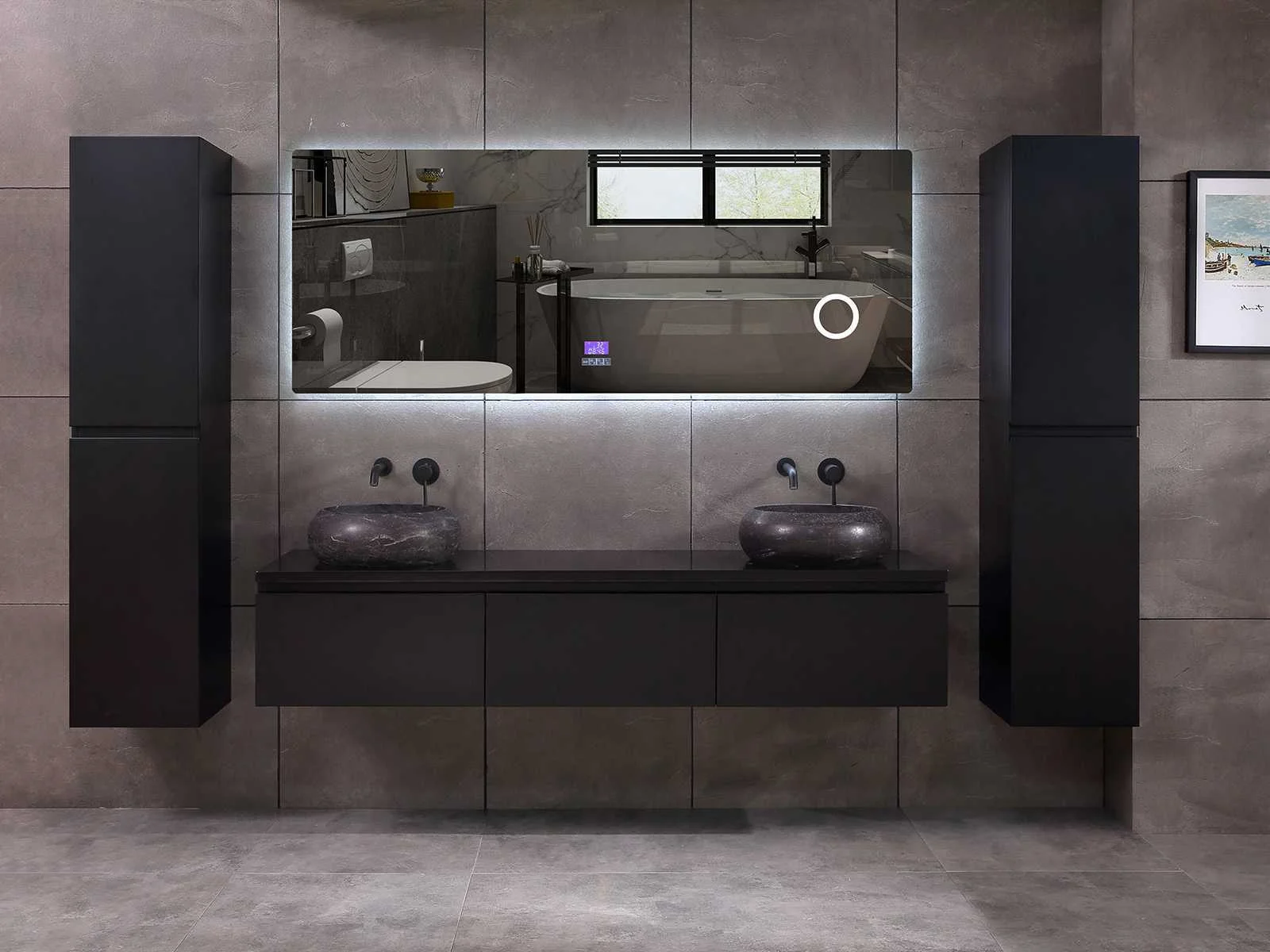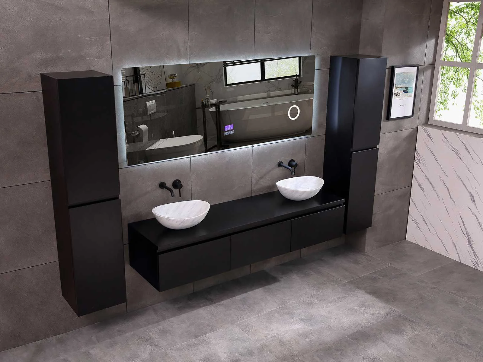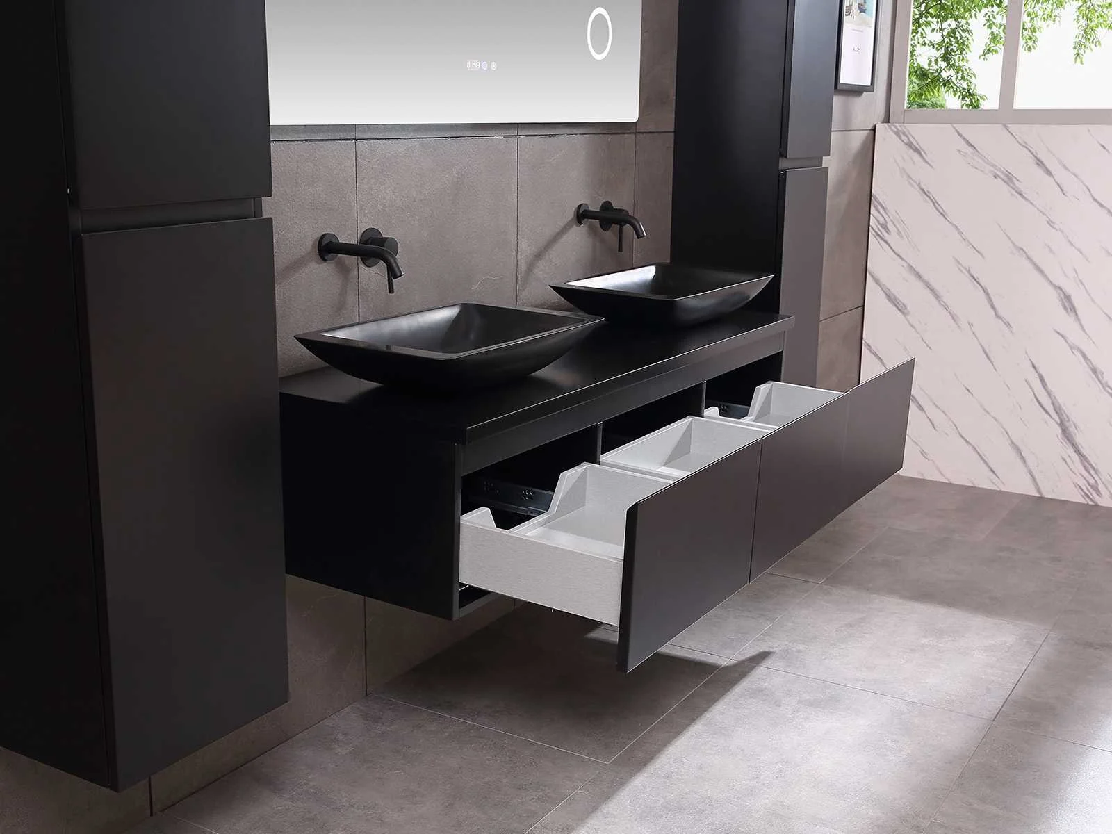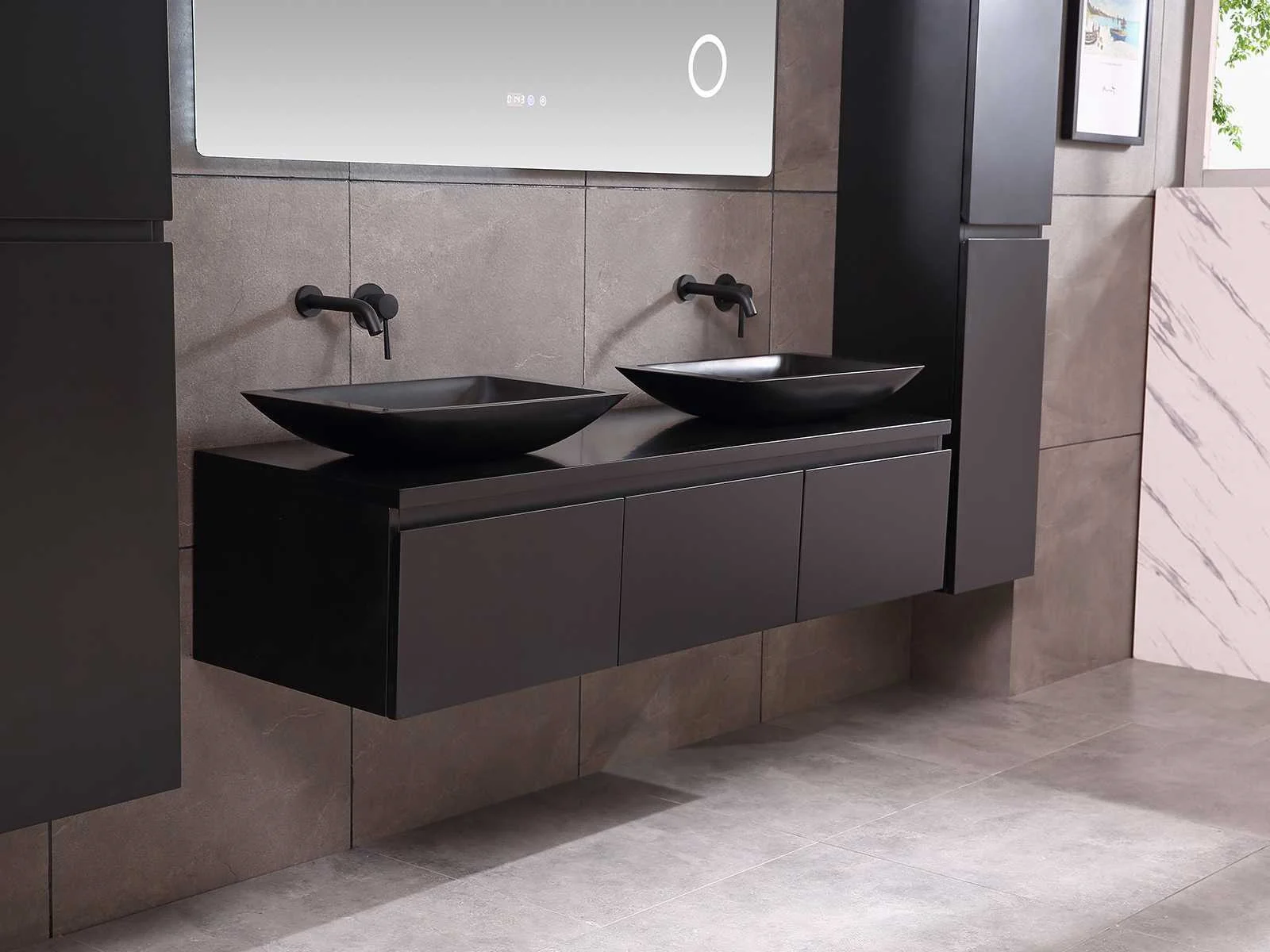 Afmeting meubel bxdxh 150/180x50x35cm (keuze breedte 150 of 180cm graag doorgeven op de afhaaldag - hangkast 35x35x160cm (wordt met 1 hangkast geleverd), kleur mat zwart, materiaal 5-laags multiplex met 3cm eiken top(zeer sterk en vochtbestendig), Hangkast softclose deuren en extra planchets (hangkast kan zowel links als rechts van het meubel worden gehangen), kranen exclusief , Lades 3 stuks met softclose, Wasbakken solid surface, natuursteen of italiaans marmer (keuze uit diverse modellen van de laatste 3 foto's, graag keuze doormailen op info@mawialux.nl), spiegel met verwarming/bluetooth/radio/klok en vergrootglas met ledverlichting rondom aan de achterkant met 3 verstelbare kleuren led 3000/4500/6000k led-dioden (geel/blauw/wit licht) met de volgende opties: digitaal display, geïntegreerde vergrotingsspiegel van 10cm doorsnede met ledverlichting(vergroot 3x), bluetooth met speaker, digitale klok, digitale temperatuur aanduiding, 220volt stekker(plug and play), verwarming ter voorkoming van condens, 1.5mm kopervrij met explosion-proof laag met dezelfde functie als gehard glas , afvoeren exclusief, Conditie: Nieuw in doos, Bijzonderheden 2 jaar garantie, gaten zijn niet in het topblad voorgeboord zodat u zowel muurkranen als kranen vanaf het blad kunt gebruiken of zelf 1 wastafel in plaats van 2 stuks(gaten boren door een installateur is zelf gemakkelijk uit te voeren), compleet met installatie materiaal, zeer hoge kwaliteit, let op! de hangkast mag geruild worden voor een set kranen en popup afvoeren naar keus of als u een extra hangkast nodig graag op de afhaaldag aangeven voor een passende aanbieding Merk: Mawialux Model: Jeremy Hoogte: 35cm Lengte: 50cm Breedte: 150-180cm Materiaal: 5-laags multiplex met 3cm massief top(zeer sterk en vochtbestendig) Kleur: mat zwart Kraan: exclusief Waskom: Diverse keuzes Spiegel met verlichting: ja Verlichting: ja Onderkast: ja Lades: 3 Softclose: true Bevestigingsmateriaal: true Zijkast: ja 1x