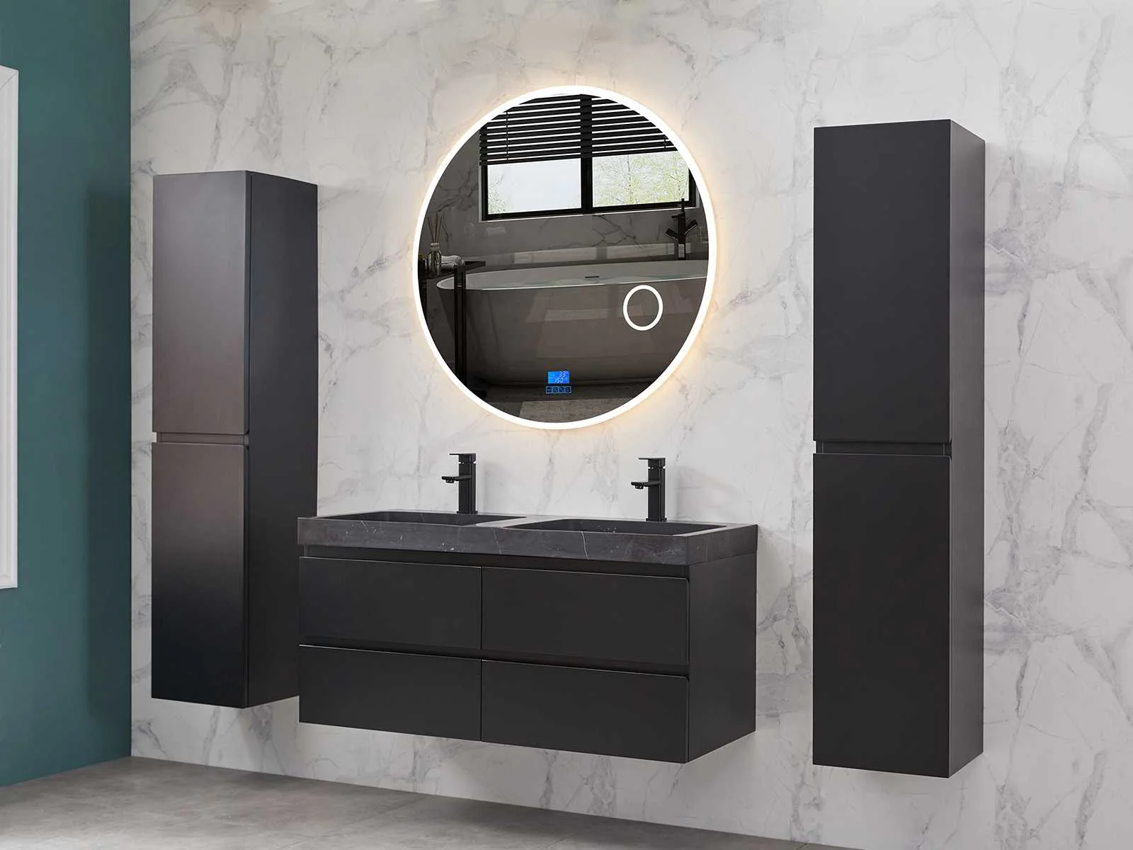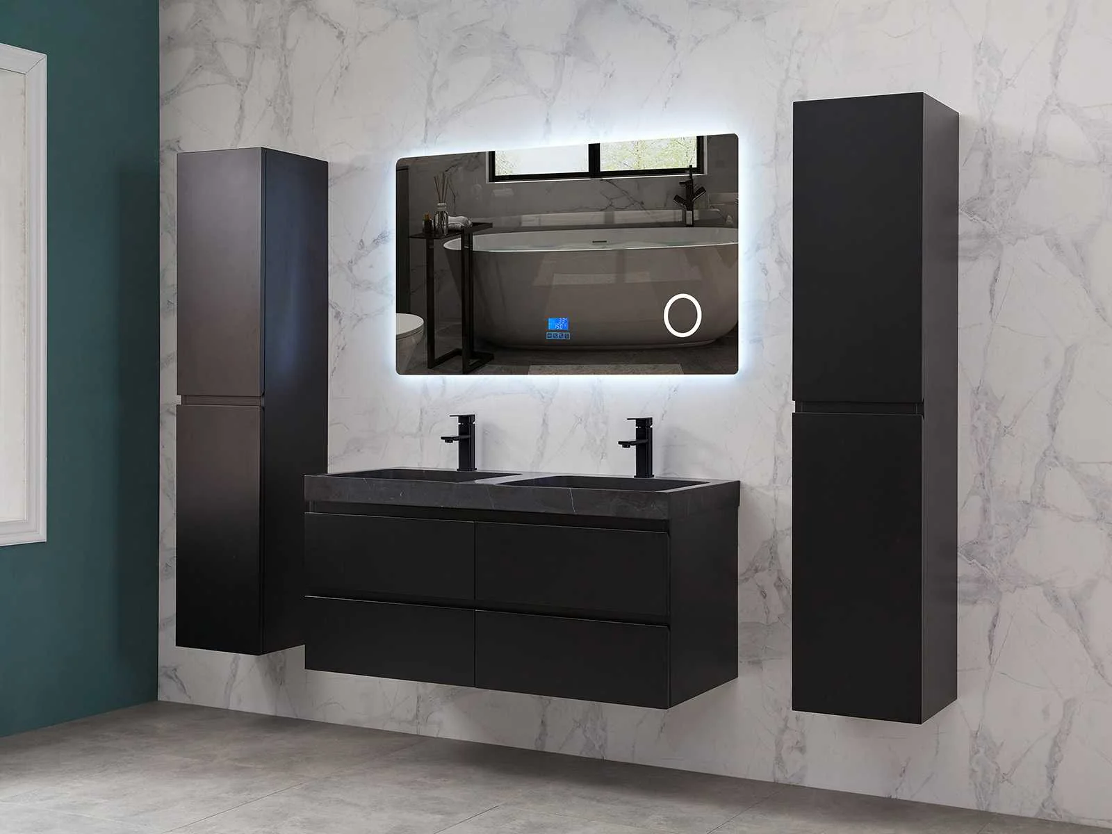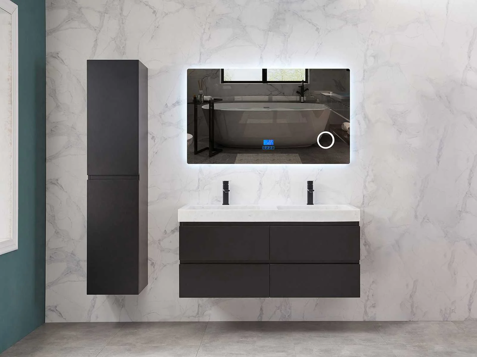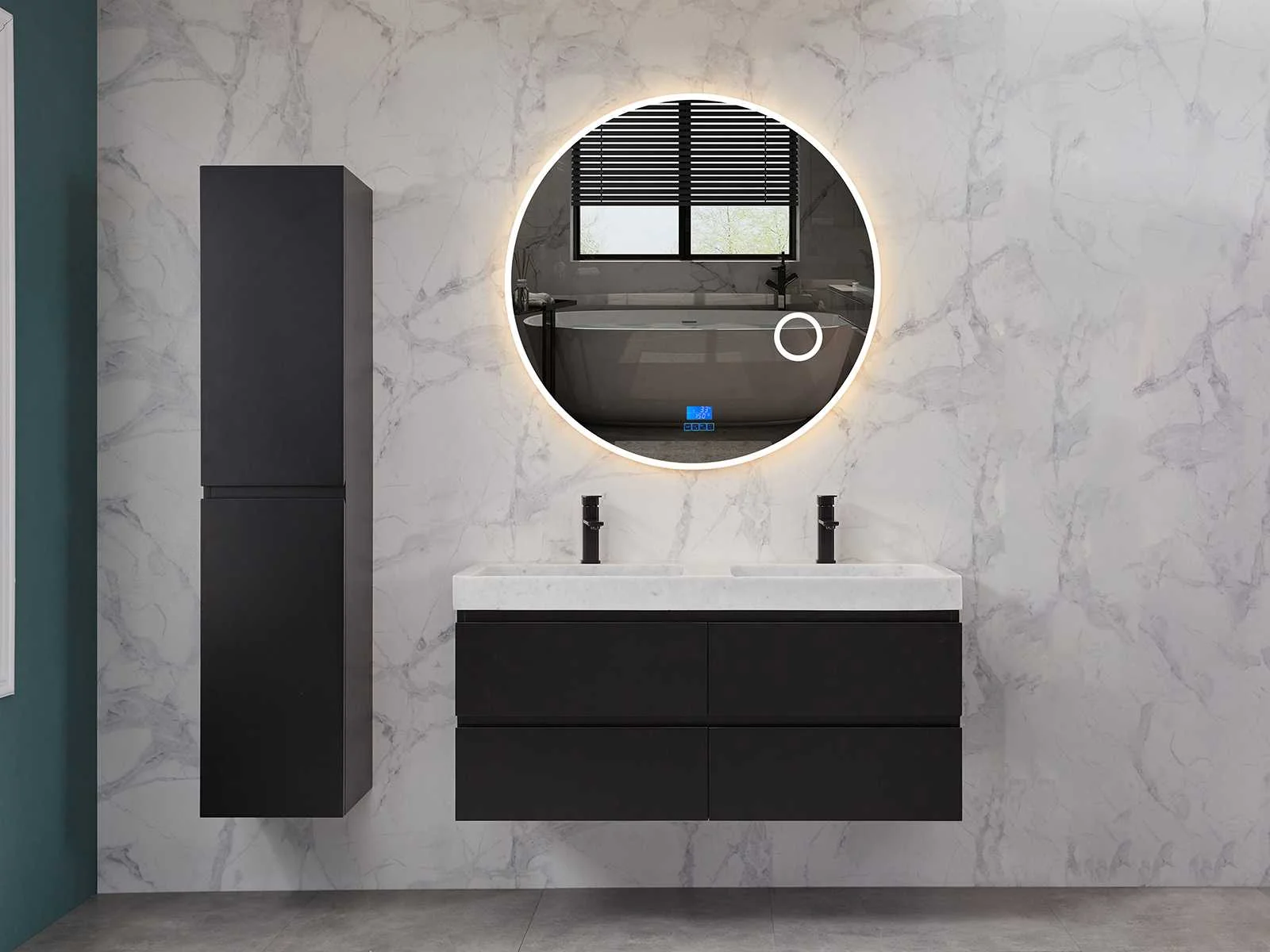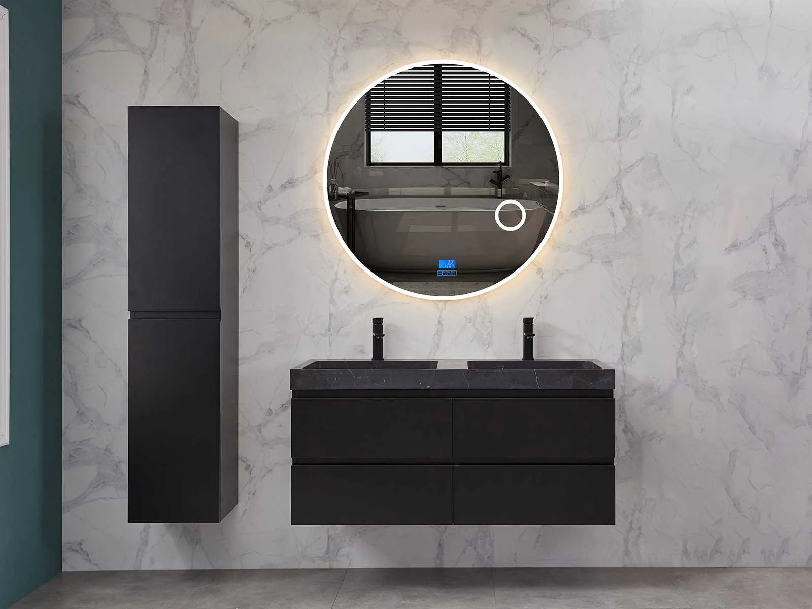 Afmeting meubel: bxdxh 120x49x50cm - hangkast 35x35x160cm, Materiaal 2cm 5-laags multiplex(zeer sterk en vochtbestendig), Hangkast softclose deuren en extra planchets (hangkast is universeel en kan zowel links als rechts naast het meubel gehangen worden), Kranen exclusief , Lades 4 stuks met softclose, Wastafel natuursteen of solid surface (keuze uit diverse modellen van de laatste foto's vaste of losse wasbakken met een mat witte of mat zwarte solid surface top, vaste bakken zijn ook zonder kraangaten beschikbaar zodat u muurkranen kunt gebruiken! Keuze graag aangeven op de afhaaldag), verwarming, bediening one-touch (voor heater, verlichting, bluetooth en instellingen), Verlichting aan de achterkant met met 3 verstelbare en dimbare kleuren LED 3000/4500/6000K LED-dioden (geel/blauw/wit licht), voorzien van digitaal display, geïntegreerde vergrotings spiegel van 10cm doorsnede met ledverlichting(vergroot 3x), bluetooth met speaker, digitale klok, digitale temperatuur aanduiding, 220volt stekker(plug and play), glas 1.5mm kopervrij met explosion-proof laag (mag uit diverse modellen gekozen worden welke in de afbeeldingen zijn afgebeeld, keuze graag aangeven op de afhaaldag), Afvoeren exclusief , Conditie: Nieuw in doos, Bijzonderheden 2 jaar garantie, compleet met installatiekit, mat zwarte aluminium grepen achter de inkepingen van de lades en deuren, natuursteen wastafel is behandeld met coating, zeer hoge kwaliteit, Extra's de hangkast mag geruild worden voor een set kranen en popup afvoeren naar keus(graag aangeven op de afhaaldag) Merk: Mawialux Breedte: 120cm Kleur: mat zwart Kraan: nee Wastafel: ja Waskom: ja Spiegel met verlichting: ja Onderkast: ja Lades: 4 Softclose: true Zijkast: ja Afmeting hangkast: 160x30x35