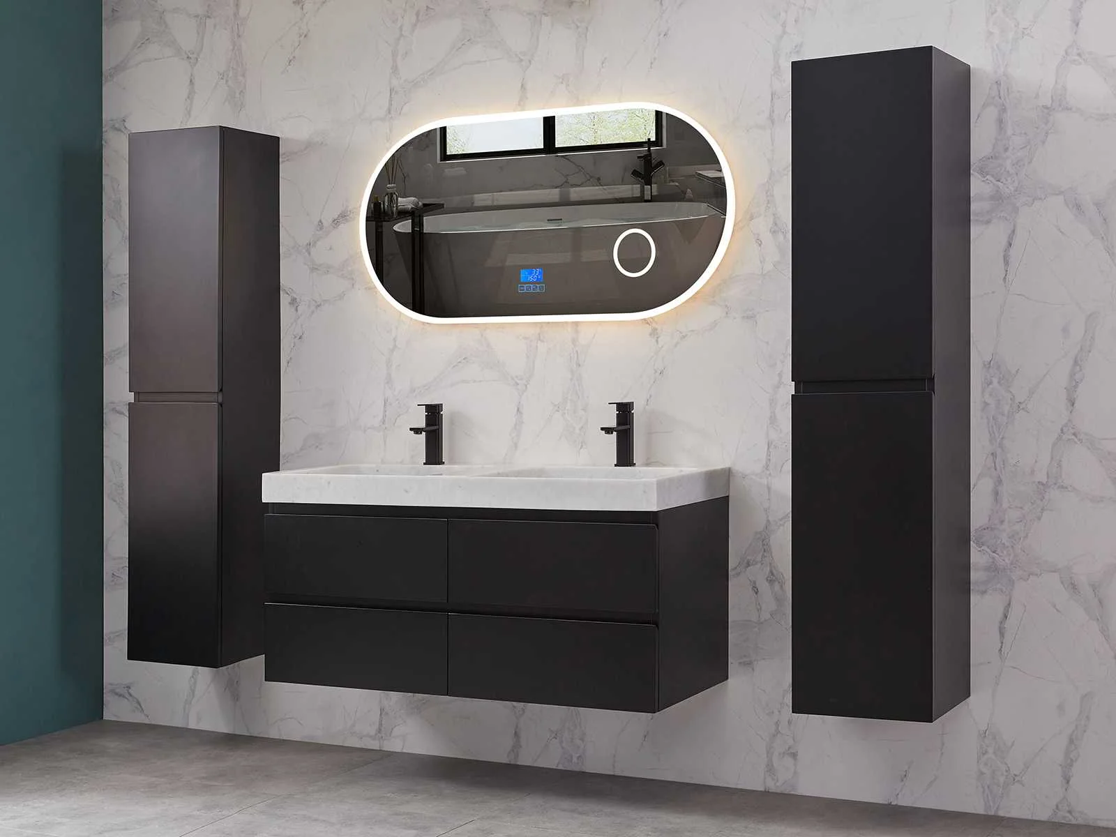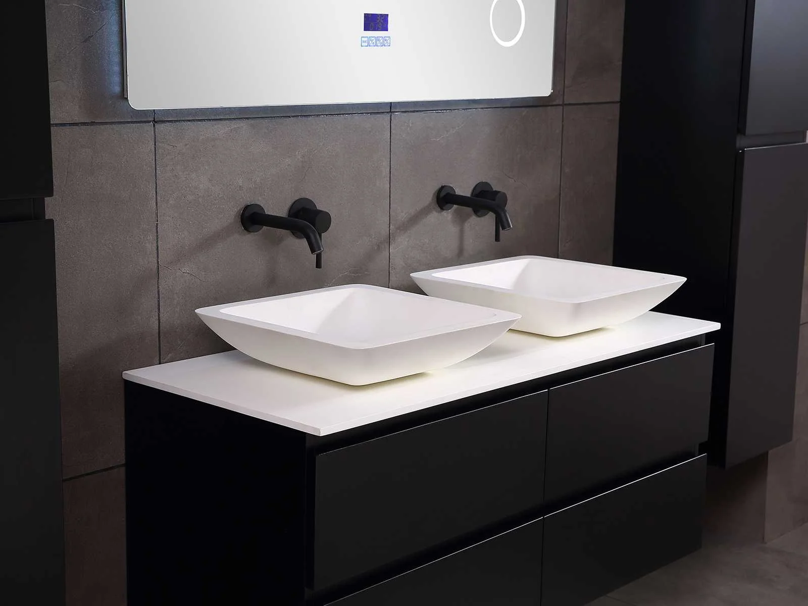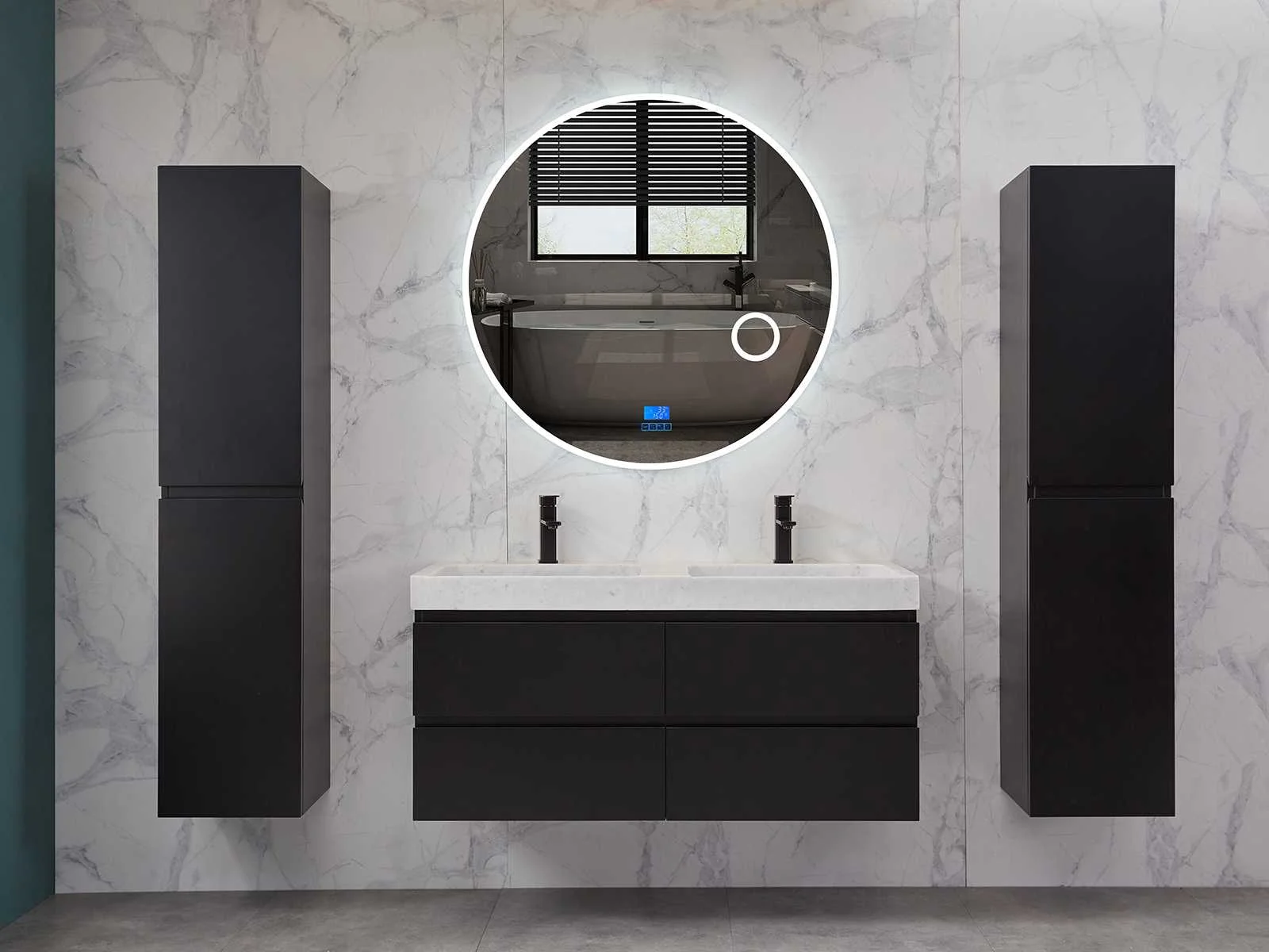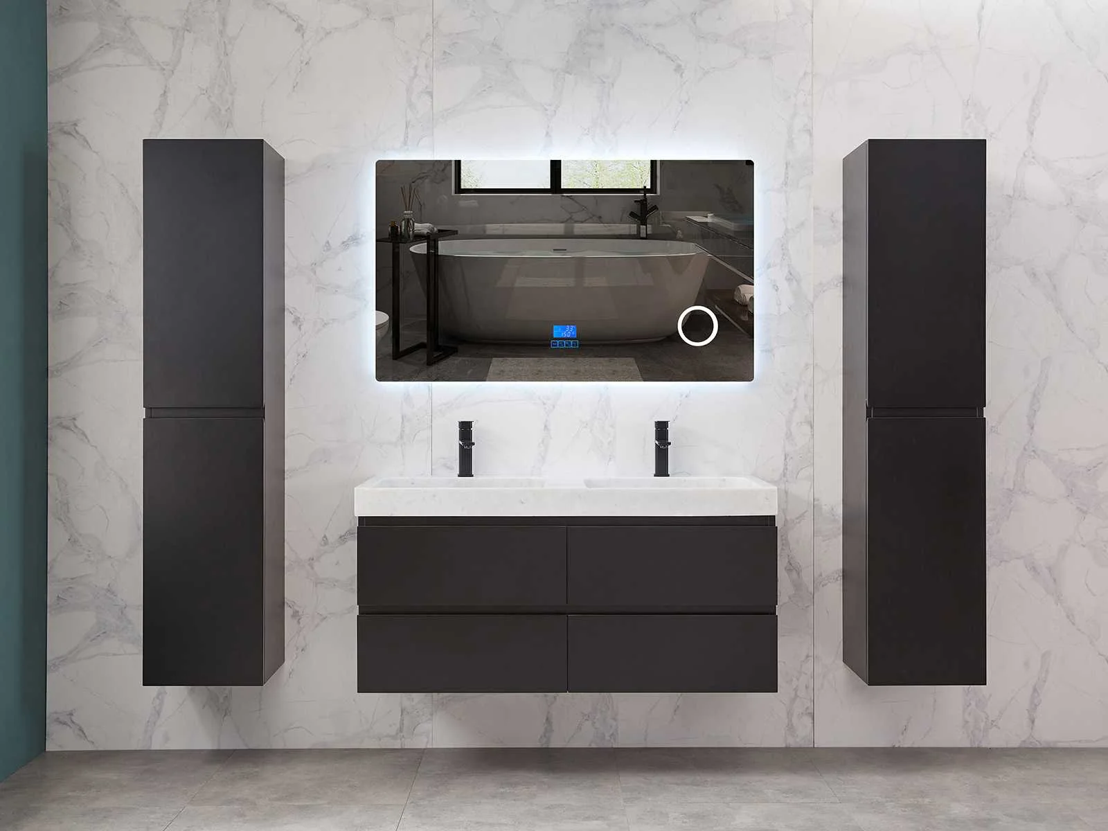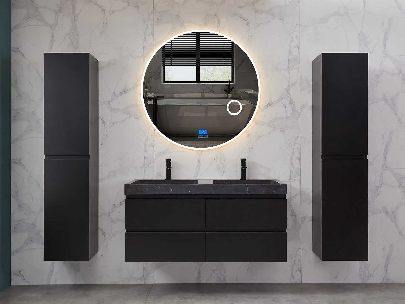 Afmeting meubel: bxdxh 120x49x50cm - hangkast 35x35x160cm, Materiaal 2cm 5-laags multiplex(zeer sterk en vochtbestendig), Hangkast softclose deuren en extra planchets (hangkast is universeel en kan zowel links als rechts naast het meubel gehangen worden), Kranen exclusief , Lades 4 stuks met softclose, Wastafel natuursteen of solid surface (keuze uit diverse modellen van de laatste foto's vaste of losse wasbakken met een mat witte of mat zwarte solid surface top, vaste bakken zijn ook zonder kraangaten beschikbaar zodat u muurkranen kunt gebruiken! Keuze graag aangeven op de afhaaldag), verwarming, bediening one-touch (voor heater, verlichting, bluetooth en instellingen), Verlichting aan de achterkant met met 3 verstelbare en dimbare kleuren LED 3000/4500/6000K LED-dioden (geel/blauw/wit licht), voorzien van digitaal display, geïntegreerde vergrotings spiegel van 10cm doorsnede met ledverlichting(vergroot 3x), bluetooth met speaker, digitale klok, digitale temperatuur aanduiding, 220volt stekker(plug and play), glas 1.5mm kopervrij met explosion-proof laag (mag uit diverse modellen gekozen worden welke in de afbeeldingen zijn afgebeeld, keuze graag aangeven op de afhaaldag), Afvoeren exclusief , Conditie: Nieuw in doos, Bijzonderheden 2 jaar garantie, compleet met installatiekit, mat zwarte aluminium grepen achter de inkepingen van de lades en deuren, natuursteen wastafel is behandeld met coating, zeer hoge kwaliteit, Extra's de hangkast mag geruild worden voor een set kranen en popup afvoeren naar keus(graag aangeven op de afhaaldag) Merk: Mawialux Breedte: 120cm Kleur: mat zwart Kraan: nee Wastafel: ja Waskom: ja Spiegel met verlichting: ja Onderkast: ja Lades: 4 Softclose: true Zijkast: ja Afmeting hangkast: 160x30x35