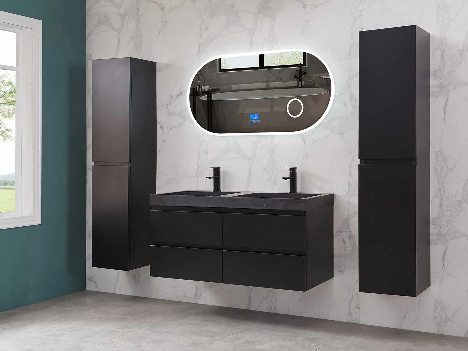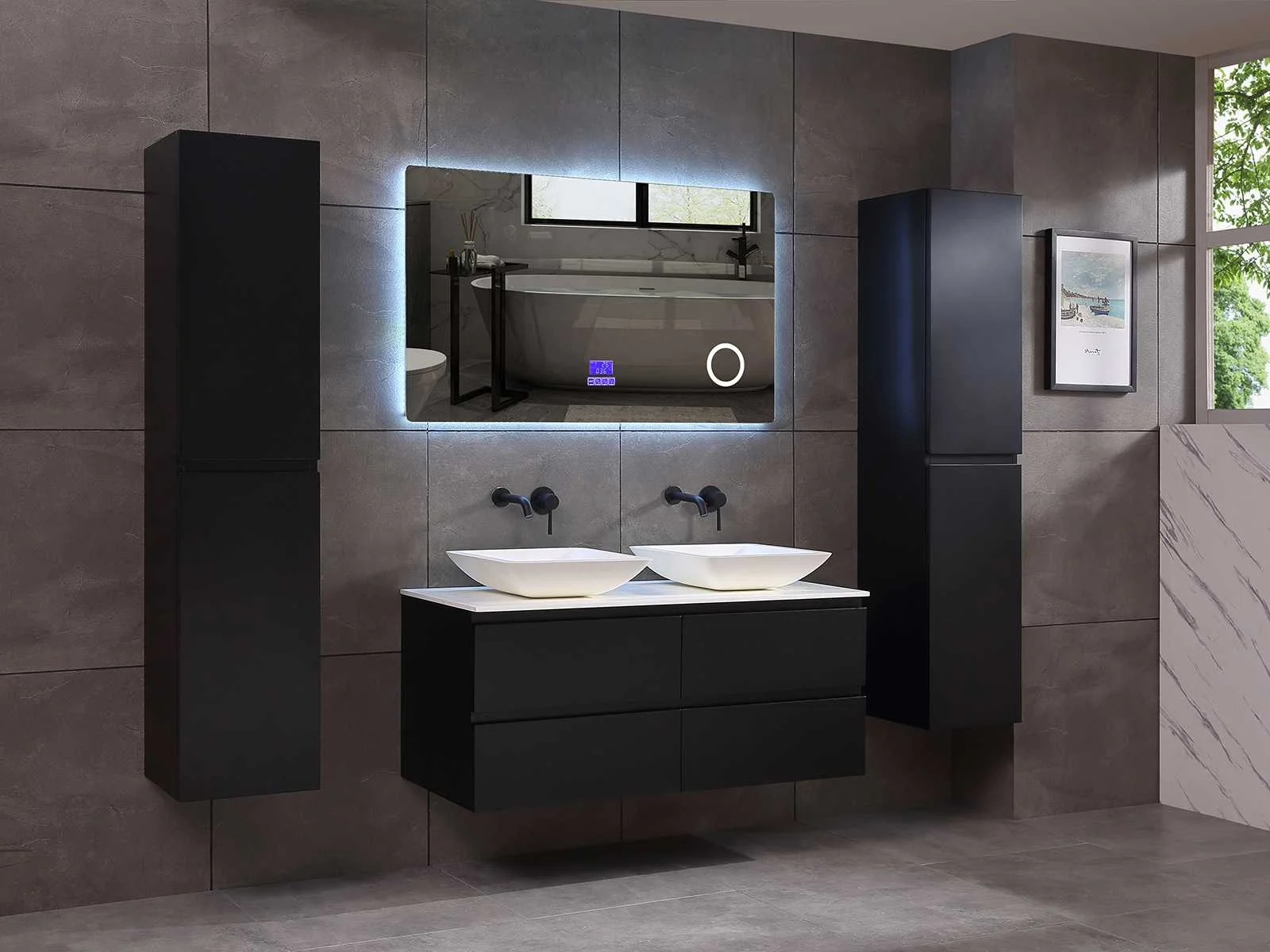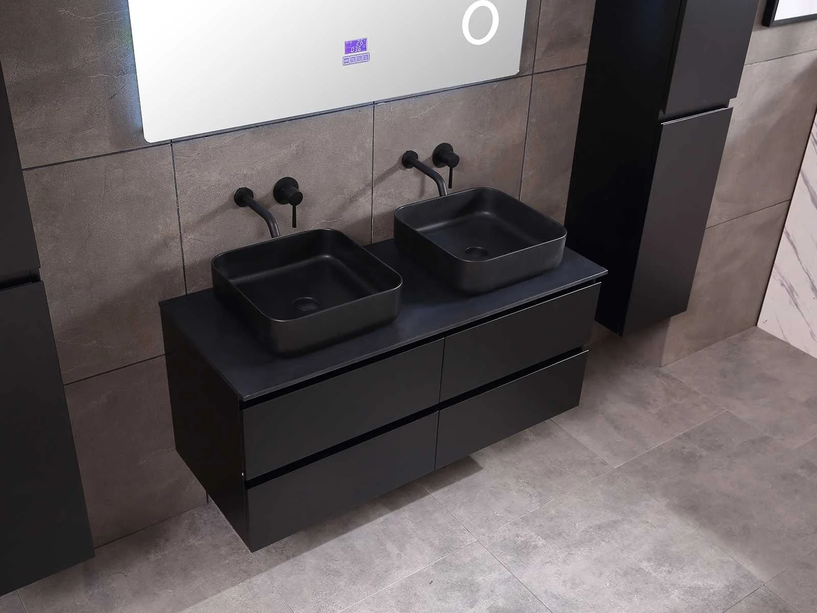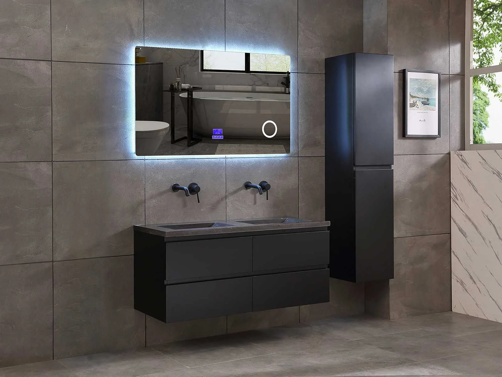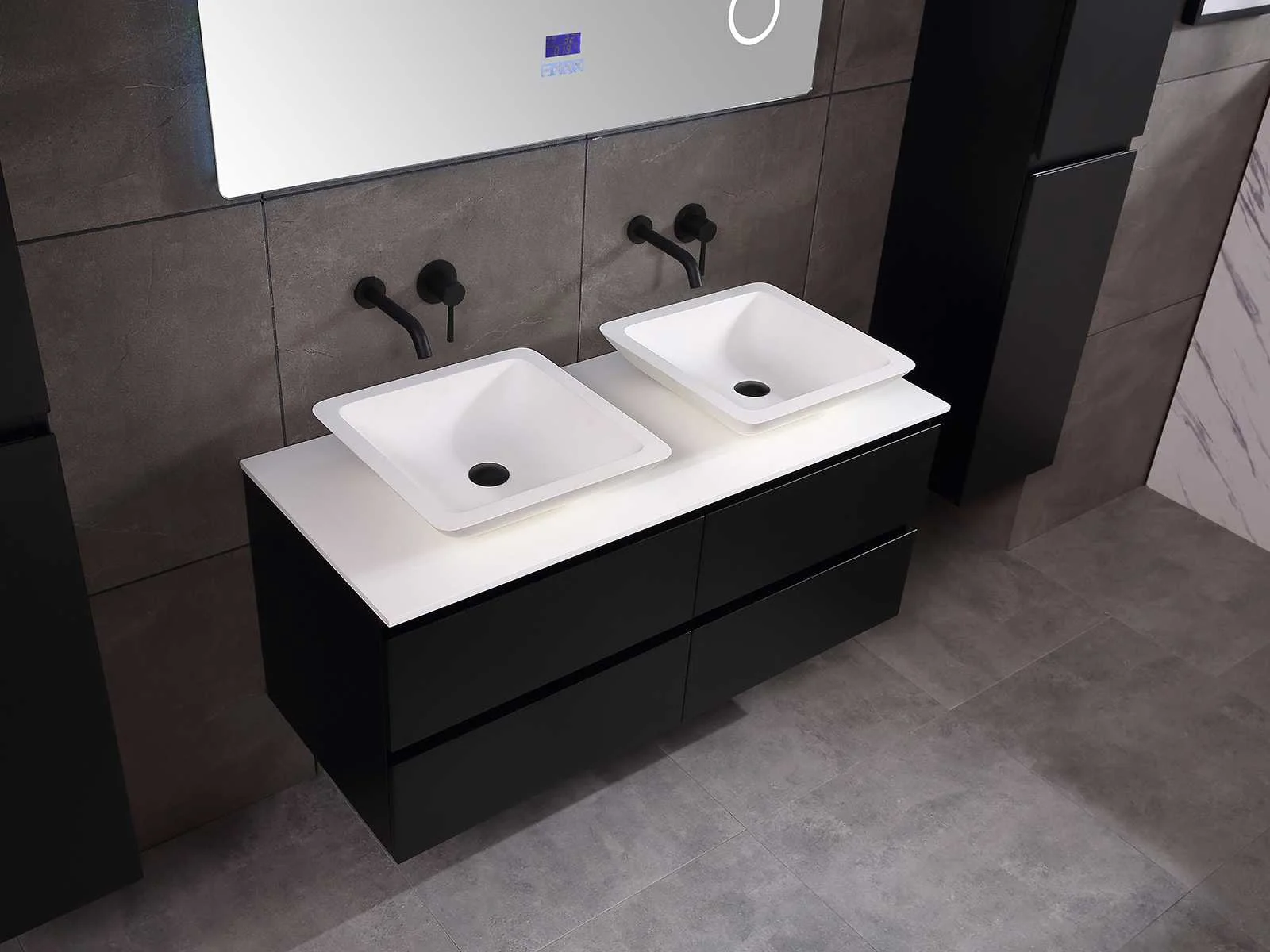 Afmeting meubel: bxdxh 120x49x50cm - hangkast 35x35x160cm, Materiaal 2cm 5-laags multiplex(zeer sterk en vochtbestendig), Hangkast softclose deuren en extra planchets (hangkast is universeel en kan zowel links als rechts naast het meubel gehangen worden), Kranen exclusief , Lades 4 stuks met softclose, Wastafel natuursteen of solid surface (keuze uit diverse modellen van de laatste foto's vaste of losse wasbakken met een mat witte of mat zwarte solid surface top, vaste bakken zijn ook zonder kraangaten beschikbaar zodat u muurkranen kunt gebruiken! Keuze graag aangeven op de afhaaldag), verwarming, bediening one-touch (voor heater, verlichting, bluetooth en instellingen), Verlichting aan de achterkant met met 3 verstelbare en dimbare kleuren LED 3000/4500/6000K LED-dioden (geel/blauw/wit licht), voorzien van digitaal display, geïntegreerde vergrotings spiegel van 10cm doorsnede met ledverlichting(vergroot 3x), bluetooth met speaker, digitale klok, digitale temperatuur aanduiding, 220volt stekker(plug and play), glas 1.5mm kopervrij met explosion-proof laag (mag uit diverse modellen gekozen worden welke in de afbeeldingen zijn afgebeeld, keuze graag aangeven op de afhaaldag), Afvoeren exclusief , Conditie: Nieuw in doos, Bijzonderheden 2 jaar garantie, compleet met installatiekit, mat zwarte aluminium grepen achter de inkepingen van de lades en deuren, natuursteen wastafel is behandeld met coating, zeer hoge kwaliteit, Extra's de hangkast mag geruild worden voor een set kranen en popup afvoeren naar keus(graag aangeven op de afhaaldag) Merk: Mawialux Breedte: 120cm Kleur: mat zwart Kraan: nee Wastafel: ja Waskom: ja Spiegel met verlichting: ja Onderkast: ja Lades: 4 Softclose: true Zijkast: ja Afmeting hangkast: 160x30x35
