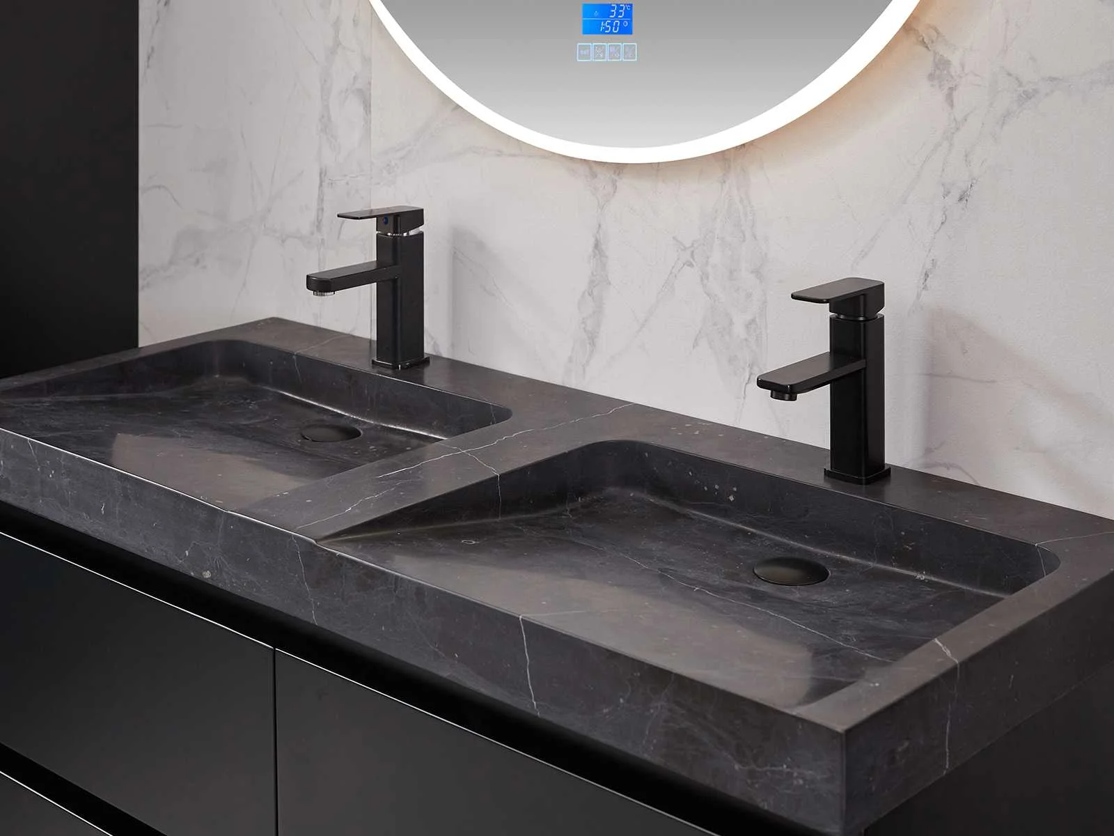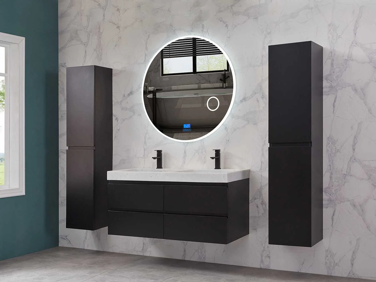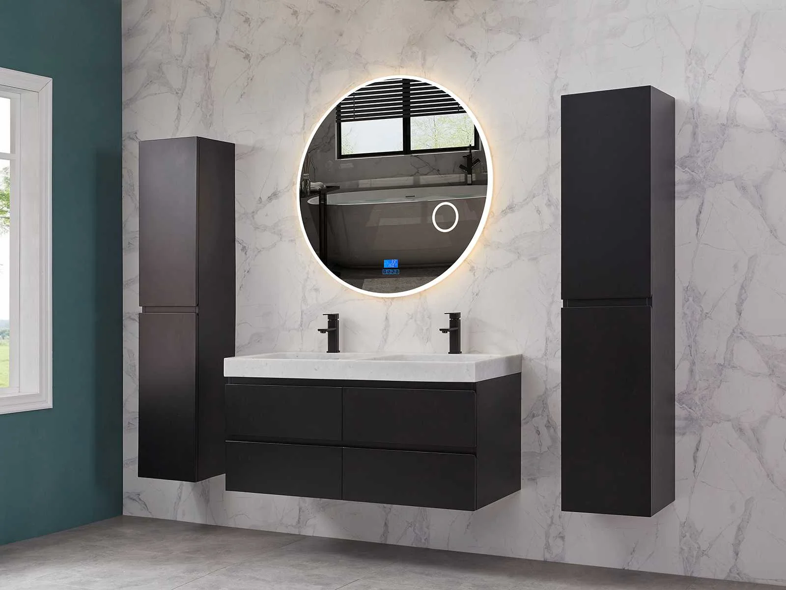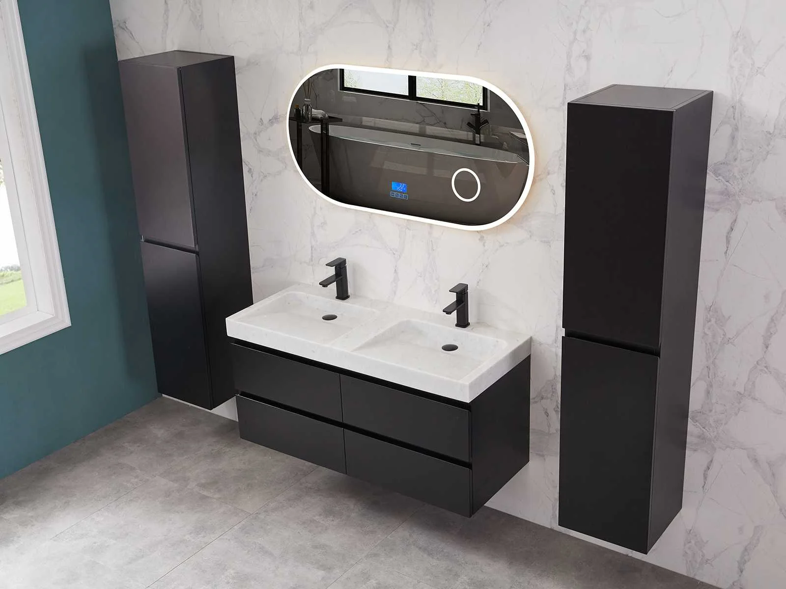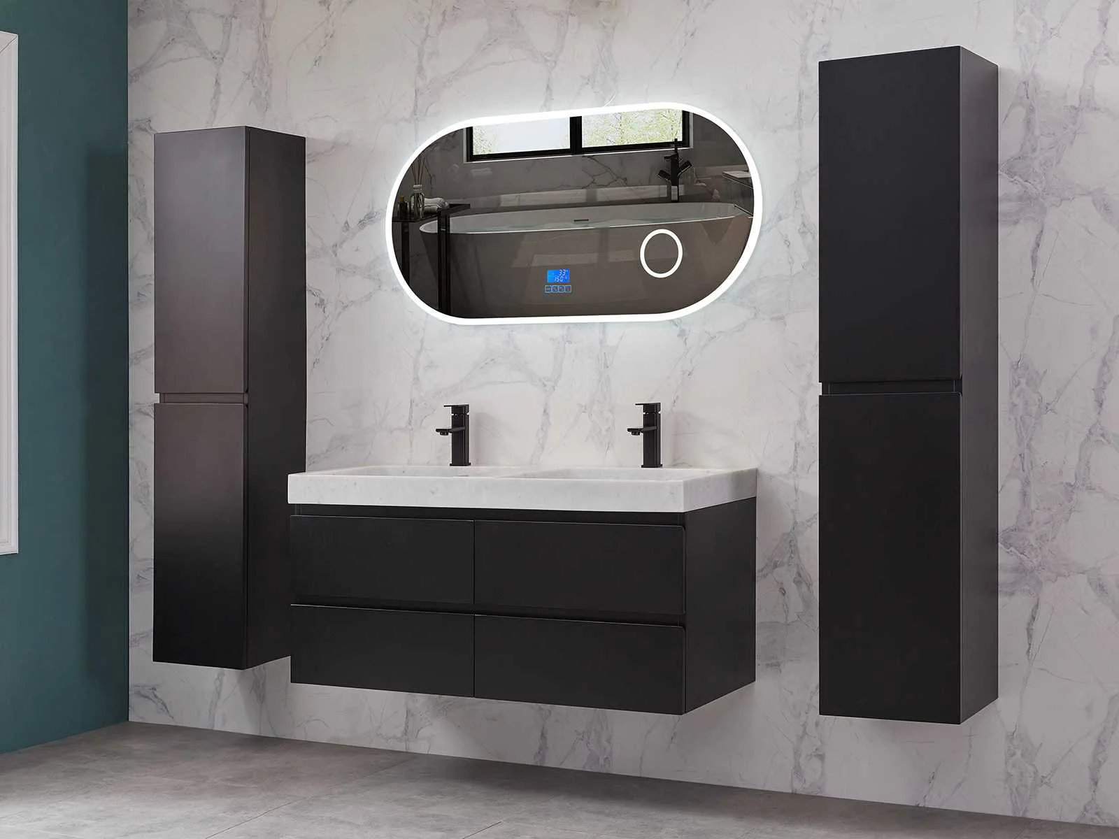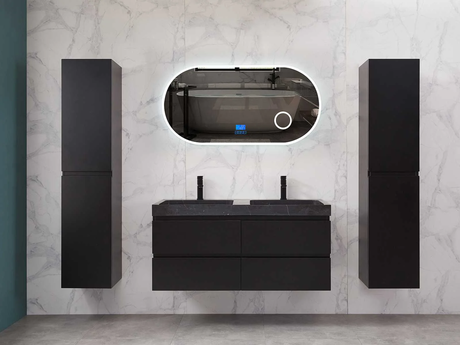 Afmeting meubel: bxdxh 120x49x50cm - hangkast 35x35x160cm, Materiaal 2cm 5-laags multiplex(zeer sterk en vochtbestendig), Hangkast softclose deuren en extra planchets (hangkast is universeel en kan zowel links als rechts naast het meubel gehangen worden), Kranen exclusief , Lades 4 stuks met softclose, Wastafel natuursteen of solid surface (keuze uit diverse modellen van de laatste foto's vaste of losse wasbakken met een mat witte of mat zwarte solid surface top, vaste bakken zijn ook zonder kraangaten beschikbaar zodat u muurkranen kunt gebruiken! Keuze graag aangeven op de afhaaldag), verwarming, bediening one-touch (voor heater, verlichting, bluetooth en instellingen), Verlichting aan de achterkant met met 3 verstelbare en dimbare kleuren LED 3000/4500/6000K LED-dioden (geel/blauw/wit licht), voorzien van digitaal display, geïntegreerde vergrotings spiegel van 10cm doorsnede met ledverlichting(vergroot 3x), bluetooth met speaker, digitale klok, digitale temperatuur aanduiding, 220volt stekker(plug and play), glas 1.5mm kopervrij met explosion-proof laag (mag uit diverse modellen gekozen worden welke in de afbeeldingen zijn afgebeeld, keuze graag aangeven op de afhaaldag), Afvoeren exclusief , Conditie: Nieuw in doos, Bijzonderheden 2 jaar garantie, compleet met installatiekit, mat zwarte aluminium grepen achter de inkepingen van de lades en deuren, natuursteen wastafel is behandeld met coating, zeer hoge kwaliteit, Extra's de hangkast mag geruild worden voor een set kranen en popup afvoeren naar keus(graag aangeven op de afhaaldag) Merk: Mawialux Breedte: 120cm Kleur: mat zwart Kraan: nee Wastafel: ja Waskom: ja Spiegel met verlichting: ja Onderkast: ja Lades: 4 Softclose: true Zijkast: ja Afmeting hangkast: 160x30x35
