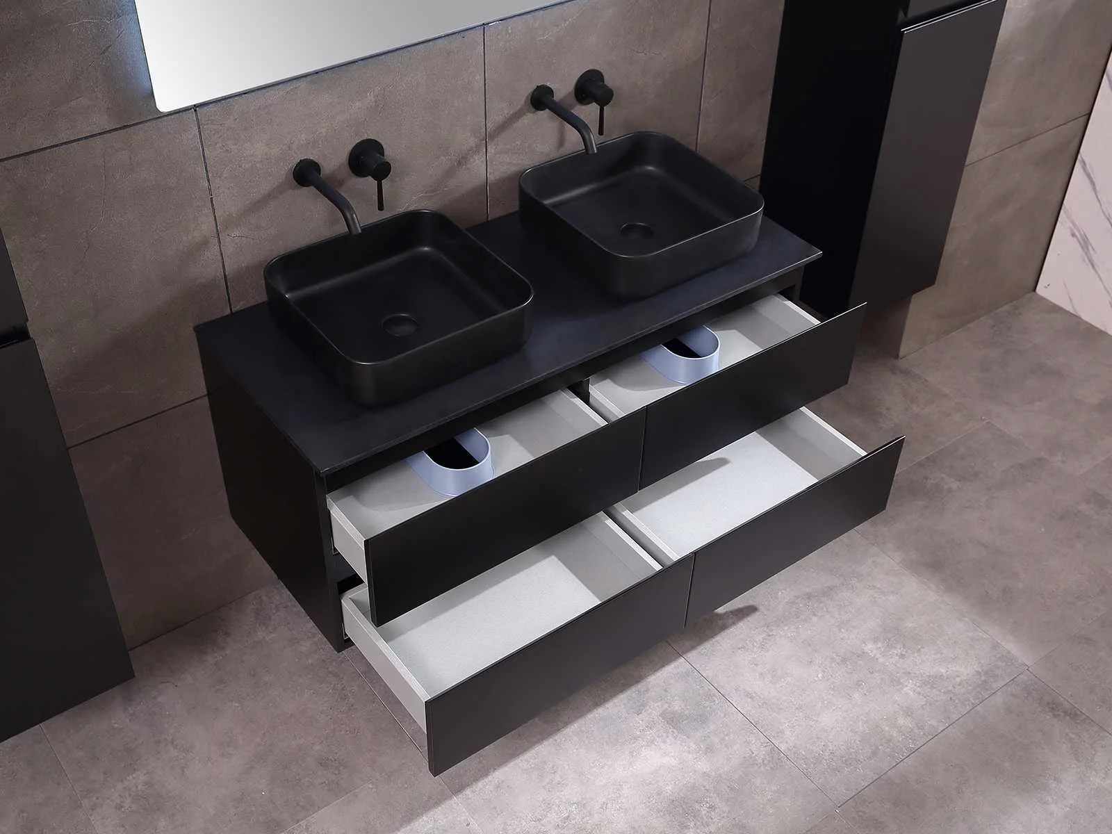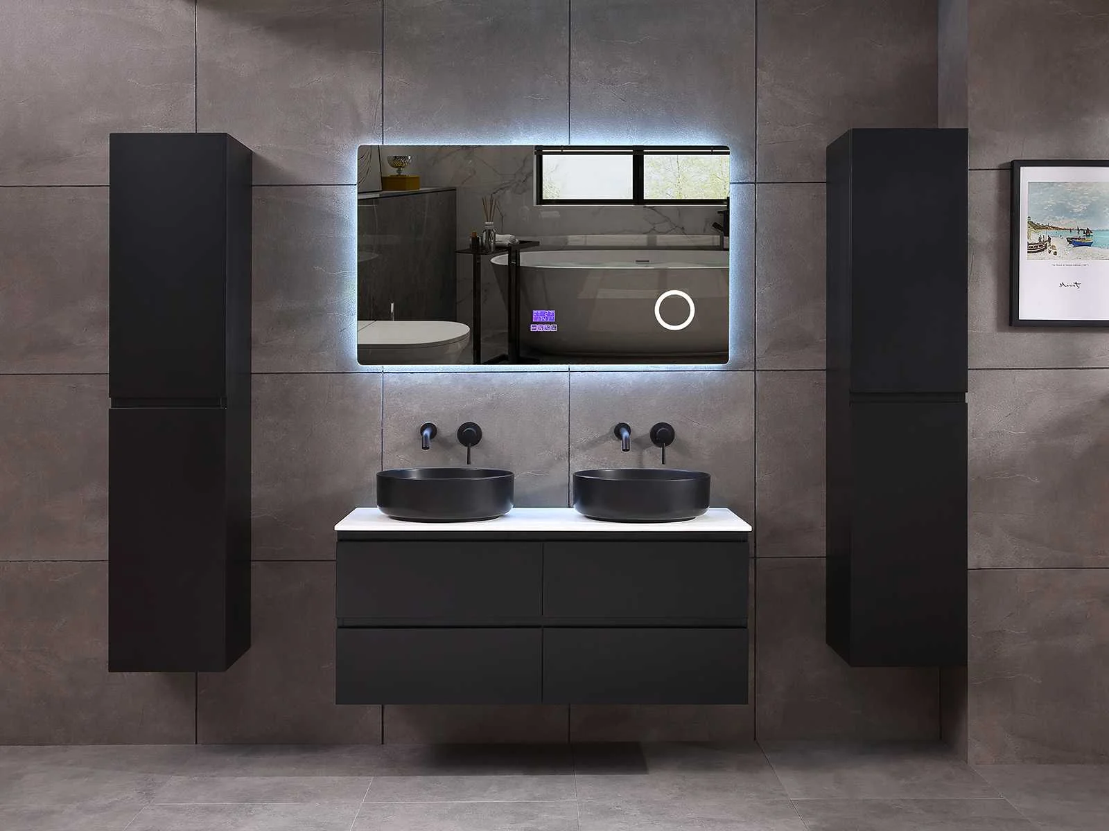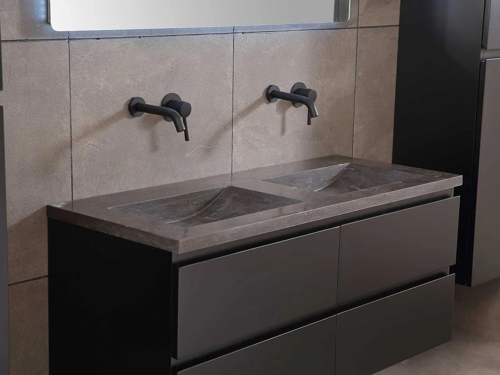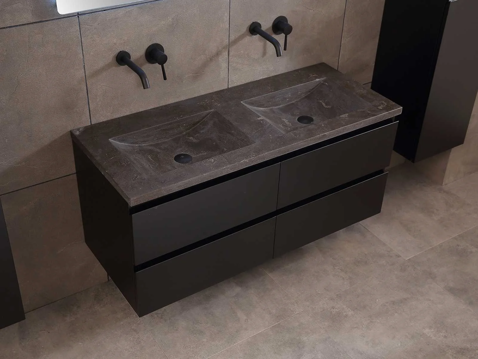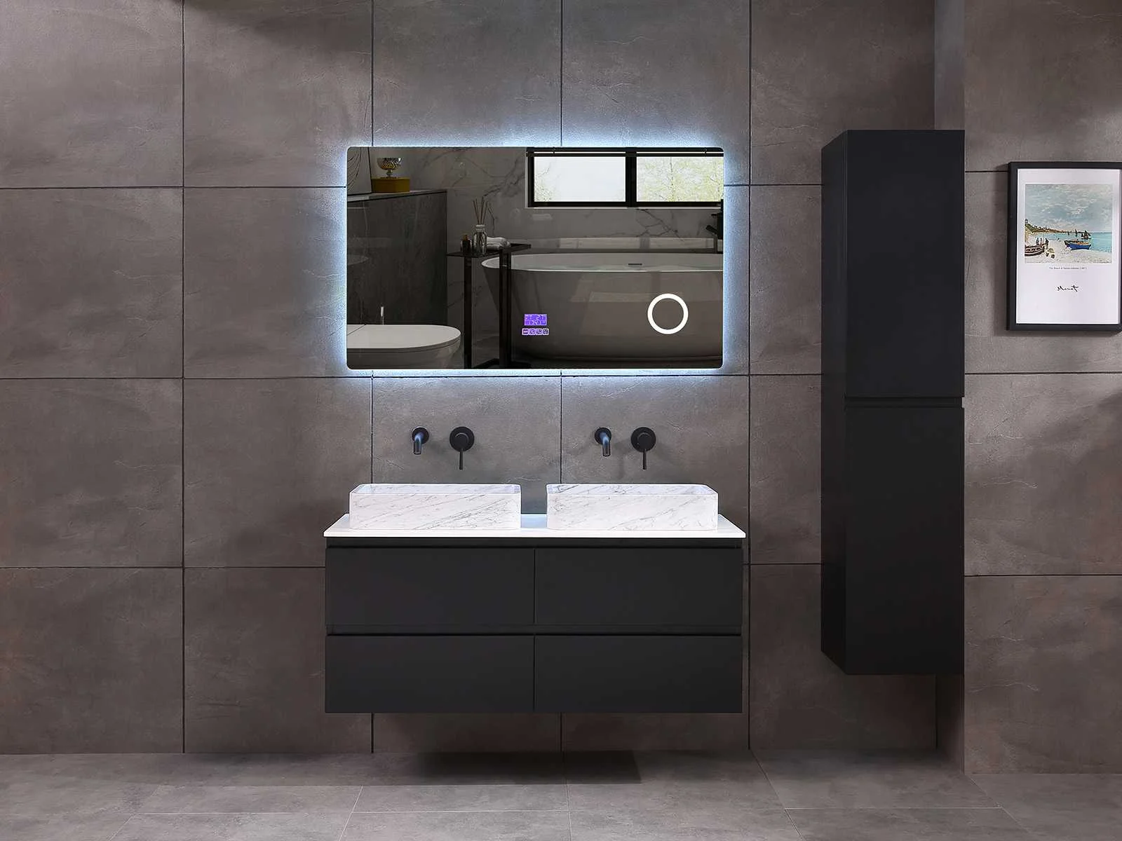 Afmeting meubel: bxdxh 120x49x50cm - hangkast 35x35x160cm, Materiaal 2cm 5-laags multiplex(zeer sterk en vochtbestendig), Hangkast softclose deuren en extra planchets (hangkast is universeel en kan zowel links als rechts naast het meubel gehangen worden), Kranen exclusief , Lades 4 stuks met softclose, Wastafel natuursteen of solid surface (keuze uit diverse modellen van de laatste foto's vaste of losse wasbakken met een mat witte of mat zwarte solid surface top, vaste bakken zijn ook zonder kraangaten beschikbaar zodat u muurkranen kunt gebruiken! Keuze graag aangeven op de afhaaldag), verwarming, bediening one-touch (voor heater, verlichting, bluetooth en instellingen), Verlichting aan de achterkant met met 3 verstelbare en dimbare kleuren LED 3000/4500/6000K LED-dioden (geel/blauw/wit licht), voorzien van digitaal display, geïntegreerde vergrotings spiegel van 10cm doorsnede met ledverlichting(vergroot 3x), bluetooth met speaker, digitale klok, digitale temperatuur aanduiding, 220volt stekker(plug and play), glas 1.5mm kopervrij met explosion-proof laag (mag uit diverse modellen gekozen worden welke in de afbeeldingen zijn afgebeeld, keuze graag aangeven op de afhaaldag), Afvoeren exclusief , Conditie: Nieuw in doos, Bijzonderheden 2 jaar garantie, compleet met installatiekit, mat zwarte aluminium grepen achter de inkepingen van de lades en deuren, natuursteen wastafel is behandeld met coating, zeer hoge kwaliteit, Extra's de hangkast mag geruild worden voor een set kranen en popup afvoeren naar keus(graag aangeven op de afhaaldag) Merk: Mawialux Breedte: 120cm Kleur: mat zwart Kraan: nee Wastafel: ja Waskom: ja Spiegel met verlichting: ja Onderkast: ja Lades: 4 Softclose: true Zijkast: ja Afmeting hangkast: 160x30x35