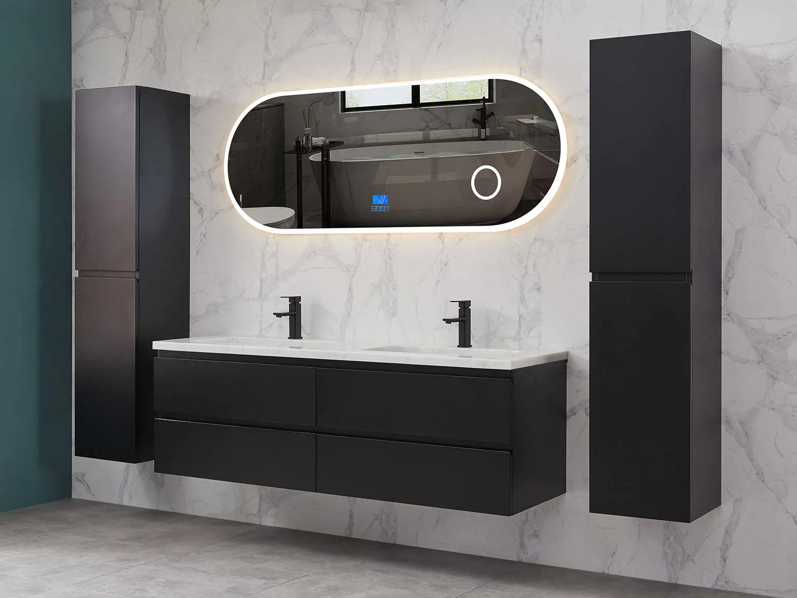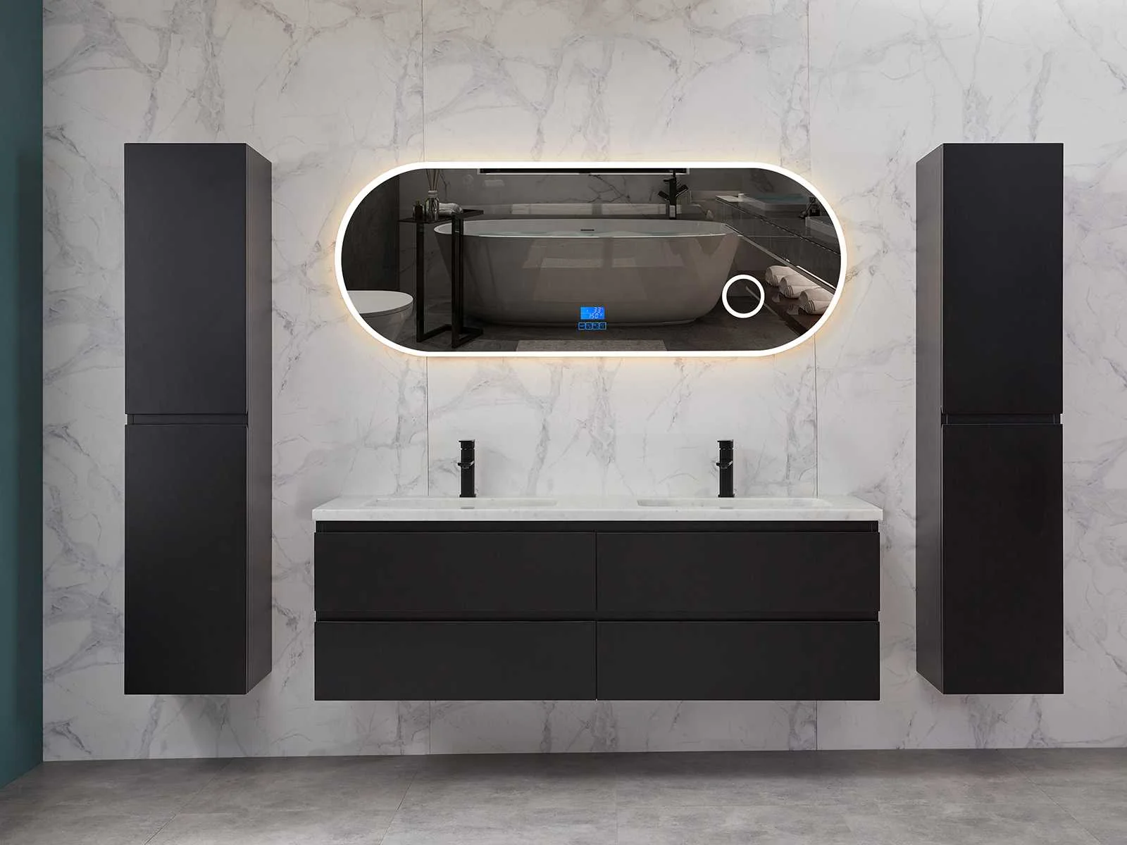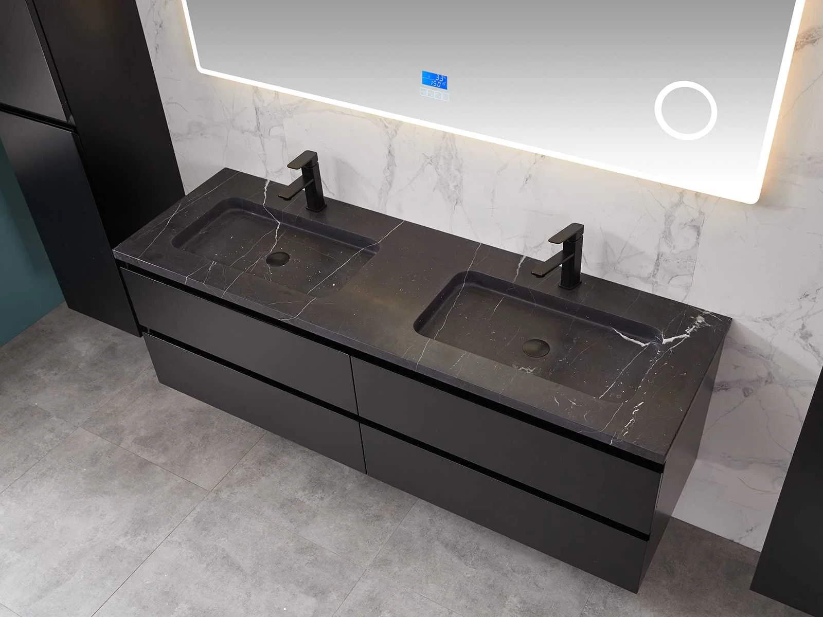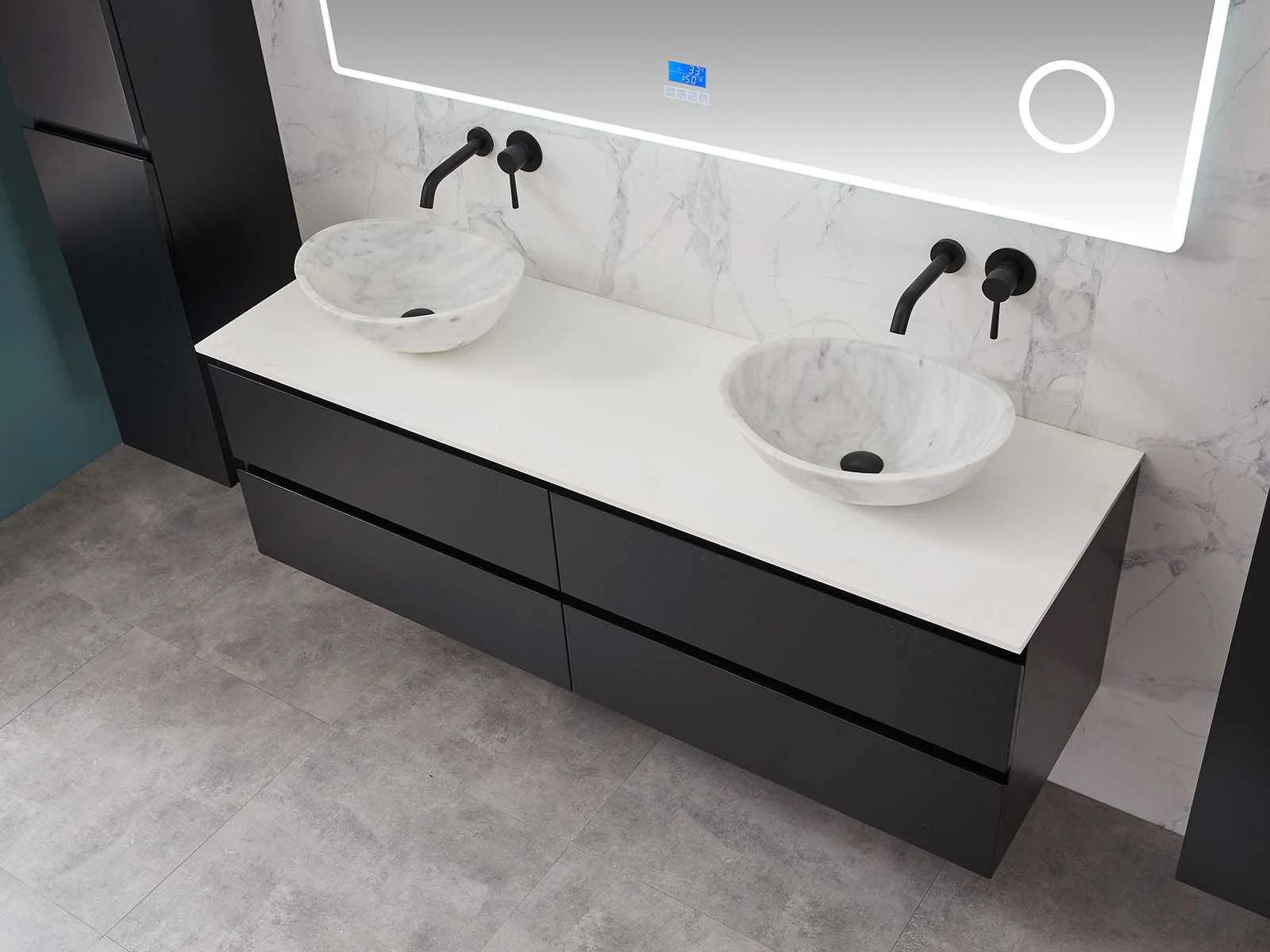 Afmeting meubel bxdxh 160x49x50cm - hangkast 35x35x160cm (1 hangkast zit bij de aankoop), kleur mat zwart, materiaal 2cm 5-laags multiplex(zeer sterk en vochtbestendig),met solid surface topplaat indien gewenst(mat wit of mat zwart), Hangkast softclose deuren en extra planchets (hangkast is universeel en kan zowel links als rechts naast het meubel gehangen worden), kranen exclusief , Lades 4 stuks met softclose, Wasbakken solid surface, natuursteen(met en zonder kraangaten beschikbaar de vaste wastafels) of italiaans marmer (keuze uit diverse modellen en kleuren van de laatste foto's graag doorgeven op afhaaldag), led spiegel met verwarming/radio/klok en vergrootglas met ledverlichting rondom aan de voorkant met 3 verstelbare kleuren led 3000/4500/6000k led-dioden (geel/blauw/wit licht) met de volgende opties digitaal display, geïntegreerde vergrotingsspiegel van 10cm doorsnede met ledverlichting(vergroot 3x), digitale klok, digitale temperatuur aanduiding, 220volt stekker(plug and play), afvoeren exclusief, Conditie: Nieuw in doos, Bijzonderheden 2 jaar garantie, gaten zijn niet in het topblad voorgeboord in u voor deze keuze gaat zodat u zowel muurkranen als kranen vanaf het blad kunt gebruiken of zelf 1 wastafel in plaats van 2 stuks(gaten boren is geen enkel probleem en zeer gemakkelijk uit te voeren bij solid surface) compleet met installatiekit, natuursteen wastafels zijn behandeld met coating, zeer hoge kwaliteit, let op! de hangkast mag geruild worden voor een set kranen en popup afvoeren naar keus of als u een extra hangkast nodig graag op de afhaaldag aangeven voor een passende aanbieding Merk: Mawialux Model: Brandon Hoogte: 50cm Lengte: 49cm Breedte: 160cm Materiaal: 2cm massief top en 5-laags multiplex(zeer sterk en vochtbestendig) Kleur: Mat zwart Kraan: exclusief Wastafel: diverse keuzes Waskom: diverse keuzes Spiegel met verlichting: ja Verlichting: ja Lades: 4 Softclose: true Bevestigingsmateriaal: true Zijkast: ja 1x