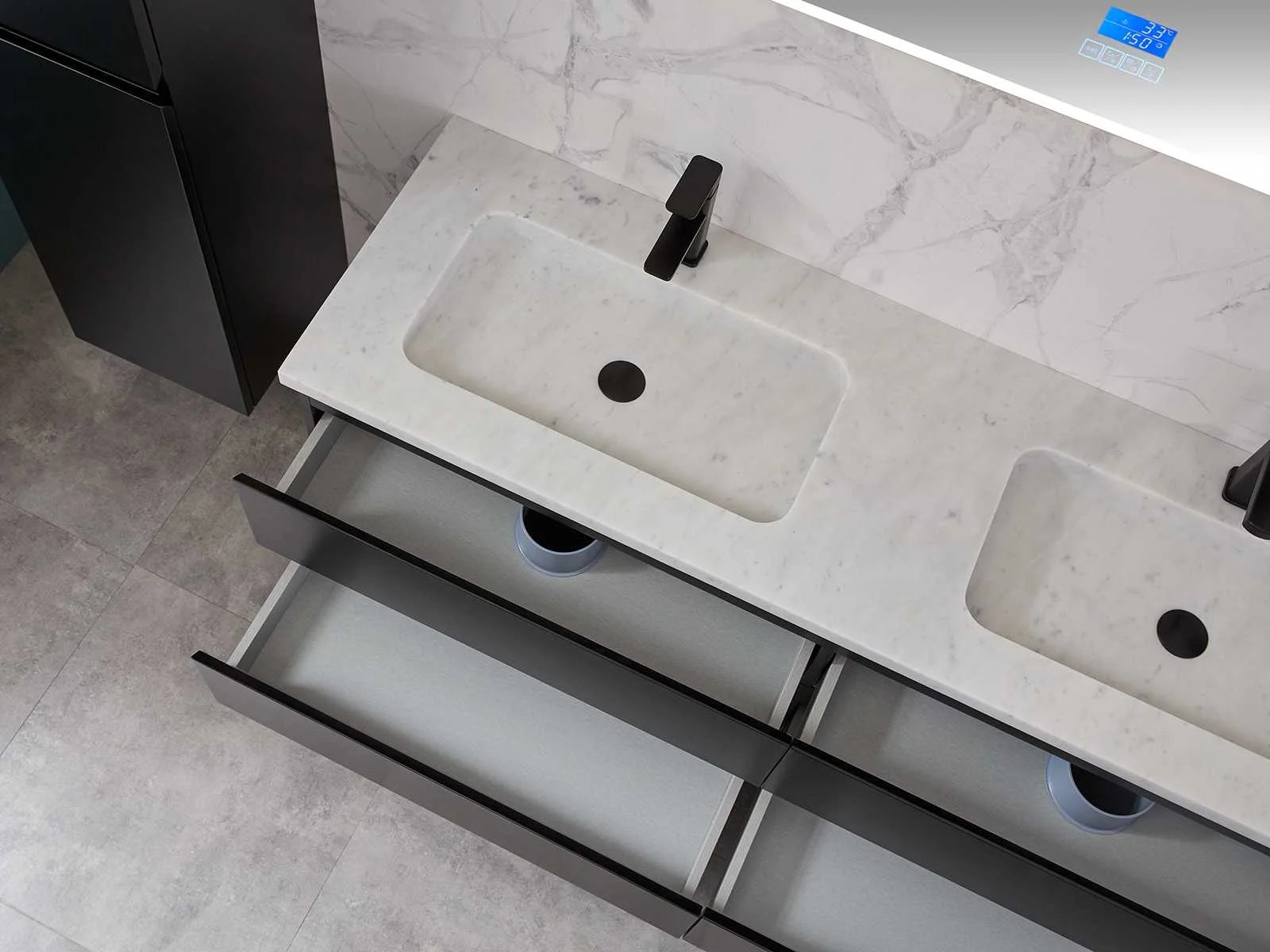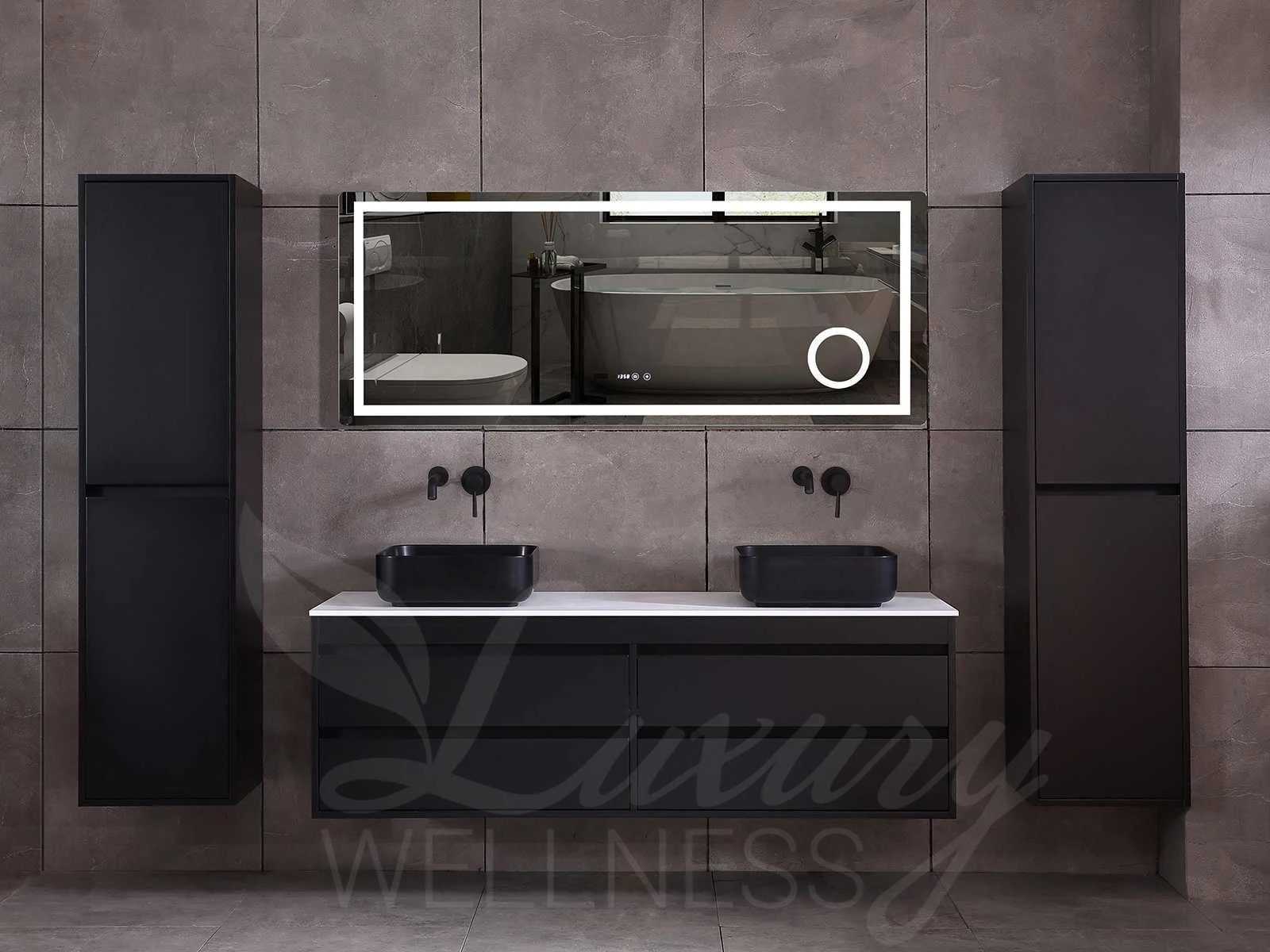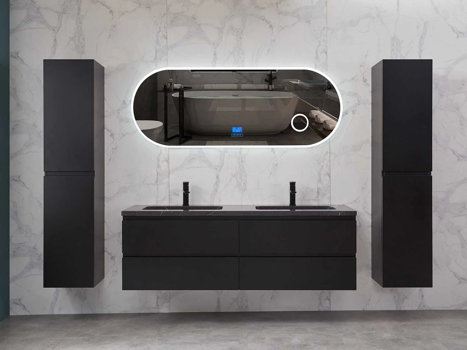 Afmeting meubel bxdxh 160x49x50cm - hangkast 35x35x160cm (1 hangkast zit bij de aankoop), kleur mat zwart, materiaal 2cm 5-laags multiplex(zeer sterk en vochtbestendig),met solid surface topplaat indien gewenst(mat wit of mat zwart), Hangkast softclose deuren en extra planchets (hangkast is universeel en kan zowel links als rechts naast het meubel gehangen worden), kranen exclusief , Lades 4 stuks met softclose, Wasbakken solid surface, natuursteen(met en zonder kraangaten beschikbaar de vaste wastafels) of italiaans marmer (keuze uit diverse modellen en kleuren van de laatste foto's graag doorgeven op afhaaldag), led spiegel met verwarming/radio/klok en vergrootglas met ledverlichting rondom aan de voorkant met 3 verstelbare kleuren led 3000/4500/6000k led-dioden (geel/blauw/wit licht) met de volgende opties digitaal display, geïntegreerde vergrotingsspiegel van 10cm doorsnede met ledverlichting(vergroot 3x), digitale klok, digitale temperatuur aanduiding, 220volt stekker(plug and play), afvoeren exclusief, Conditie: Nieuw in doos, Bijzonderheden 2 jaar garantie, gaten zijn niet in het topblad voorgeboord in u voor deze keuze gaat zodat u zowel muurkranen als kranen vanaf het blad kunt gebruiken of zelf 1 wastafel in plaats van 2 stuks(gaten boren is geen enkel probleem en zeer gemakkelijk uit te voeren bij solid surface) compleet met installatiekit, natuursteen wastafels zijn behandeld met coating, zeer hoge kwaliteit, let op! de hangkast mag geruild worden voor een set kranen en popup afvoeren naar keus of als u een extra hangkast nodig graag op de afhaaldag aangeven voor een passende aanbieding Merk: Mawialux Model: Brandon Hoogte: 50cm Lengte: 49cm Breedte: 160cm Materiaal: 2cm massief top en 5-laags multiplex(zeer sterk en vochtbestendig) Kleur: Mat zwart Kraan: exclusief Wastafel: diverse keuzes Waskom: diverse keuzes Spiegel met verlichting: ja Verlichting: ja Lades: 4 Softclose: true Bevestigingsmateriaal: true Zijkast: ja 1x