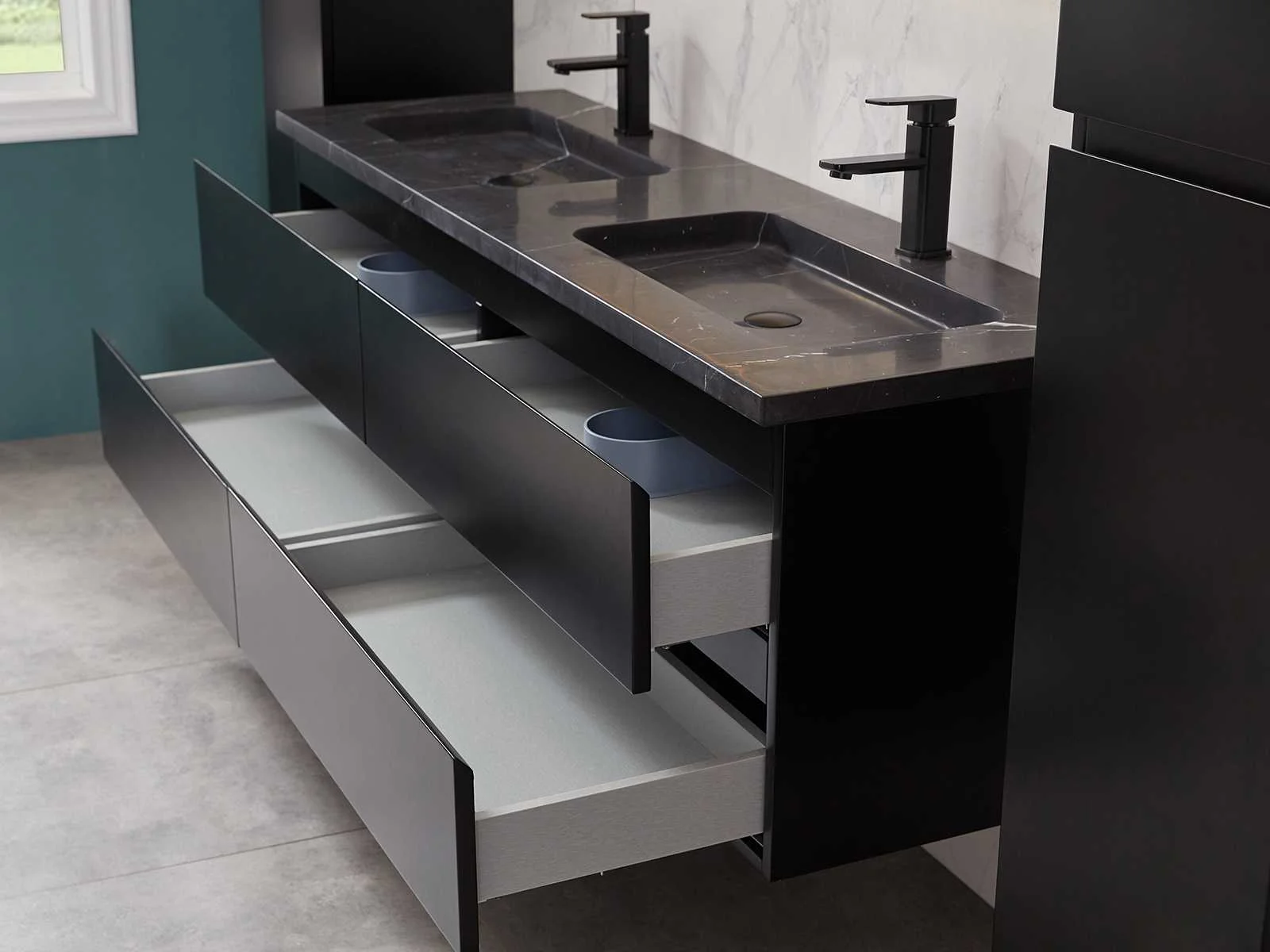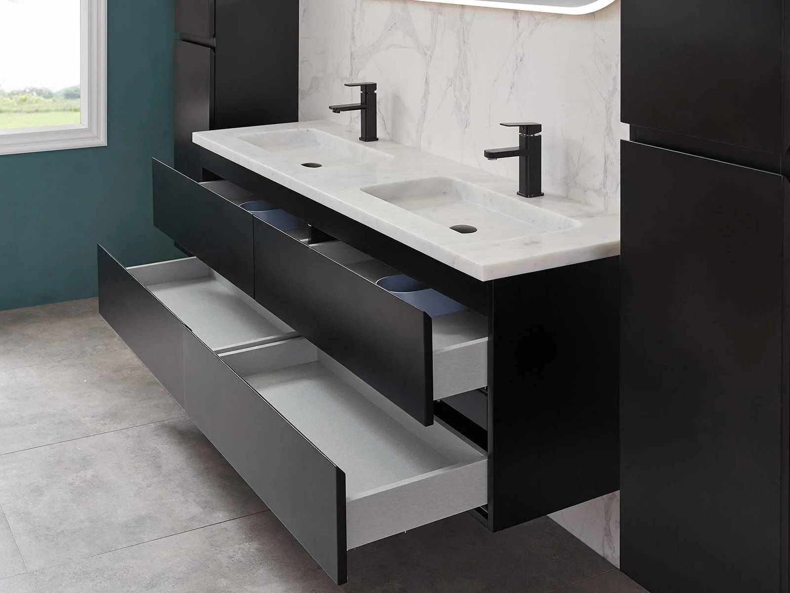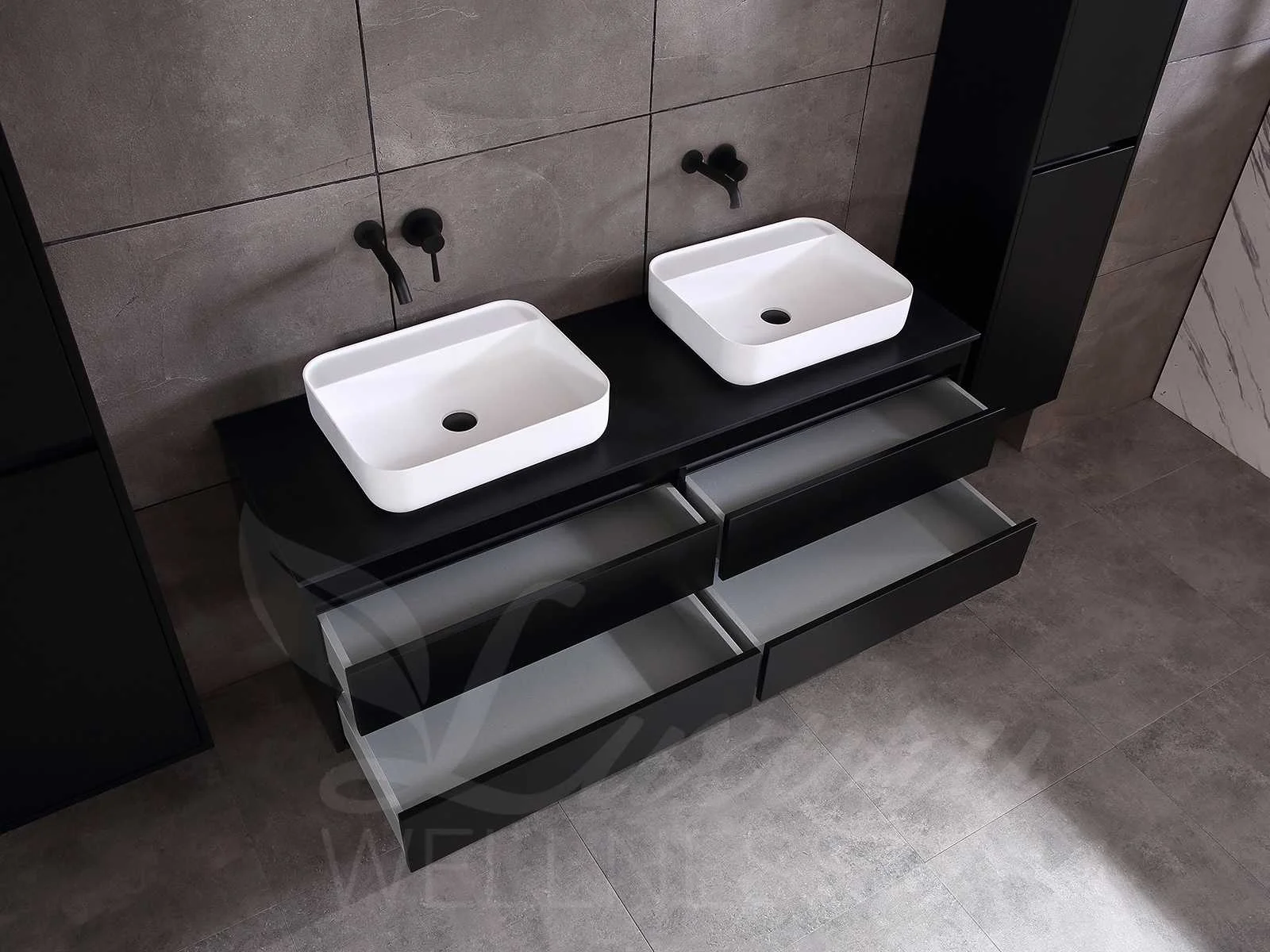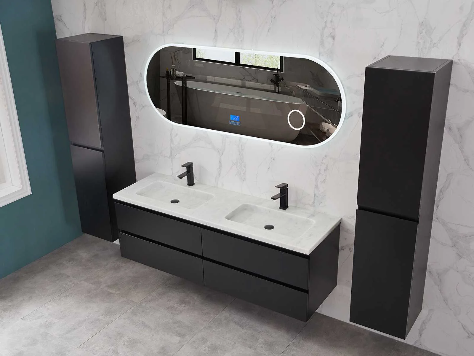 Afmeting meubel bxdxh 160x49x50cm - hangkast 35x35x160cm (1 hangkast zit bij de aankoop), kleur mat zwart, materiaal 2cm 5-laags multiplex(zeer sterk en vochtbestendig),met solid surface topplaat indien gewenst(mat wit of mat zwart), Hangkast softclose deuren en extra planchets (hangkast is universeel en kan zowel links als rechts naast het meubel gehangen worden), kranen exclusief , Lades 4 stuks met softclose, Wasbakken solid surface, natuursteen(met en zonder kraangaten beschikbaar de vaste wastafels) of italiaans marmer (keuze uit diverse modellen en kleuren van de laatste foto's graag doorgeven op afhaaldag), led spiegel met verwarming/radio/klok en vergrootglas met ledverlichting rondom aan de voorkant met 3 verstelbare kleuren led 3000/4500/6000k led-dioden (geel/blauw/wit licht) met de volgende opties digitaal display, geïntegreerde vergrotingsspiegel van 10cm doorsnede met ledverlichting(vergroot 3x), digitale klok, digitale temperatuur aanduiding, 220volt stekker(plug and play), afvoeren exclusief, Conditie: Nieuw in doos, Bijzonderheden 2 jaar garantie, gaten zijn niet in het topblad voorgeboord in u voor deze keuze gaat zodat u zowel muurkranen als kranen vanaf het blad kunt gebruiken of zelf 1 wastafel in plaats van 2 stuks(gaten boren is geen enkel probleem en zeer gemakkelijk uit te voeren bij solid surface) compleet met installatiekit, natuursteen wastafels zijn behandeld met coating, zeer hoge kwaliteit, let op! de hangkast mag geruild worden voor een set kranen en popup afvoeren naar keus of als u een extra hangkast nodig graag op de afhaaldag aangeven voor een passende aanbieding Merk: Mawialux Model: Brandon Hoogte: 50cm Lengte: 49cm Breedte: 160cm Materiaal: 2cm massief top en 5-laags multiplex(zeer sterk en vochtbestendig) Kleur: Mat zwart Kraan: exclusief Wastafel: diverse keuzes Waskom: diverse keuzes Spiegel met verlichting: ja Verlichting: ja Lades: 4 Softclose: true Bevestigingsmateriaal: true Zijkast: ja 1x