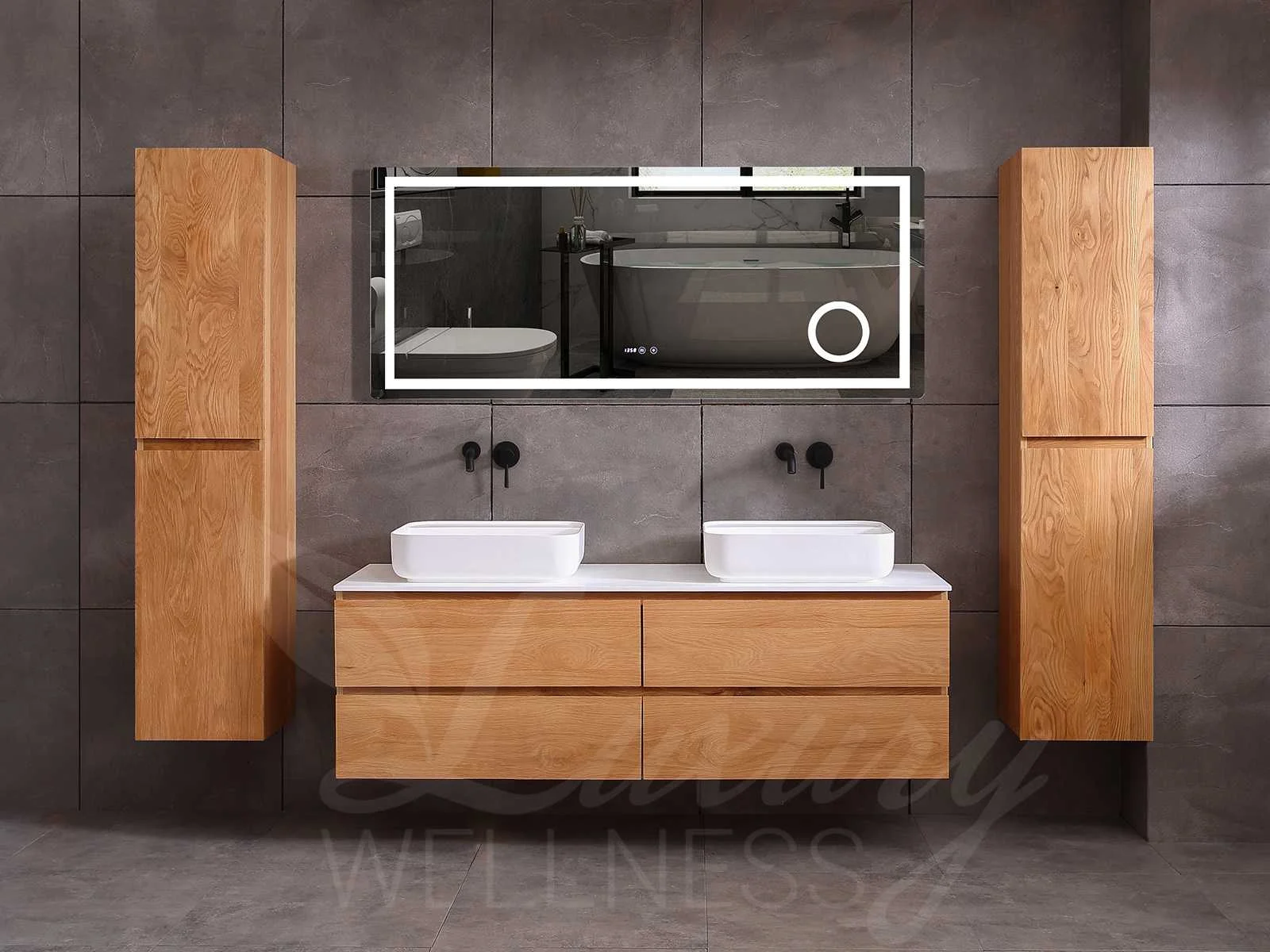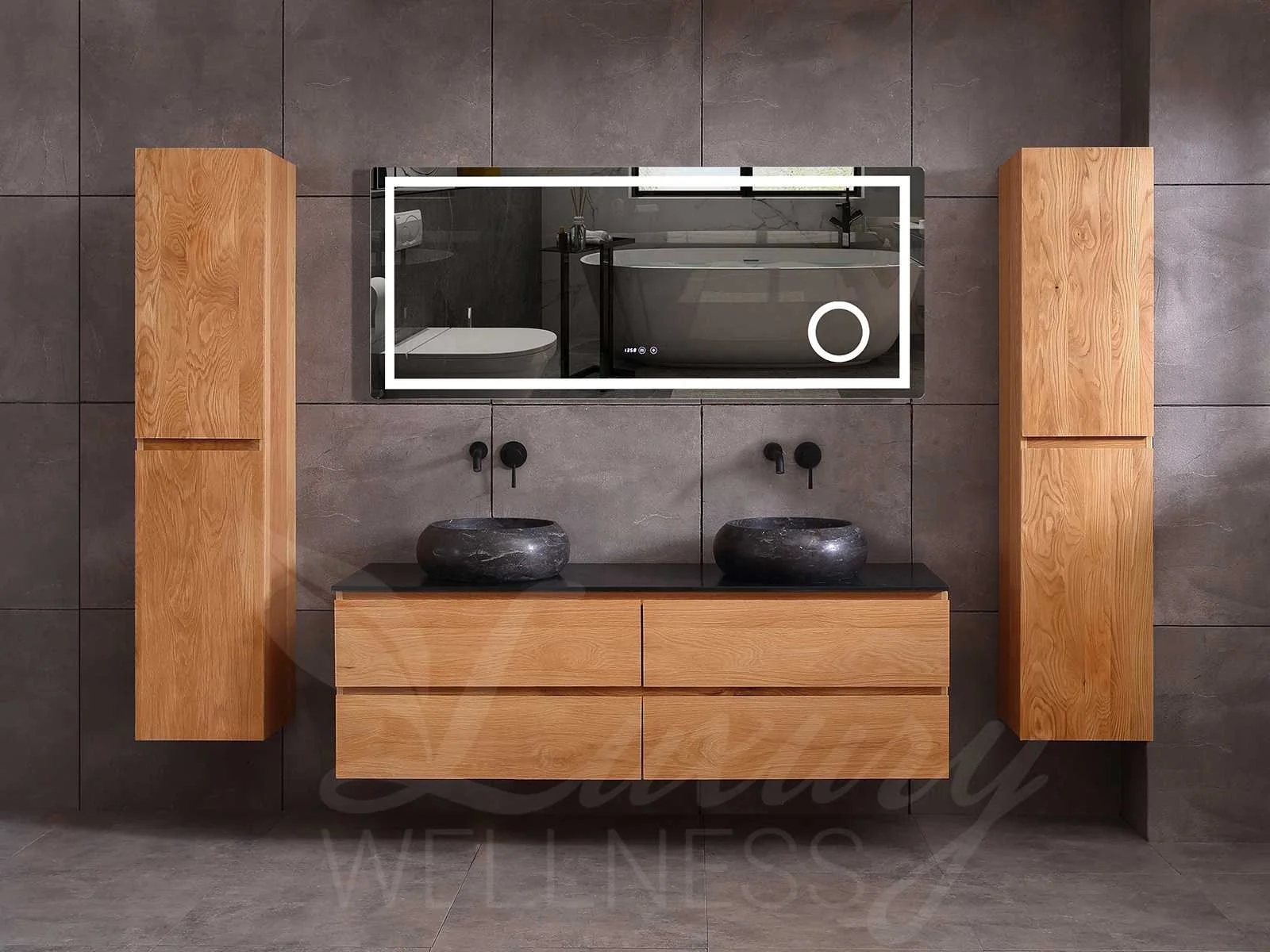Afmeting meubel bxdxh 140x50x50cm - hangkast 40x28x168cm, kleur eiken natural, materiaal 3cm massief eiken top + 2cm massief eiken (front) en 5-laags multiplex(zeer sterk en vochtbestendig), hangkast softclose deuren en extra planchets (hangkast is universeel en kan zowel links als rechts naast het meubel gehangen worden), kranen exclusief, lades 4 stuks met softclose, wastafels natuursteen of solid surface (keuze uit diverse modellen van de laatste foto's, keuze graag op de afhaaldag aangeven), spiegel led spiegel met verwarming/bluetooth/radio/klok en vergrootglas met ledverlichting rondom aan de achterkant met 3 verstelbare kleuren led 3000/4500/6000k led-dioden (geel/blauw/wit licht) met de volgende opties digitaal display, geïntegreerde vergrotingsspiegel van 10cm doorsnede met ledverlichting(vergroot 3x), bluetooth met speaker, digitale klok, digitale temperatuur aanduiding, 220volt stekker(plug and play), LET OP: Dit betreft een onderkast met een massief 3cm top zoals de laatste foto, de overige foto's zijn enkel een voorbeeld, let op! de hangkast mag geruild worden voor een set kranen en popup afvoeren naar keus of als u een extra hangkast nodig graag op de afhaaldag aangeven voor een passende aanbieding Merk: Mawialux Model: William Hoogte: 50cm Lengte: 50cm Breedte: 140cm Materiaal: Eiken Kleur: grey smoked of natural eiken Lades: 4 Softclose: true Bevestigingsmateriaal: true Zijkast: ja 1x