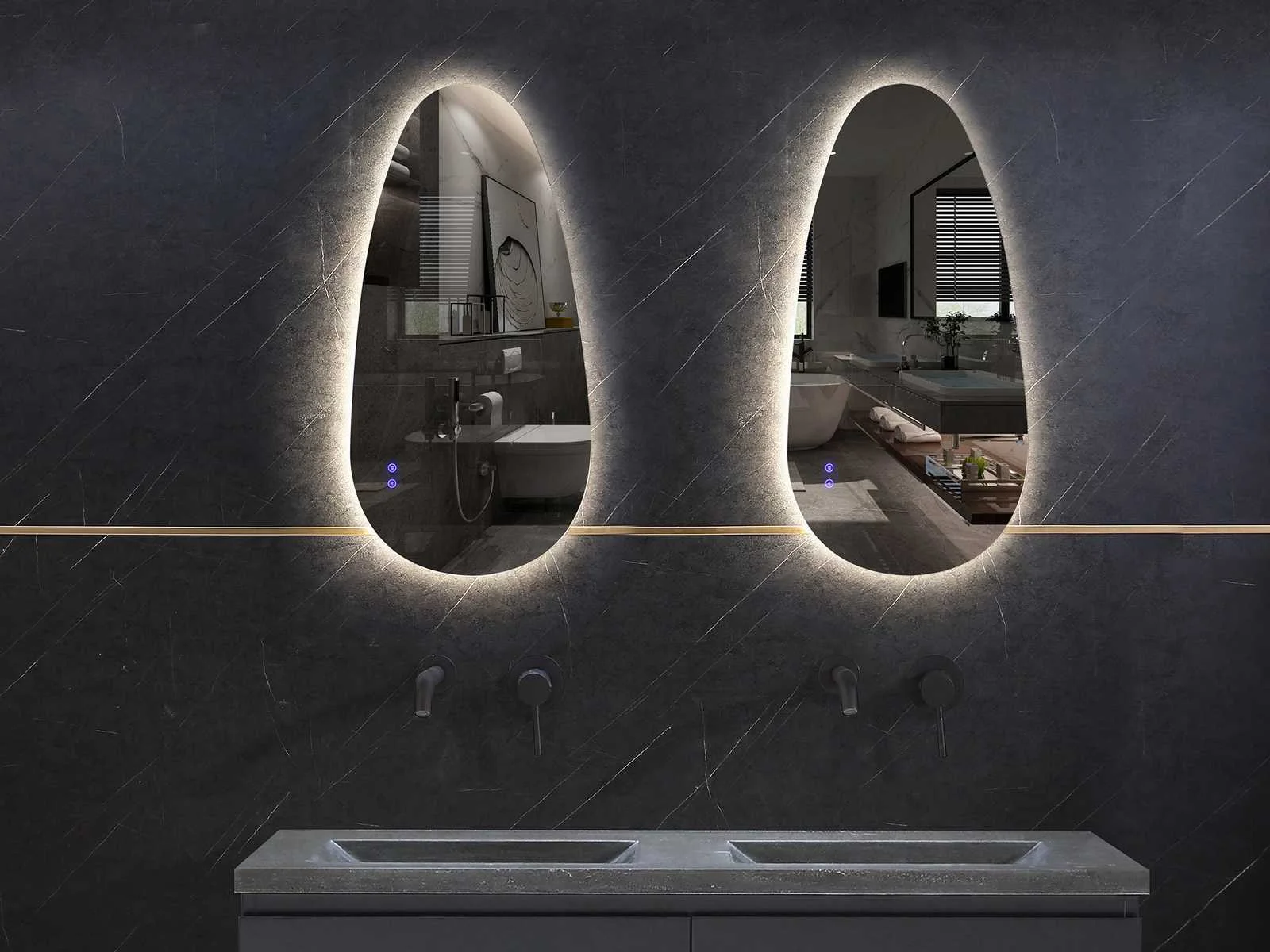 LET OP: keuze uit 3 maten namelijk 140x65 of 150x70 of 160x70 en spiegel is ook in spiegelbeeld verkrijgbaar (met het dikke gedeelte links) keuze graag aangeven op afhaaldag, verwarming, bediening 2x one-touch touchebediening, verlichting 3 verstelbare kleuren led 3000/4500/6000k led-dioden(dimbaar) (geel/blauw/wit licht), voorzien van 4 geïntegreerde ophangpunten, 220volt stekker(plug and play), 1.5mm kopervrij glas met explosion-proof laag, er zitten 4 ophangpunten achter de spiegel waardoor je spiegel zowel horizontaal als verticaal op kunt hangen (past dus zowel op een 80cm als een 50cm breed meubel en diverse andere 1 of 2-persoons meubels), zeer exclusieve spiegel Merk: Mawialux Model: Darla Breedte: 140-160cm Hoogte: 65-70cm Touchscreen: true
