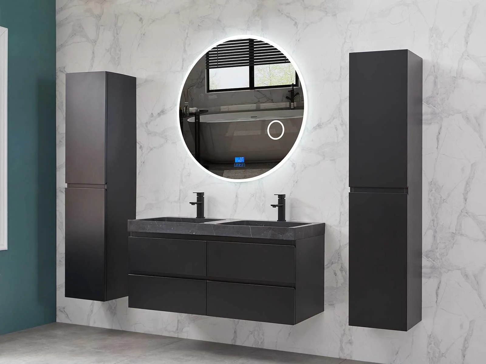 Keuze uit 4 diameters: 70, 80, 90 of 100cm (keuze graag doorgeven op de afhaaldag),verwarming, bediening one-touch (voor heater, verlichting, bluetooth en instellingen), verlichting aan de voorkant met een lichtband en rondom aan de achterkant met een lichtdoorlatende acrylrand met 3 verstelbare en dimbare kleuren led 3000/4500/6000k led-dioden (geel/blauw/wit licht), voorzien van digitaal display, bluetooth met 2 speakers, digitale klok, temperatuur aanduiding, 220volt stekker(plug and play), geïntegreerde vergrotingsspiegel van 10cm doorsnede met ledverlichting (vergroot 3x), 1.5mm kopervrij glas met explosion-proof laag, de spiegel is rondom voorzien van een acrylrand waardoor de led verlichting niet zichtbaar is vanaf de zijkant Merk: Mawialux Model: Laine Breedte: 70-100cm Hoogte: 90cm Touchscreen: true Bluetooth: true