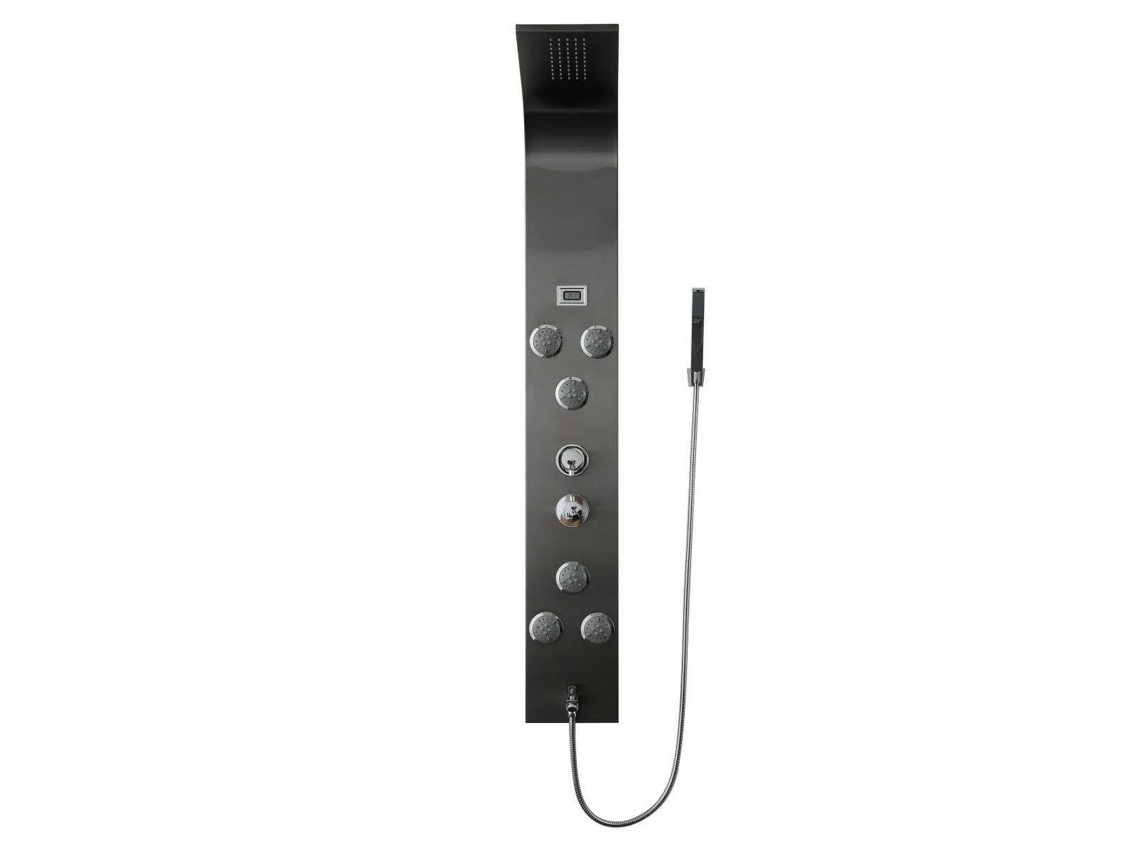 Materiaal 304 rvs (messing kraanwerk), kleur zwart met chrome, hoogte 155x20 cm, binnenwerk keramisch, douchekop geïntegreerd, handdouche verstelbaar met doucheslang, voorzien van display met digitale temperatuuraanduiding, 6 verstelbare massagejets met meerder waterfuncties, anti kalk behandeld Merk: Mawialux Model: Owen
