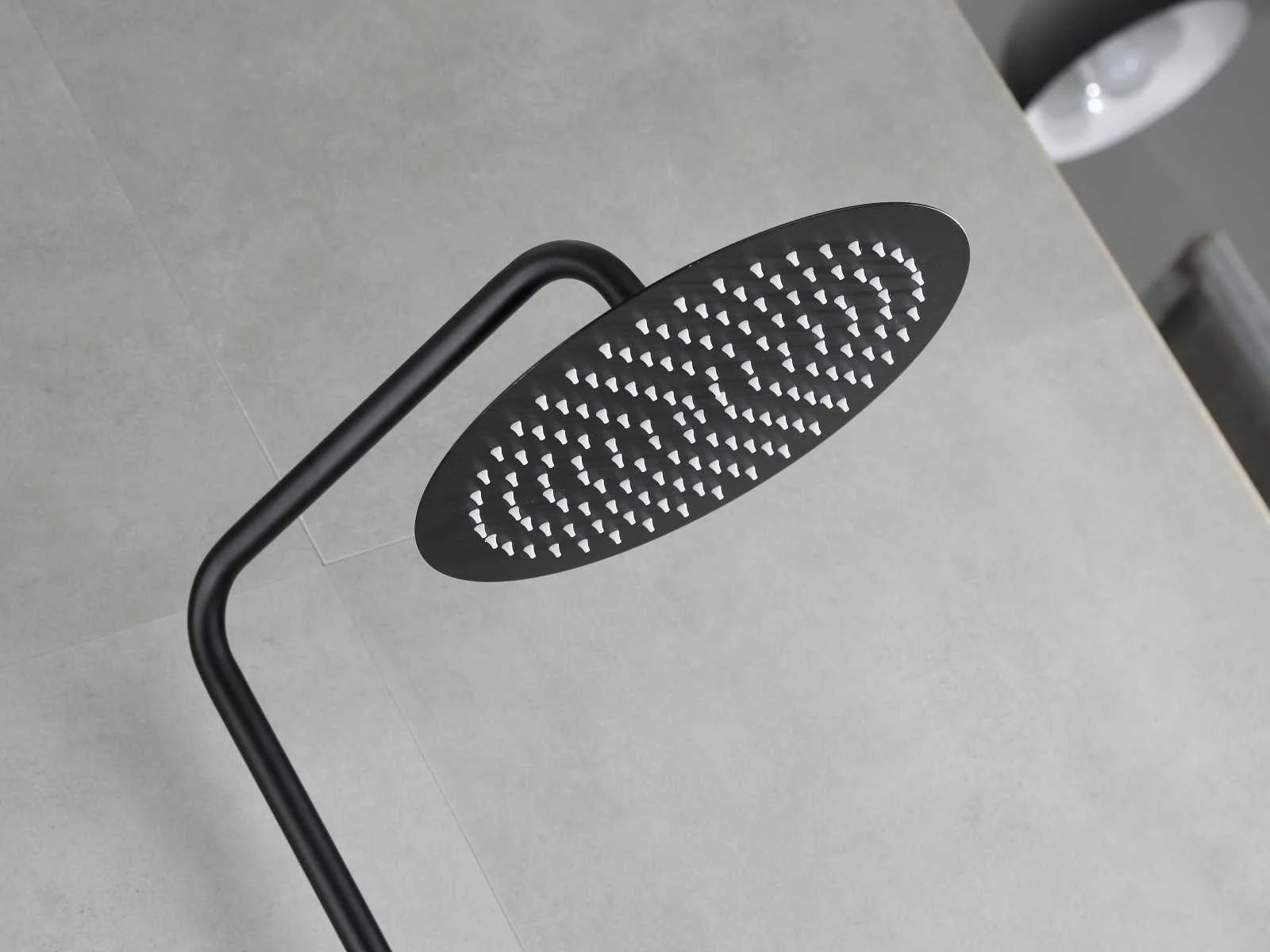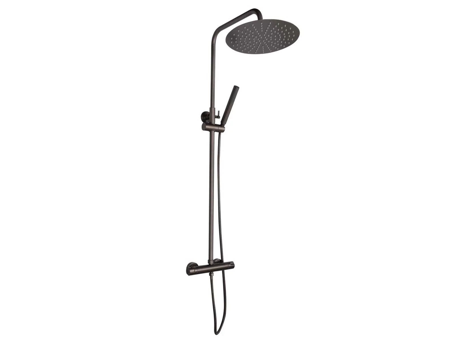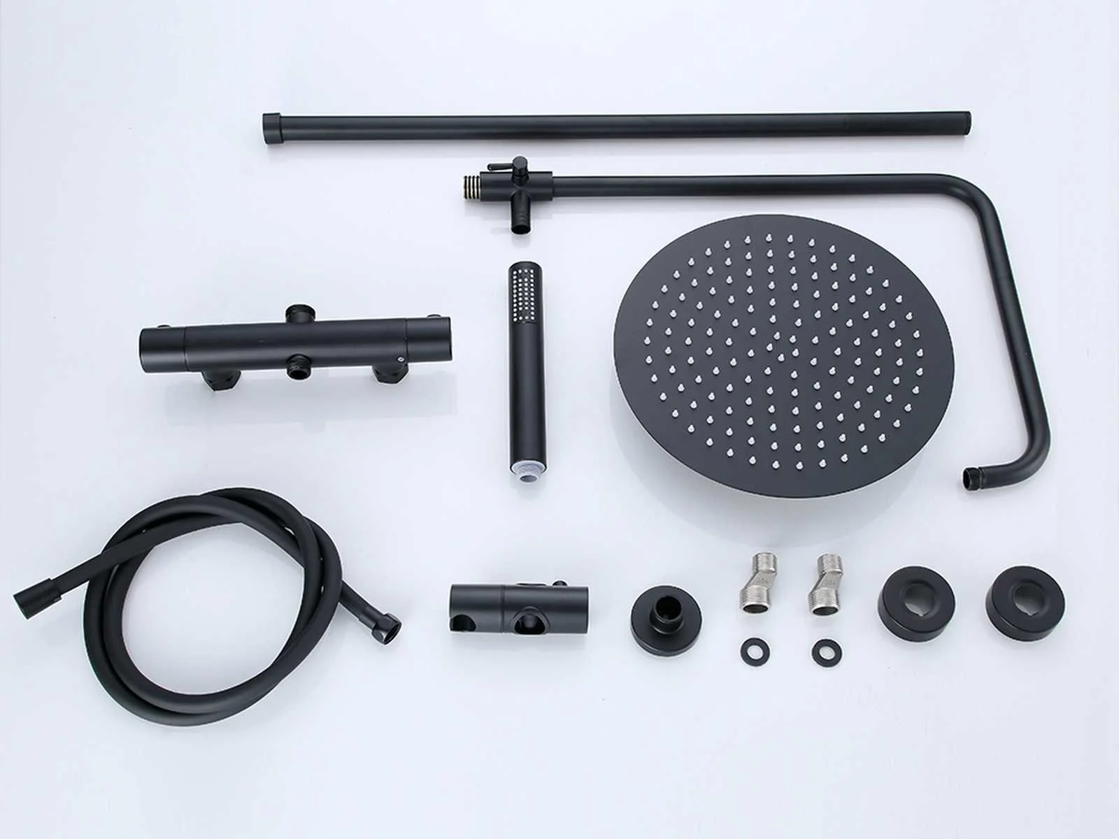 Materiaal messing en rvs, er mag gekozen worden tussen 1 van deze kleuren: mat zwart, geborsteld goud, gunmetal grey, koper (keuze graag aangeven op de ophaaldag zelf), thermostaatkraan, binnenwerk keramisch, douchekop plat design 30 cm doorsnede van 304 rvs, handdouche verstelbaar met doucheslang, hoogte verstelbaar, douchekop met kunststof wateruitlopen, douchekop kantel en draaibaar, h.o.h. afstand van 150 mm (naar 120 mm te krijgen met de meegeleverde s-koppelingen) Merk: Mawialux Model: Olga Kleur: kleurkeuze