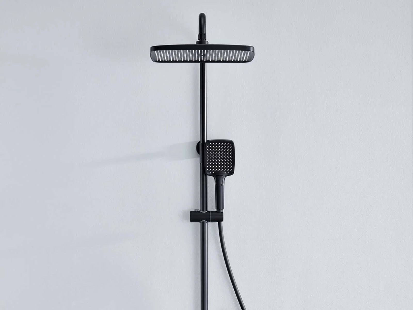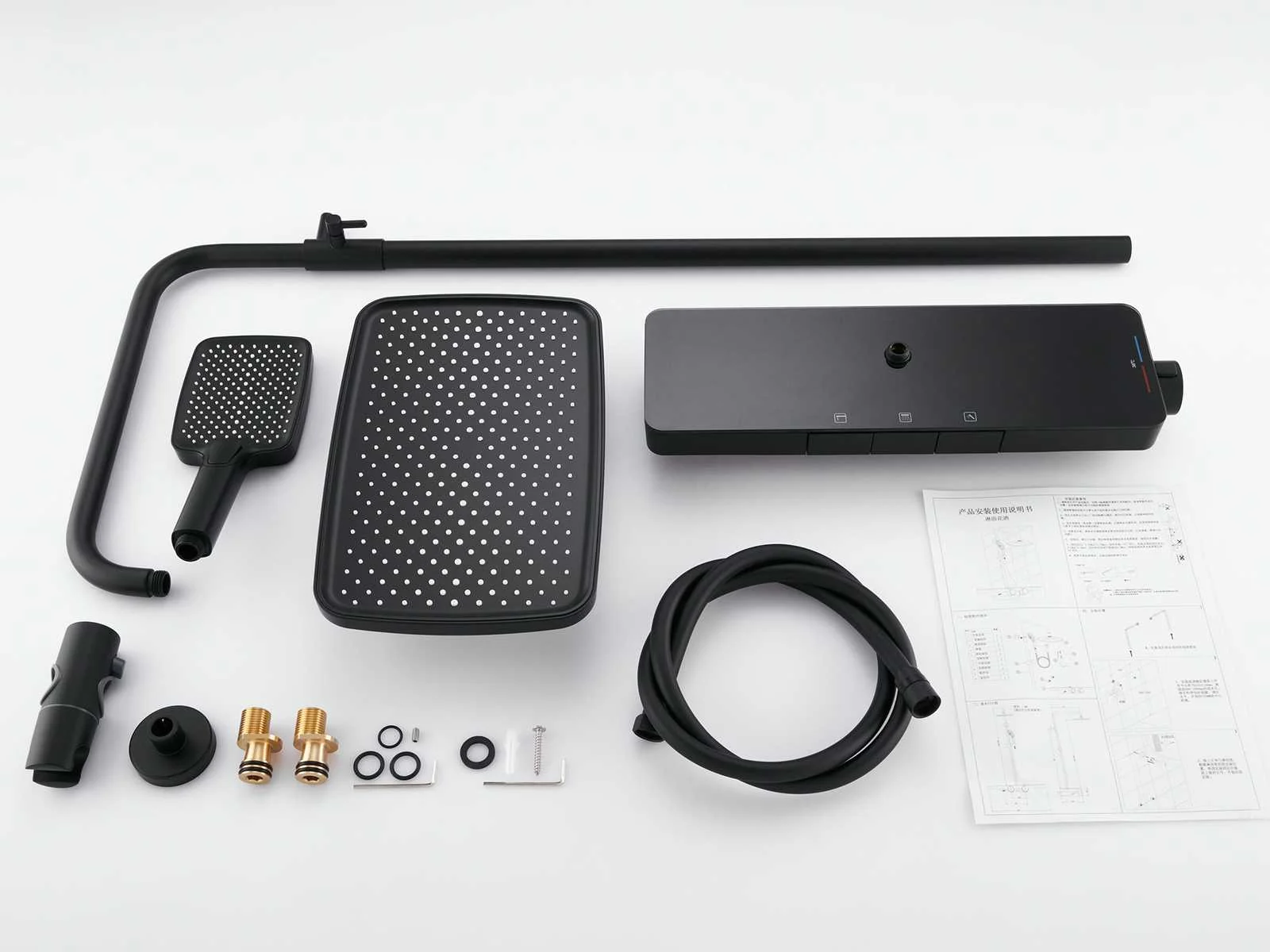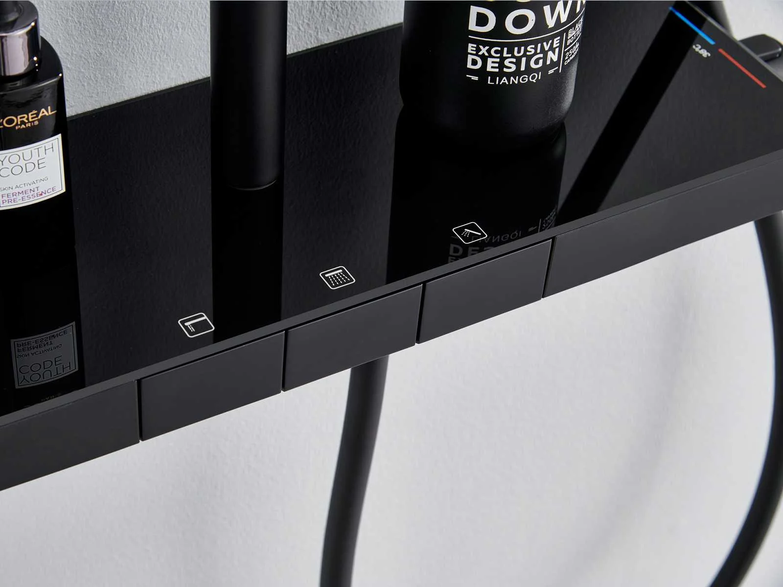 De doucheset is uitgerust met een thermostatische mengkraan voorzien van keramische binnenwerken, vierkant hoofddouche en verstelbare handdouche. Hoofddouche is uitgerust met kunststof wateruitlopen zodat kalkaanslag eenvoudig te verwijderen is. De hartafstand van deze doucheset is 15cm. Materiaal: messing. Kleur: Zwart. Kraan: thermostaatkraan. Binnenwerk: keramisch. Douchekop: plat design. Handdouche: verstelbaar met doucheslang. Hoogte: verstelbaar. Voorzien van: douchekop met kunststof wateruitlopen om gemakkelijk kalkaanslag te verwijderen. Keramisch binnenwerk. Bijzonderheden: h.o.h. afstand van 150 mm (incl. s-koppelingen). Merk: Mawialux Model: looper Kleur: mat zwart