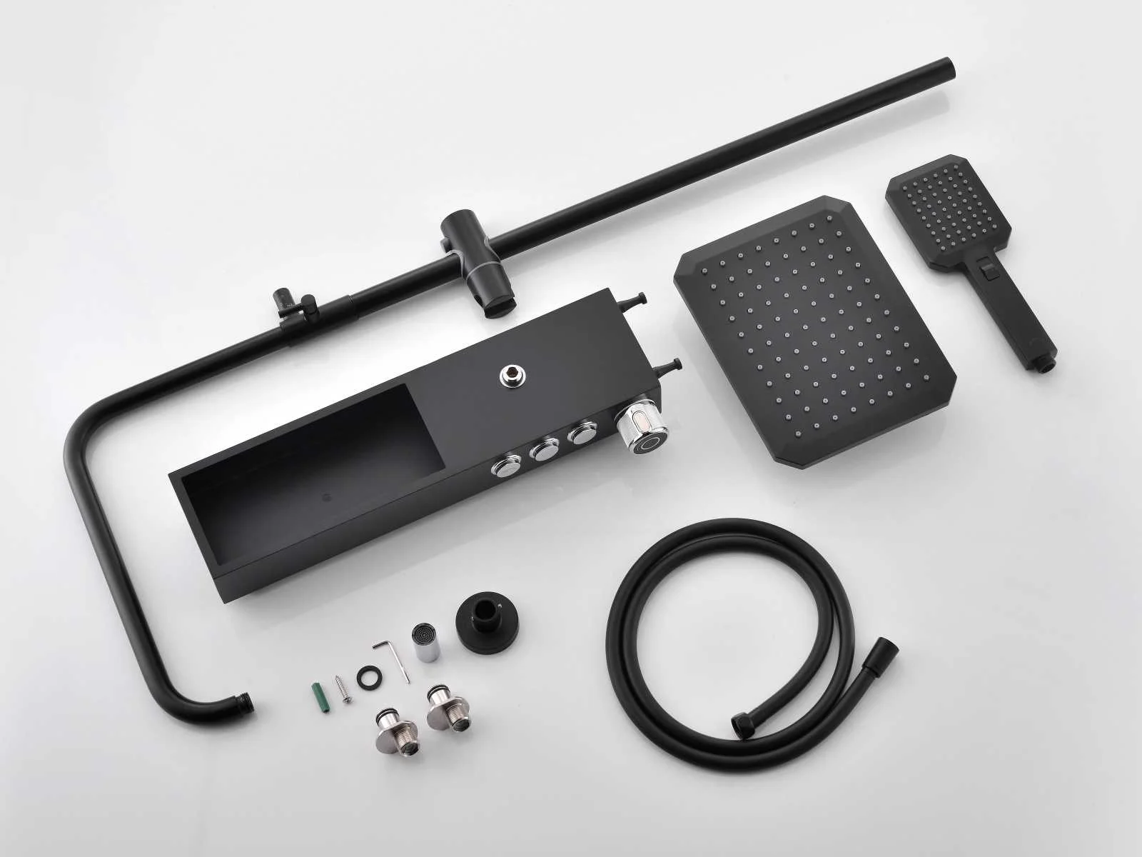 De doucheset is uitgerust met drie functies. De hoofddouche, handdouche (met twee standen) en een baduitloop. Deze functies worden afzonderlijk van elkaar gebruikt doormiddel van drukknoppen. Door de aanwezigheid van de baduitloop is deze doucheset ook geschikt voor douchebaden. De doucheset beschikt over keramische binnenwerken zodat je jarenlang plezier zult hebben van jouw regendoucheset. Doordat de doucheset in hoogte verstelbaar is past hij in vrijwel elke badkamer! De hartafstand van deze doucheset is 15cm. Materiaal: messing. Kleur: mat zwart (met chrome toetsen en baduitloop). Kraan: thermostaatkraan. Binnenwerk: keramisch. Douchekop: 26 x 20 cm. Handdouche: met 2 waterfuncties en doucheslang. In hoogte en draairichting verstelbare ophanging. Hoogte: verstelbaar. Voorzien van: 3 druktoetsen waarmee de 3 waterfuncties bediend kunnen worden. Douchekop met kunststof wateruitlopen om gemakkelijk kalkaanslag te verwijderen. Douchekop kantel en draaibaar. Keramisch binnenwerk. Bijzonderheden: h.o.h. afstand van 150mm. Merk: Mawialux Model: Anto Kleur: mat zwart/chroom