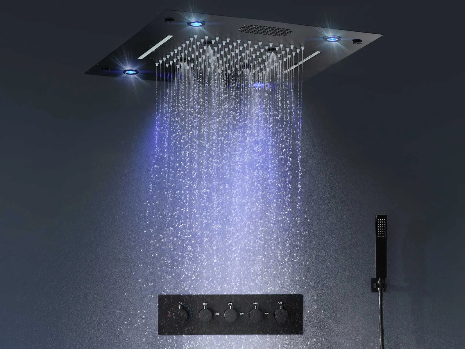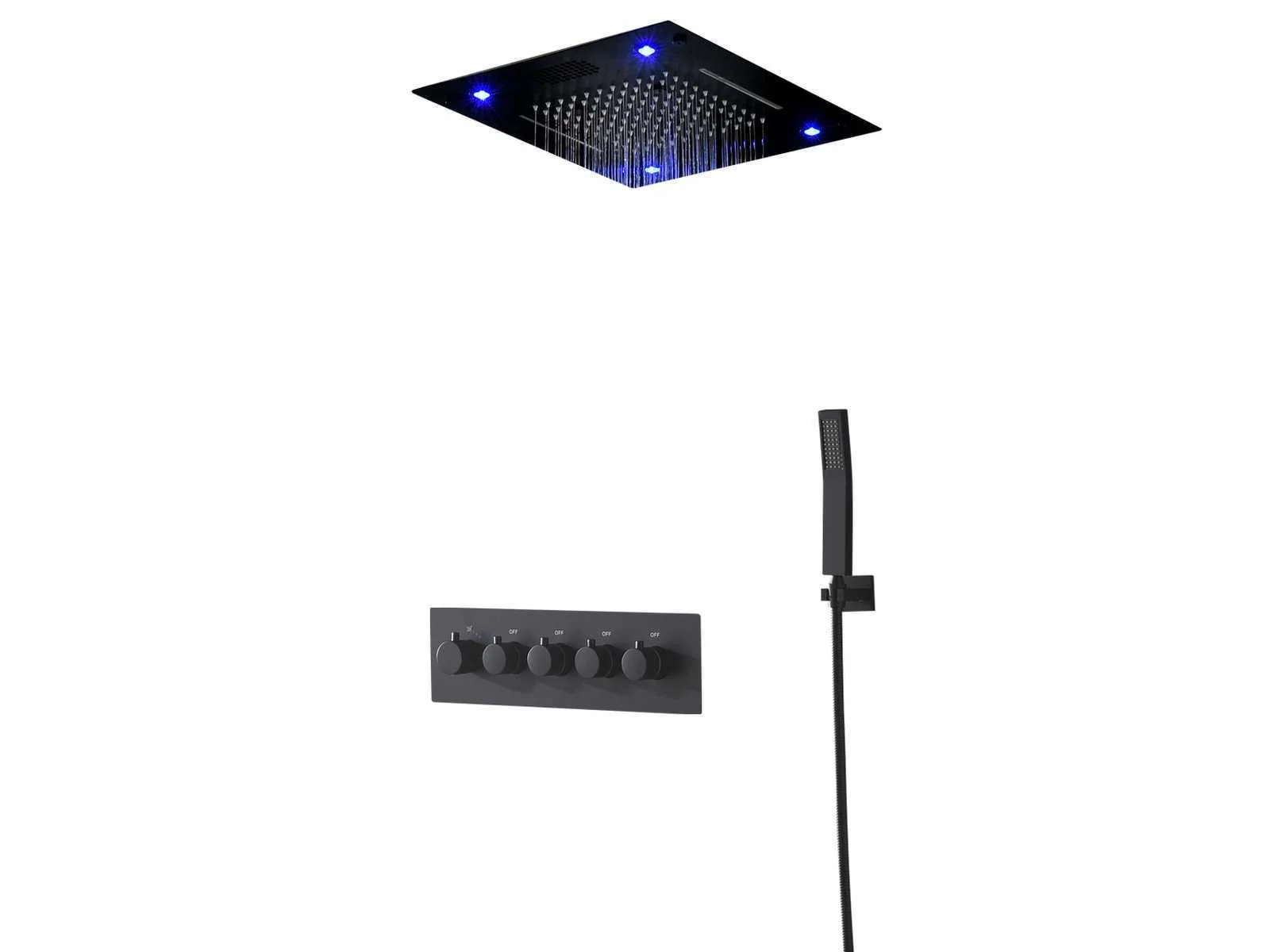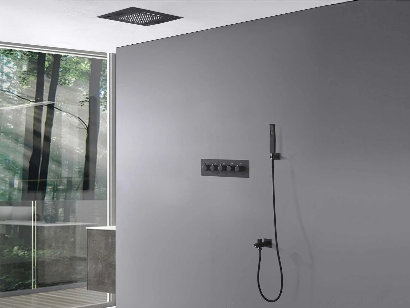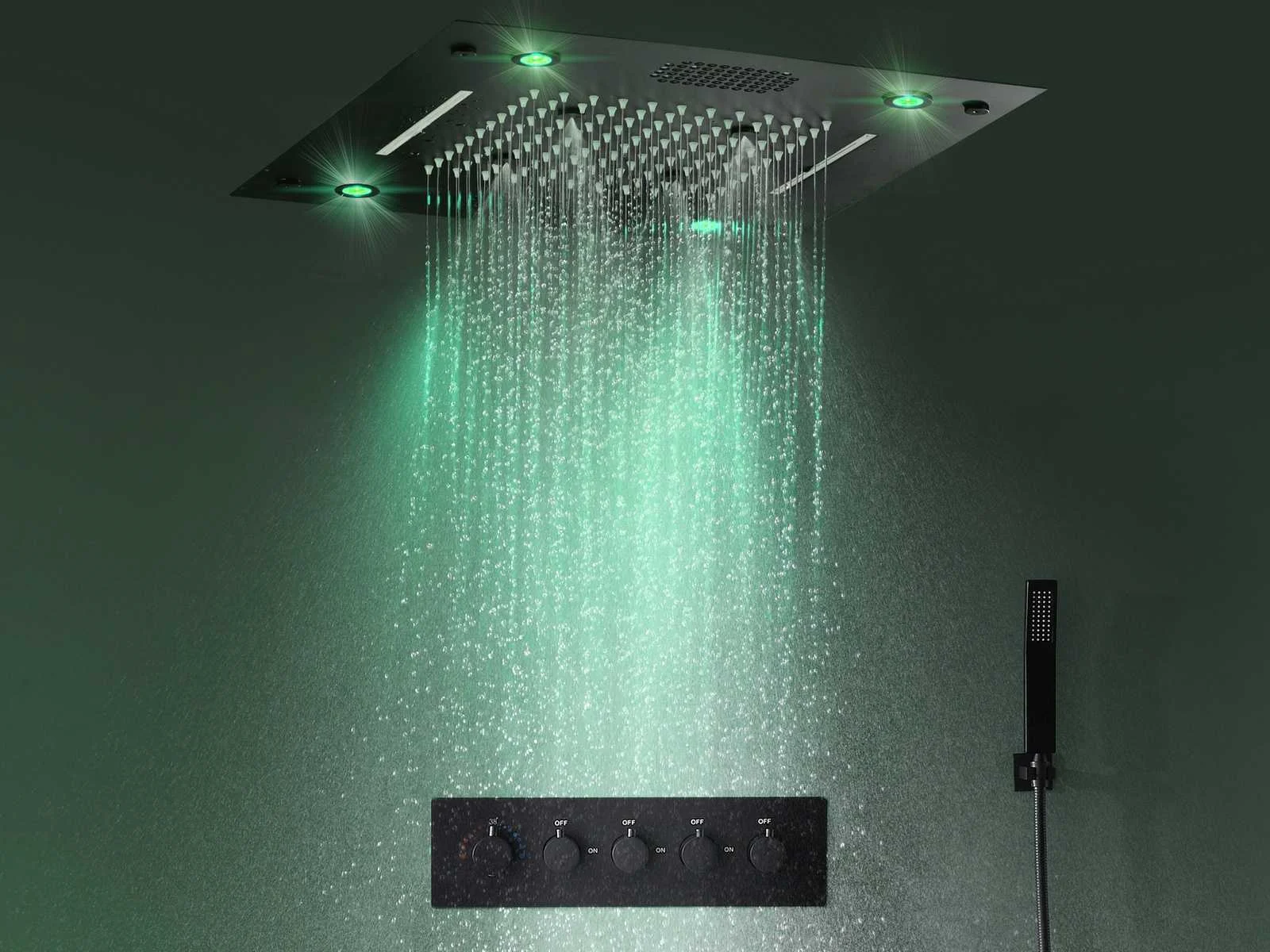 Inbouw regendouche met radio en ledverlichting, Materiaal messing en 304 rvs, Kraan smart control thermostaatkraan met 4 regelknoppen (houd de temperatuur altijd constant), Binnenwerk keramisch, Douchekop 40x40 cm met 3 functies uit 304 rvs en 4 stuks ledverlichting, Handdouche verstelbaar met doucheslang en messing ophanging, Voorzien van ingebouwde bluetooth met 2 speakers, douchekop met 3 functies regendouche met 2 watervallen en 4 stuks vernevelaars, badkraan uitloop, 4 stuks ledverlichting met instelbare kleuren welke bedienbaar zijn met de meegeleverde afstandsbediening, kunststof wateruitlopen om gemakkelijk kalkaanslag te verwijderen, keramisch binnenwerk goed voor 800.000 keer open/dicht zonder lekkage, plaatdikte: 12 UM, werkdruk: 2-16kgf/cm2, werking temperatuur: 0 tot 90 graden Celsius, anti kalk behandeld, Conditie: Nieuw, Bijzonderheden 2 jaar garantie, hoge kwaliteit, alle water functies kunnen allemaal tegelijk of onafzondelijk gebruikt/geregeld worden Handdouche: verstelbaar met doucheslang en messing ophanging. Voorzien van: 4 stuks LED verlichting in de douchekop welke met externe voeding te bedienen is (voeding meegeleverd). Douchekop met 2 functies: vernevelaar en regendouche. Kunststof wateruitlopen om gemakkelijk kalkaanslag te verwijderen. Keramisch binnenwerk. Merk: Mawialux Model: Tiger Kleur: Mat zwart Lengte: 40cm Breedte: 40cm