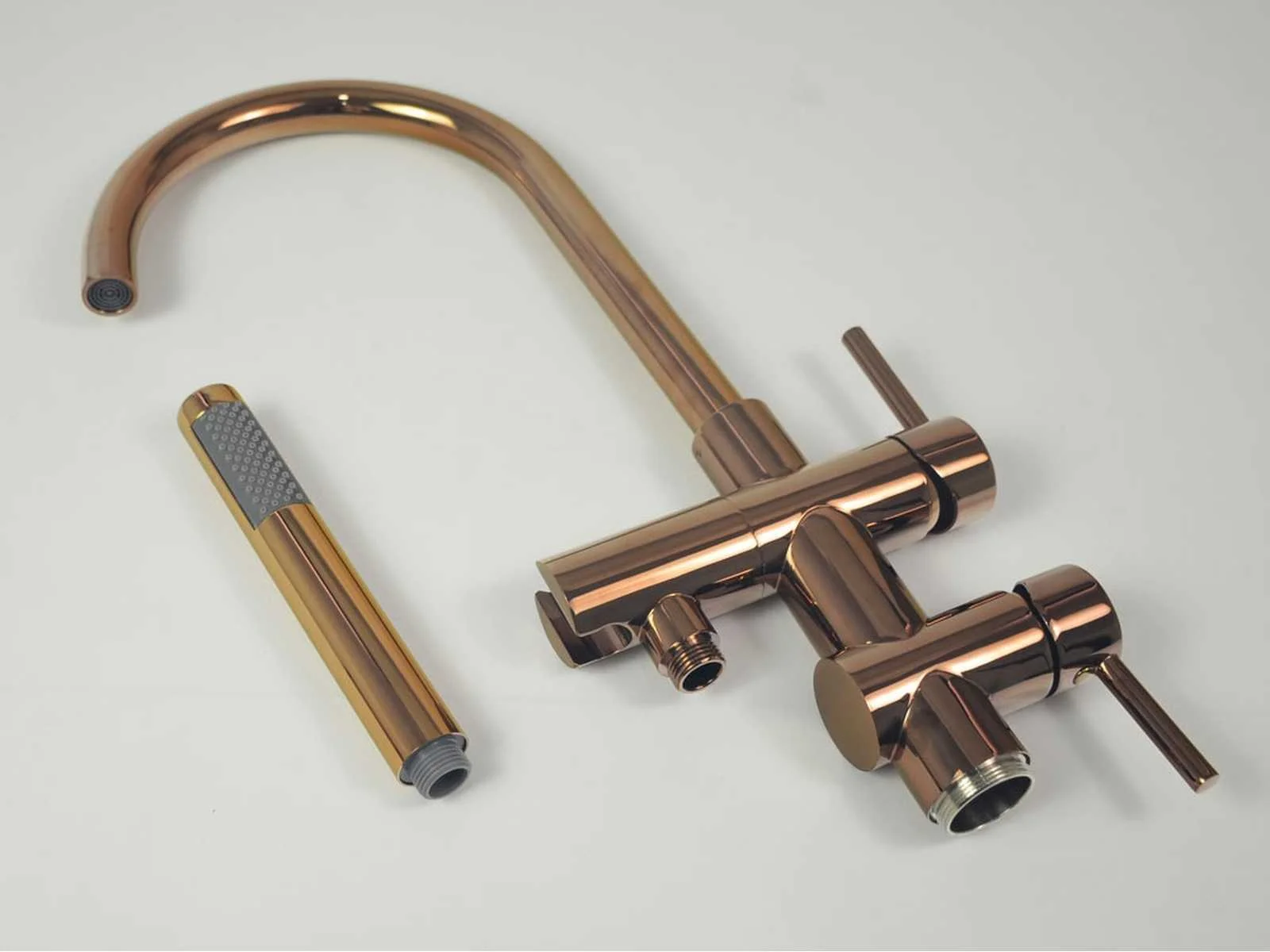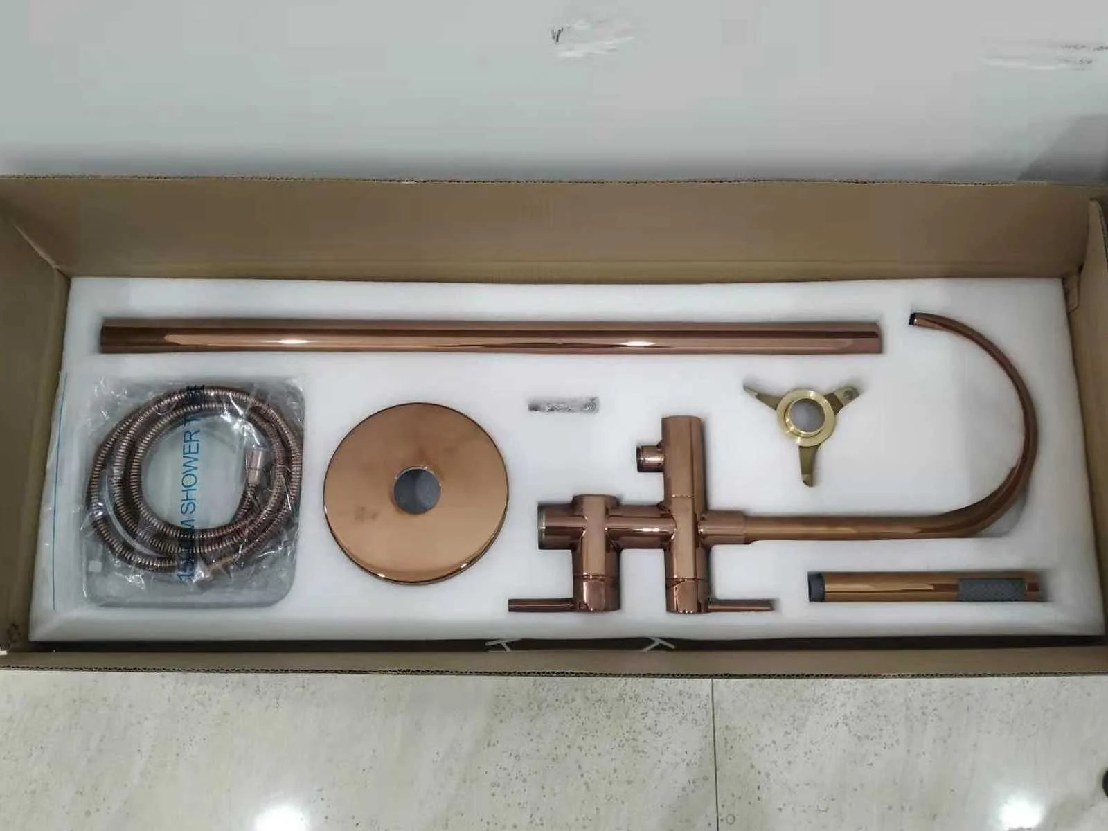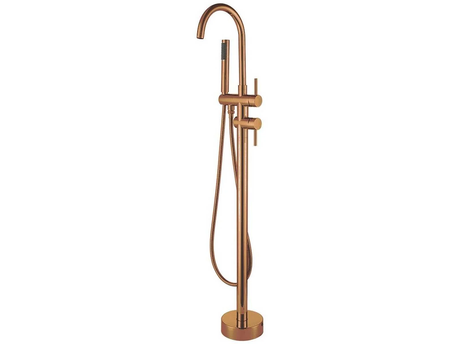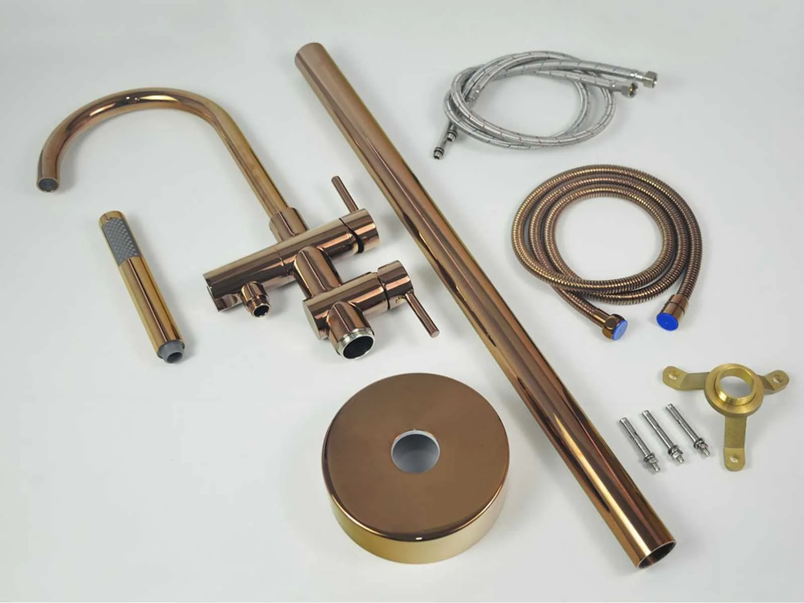 Materiaal messing, keuze kleuren; mat zwart, chroom, geborsteld rvs, rose goud of koper (kleurkeuze aangeven op de afhaaldag), Binnenwerk keramisch, Hoogte 110 cm, Handdouche ja met flexibele doucheslang en verstelbare ophanging, Voorzien van mengkraan, hendel voor schakeling tussen Handdouche of badkraanuitloop, vloerplaat, waterleidingen, aansluitmateriaal Merk: Mawialux Model: Madrid Kleur: beschikbaar in 4 kleuren