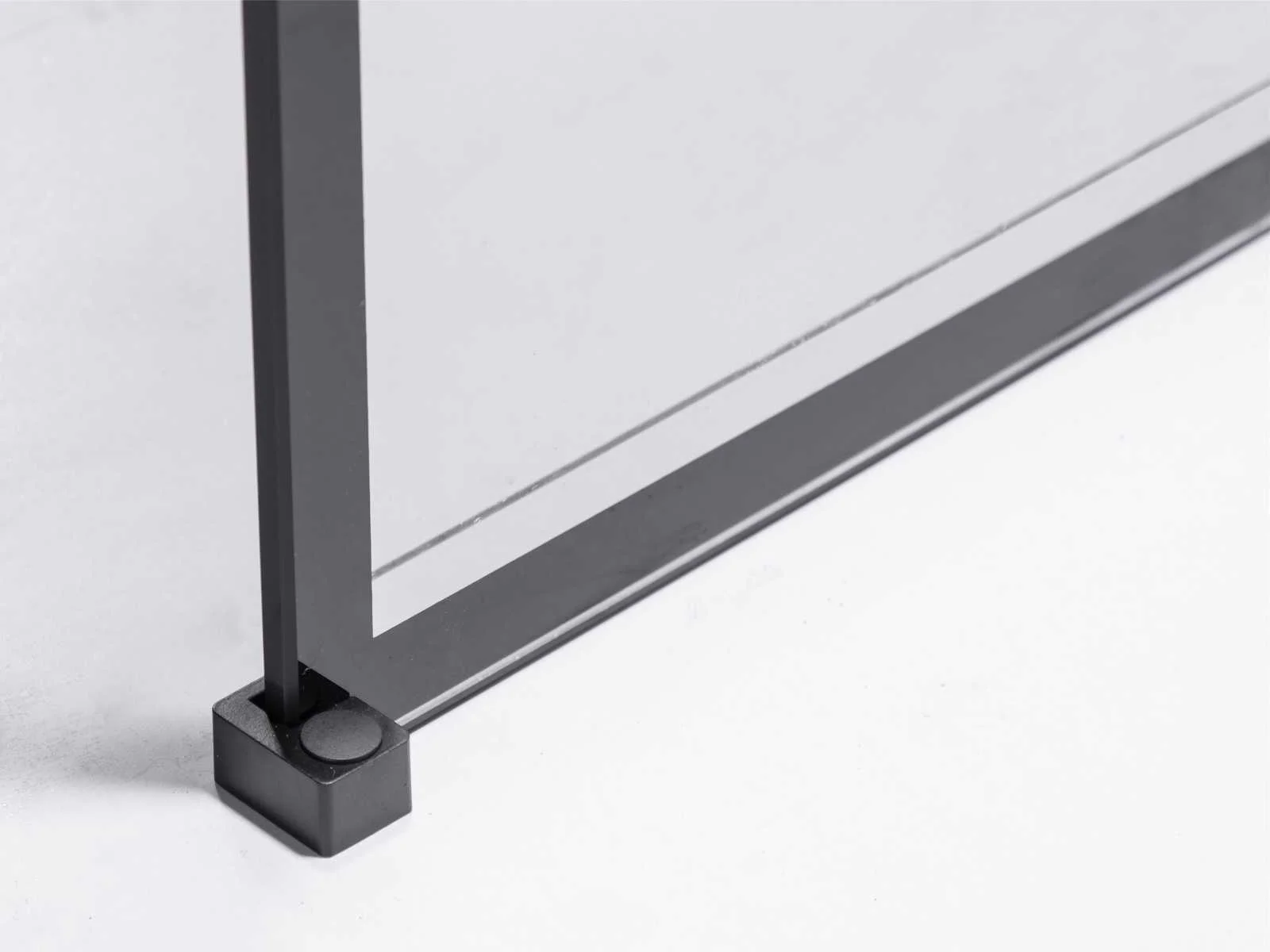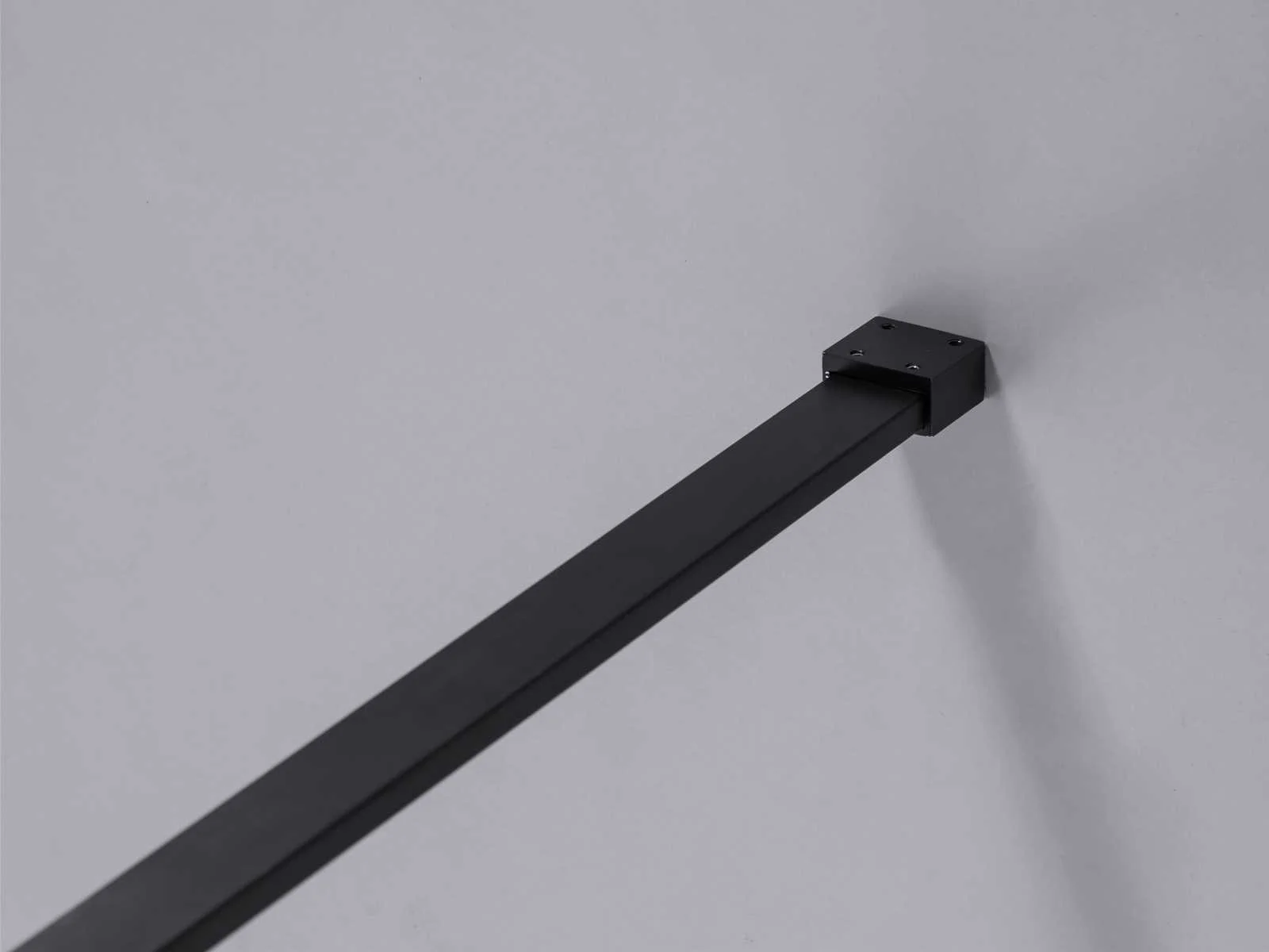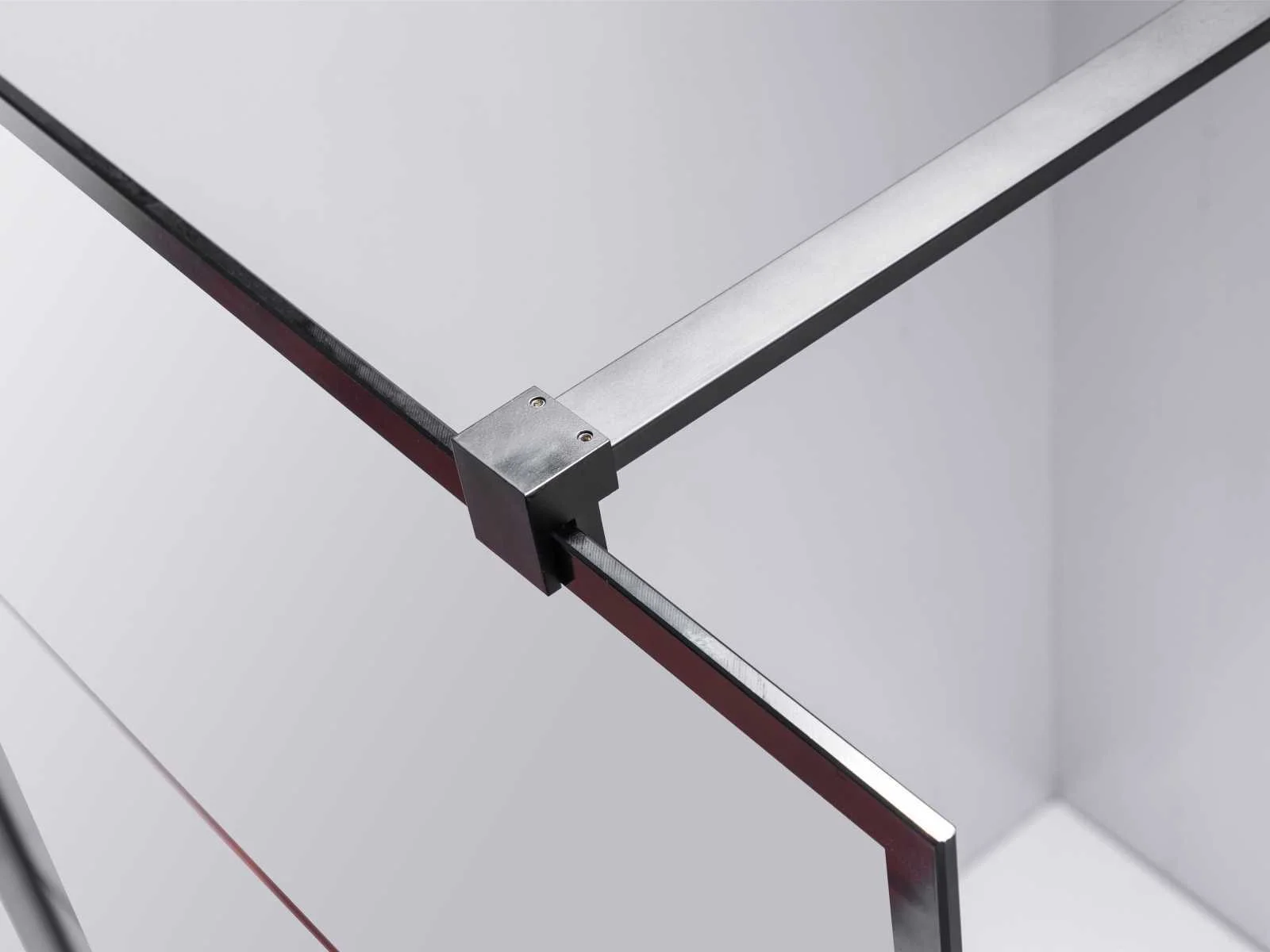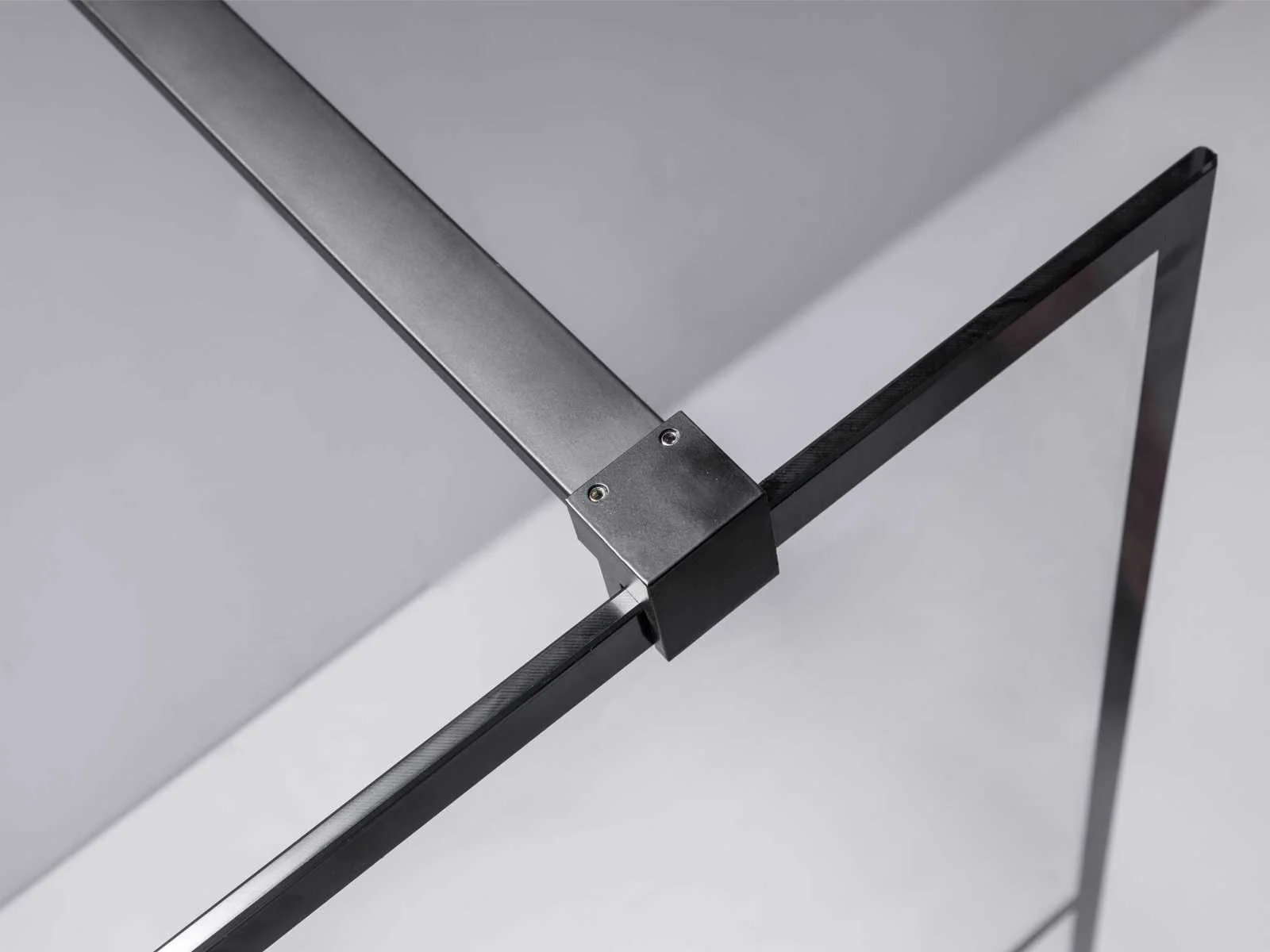 Kleur mat zwart met mat zwart frame rondom glas, materiaal aluminium profiel met messing ophanging (mat zwart), glas 8mm dik helder nano gecoat veiligheidsglas (vermindert kalkaanslag doordat het water niet op het opervlak kan hechten), voorzien van onzichtbare schroefbevestiging - extra hoek verstevigingsblok voor vloer (mat zwart, compleet met bevestiging materiaal - inclusief mat zwarte waterstrip voor vloer onder de wand - vierkante mat zwarte bevestiging stang van messing 120cm (in te korten naar gewenste maat), wandprofiel 20 mm verstelbaar Merk: Mawialux Model: Tampa Breedte: 80cm Hoogte: 195cm