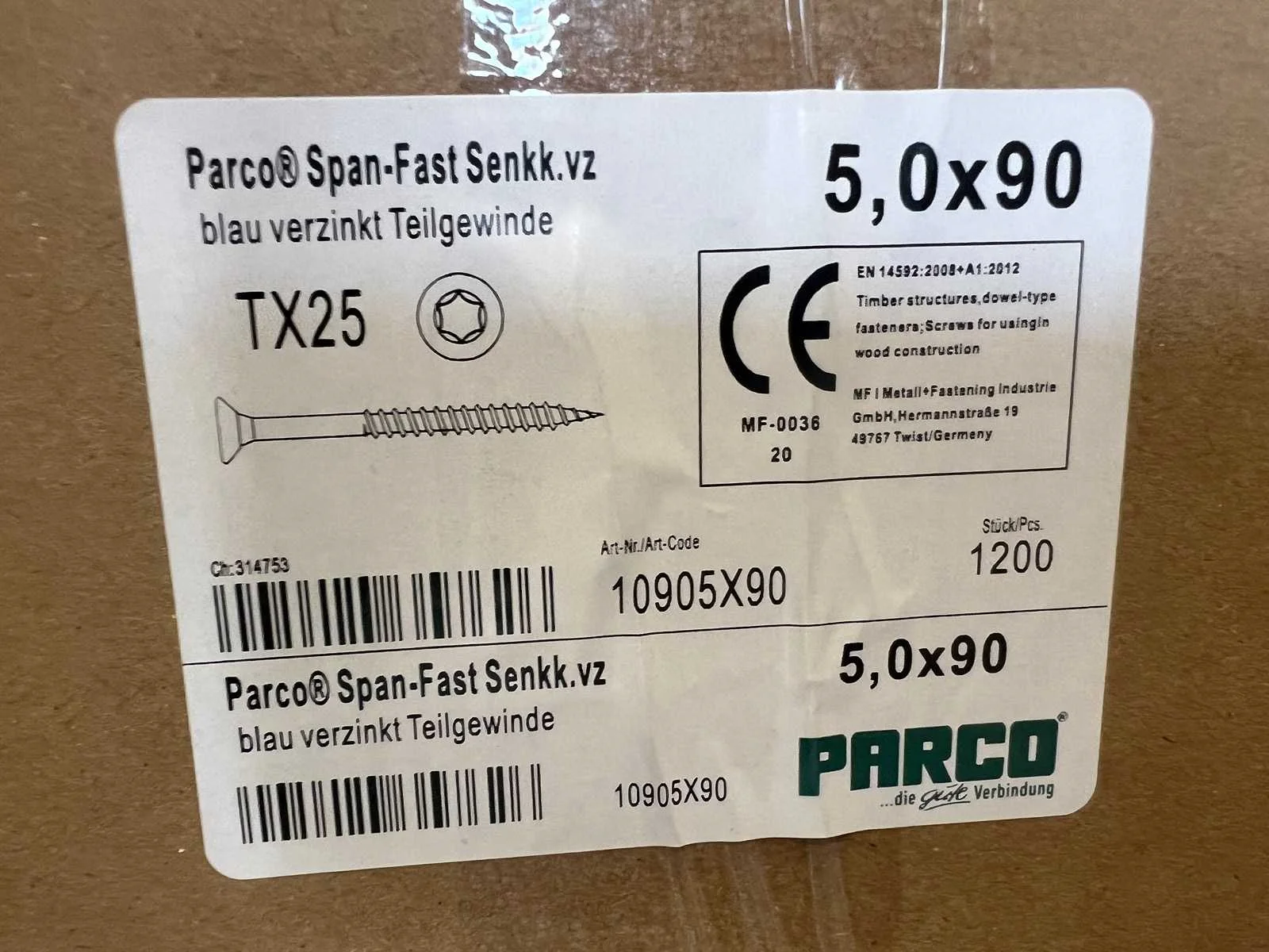 (12000X) PARCO® Spaanplaatschroeven 4,0 x 30 mm Span-Fast blauw verzinkt - TX20. (6000X) PARCO® Spaanplaatschroeven 4,0 x 40mm Span-Fast blauw verzinkt - TX20 (4800X) PARCO® Spaanplaatschroeven 4,0 x 50mm Span-Fast blauw verzinkt deeldraad - TX20 (2400X) PARCO® Spaanplaatschroeven 4,0 x 60 Span-Fast blauw verzinkt deeldraad - TX20 (2400X) PARCO® Spaanplaatschroeven 4,0 x 70mm Span-Fast blauw verzinkt deeldraad - TX20 (1200X) PARCO® Spaanplaatschroeven 5,0 x 80 Span-Fast blauw verzinkt deeldraad - TX25 (1200X) PARCO® Spaanplaatschroeven 5,0 x 90 Span-Fast blauw verzinkt deeldraad - TX25 (1200X) PARCO® Spaanplaatschroeven 5,0 x 100 Span-Fast blauw verzinkt deeldraad - TX25 (1200X) PARCO® Spaanplaatschroeven 6,0 x 120 Span-Fast blauw verzinkt deeldraad - TX30 Within 14 days