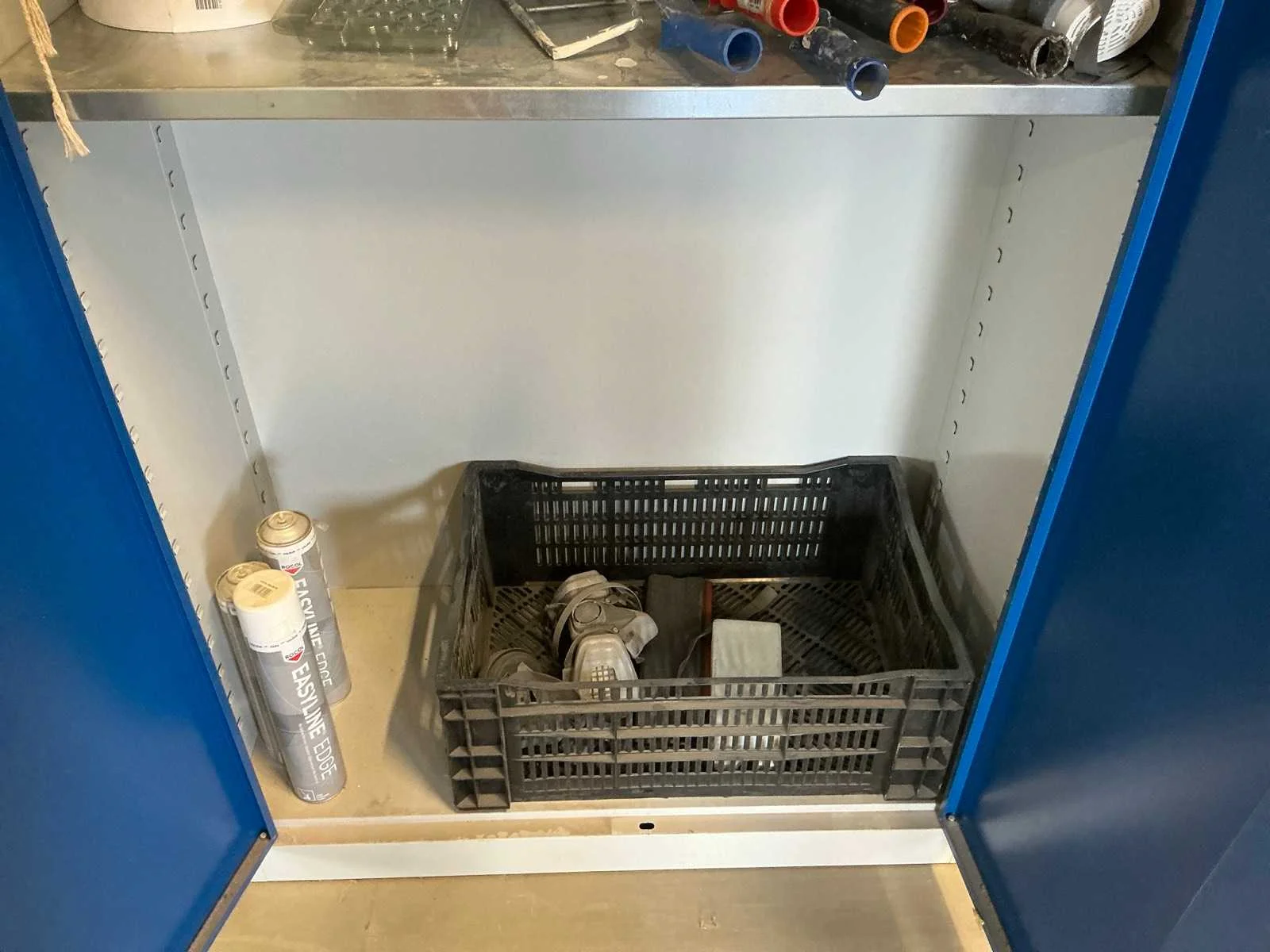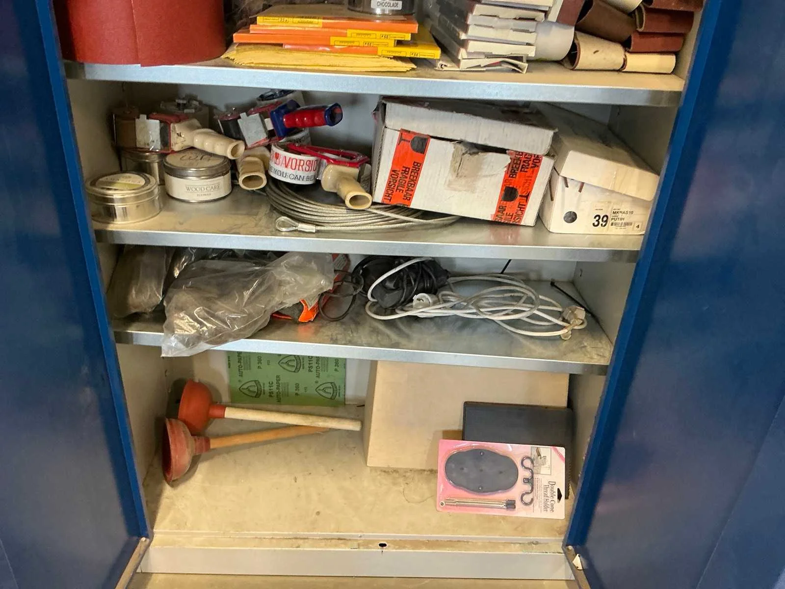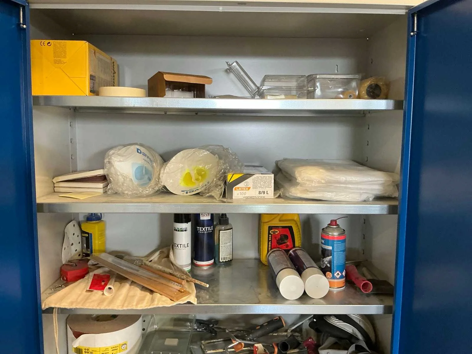 Zonder sleutel; met inhoud; inhoud bestaande uit diverse handgereedschappen en divers meubelbeslag Lengte: 42 Breedte: 93cm Hoogte: 195cm