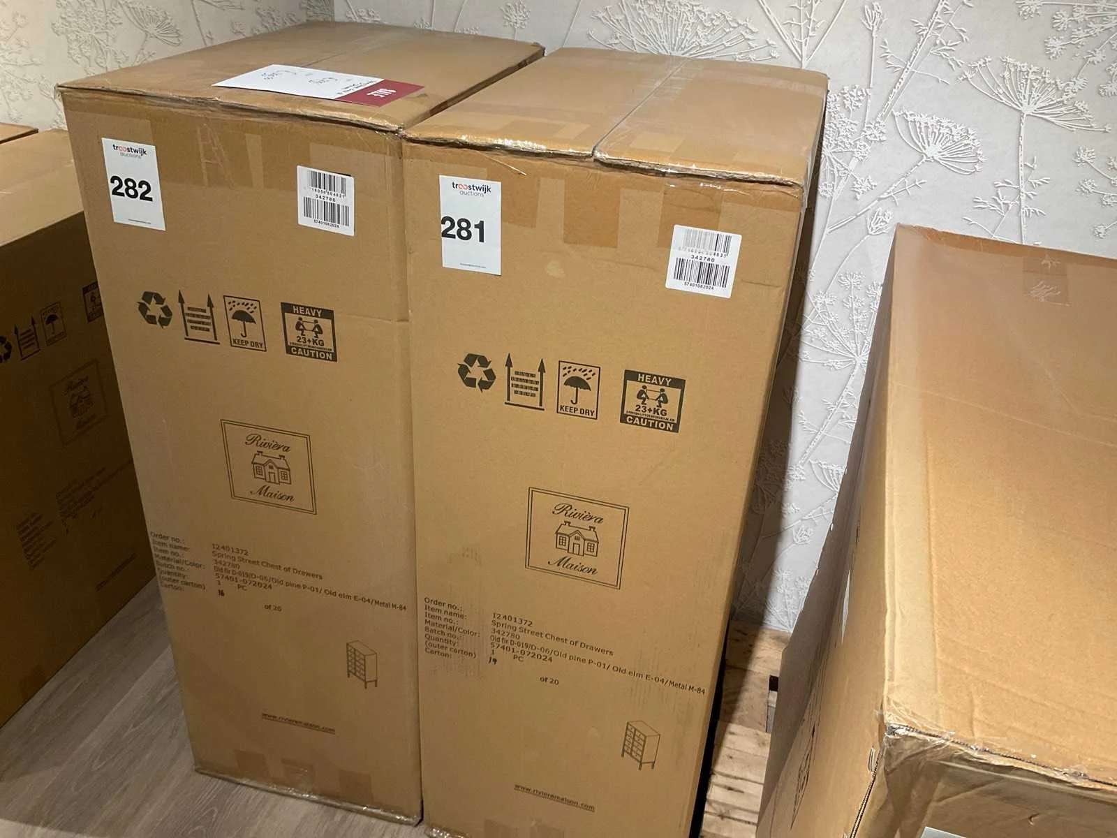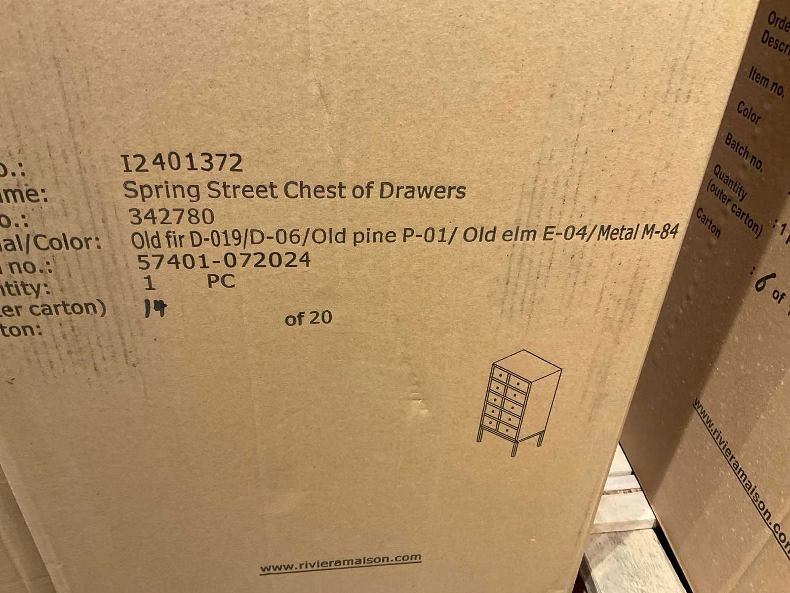 In doos. Merk: Rivièra Maison Model: Spring street chest of drawers Lengte: 55cm Breedte: 35cm Hoogte: 115cm