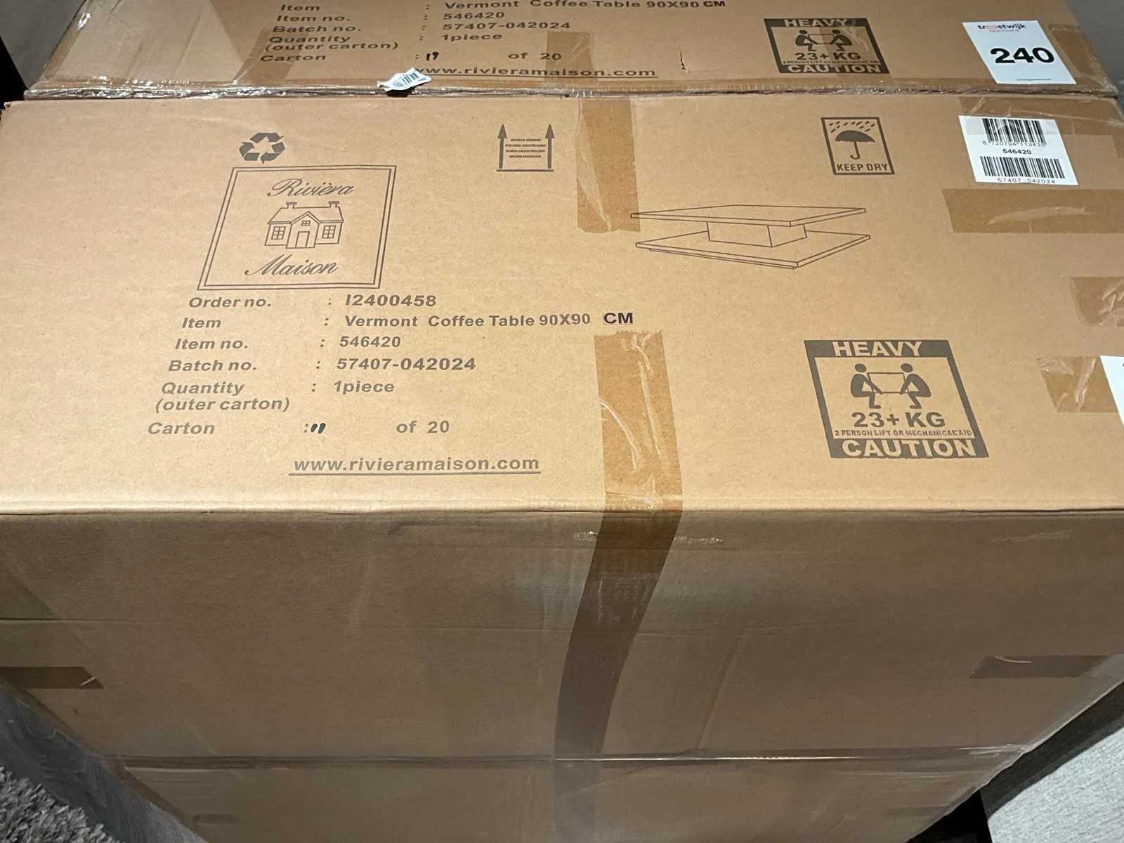 In doos Merk: Rivièra Maison Model: Vermont Lengte: 90cm Breedte: 90cm Hoogte: 35cm Materiaal: Gerecycled eikenhout