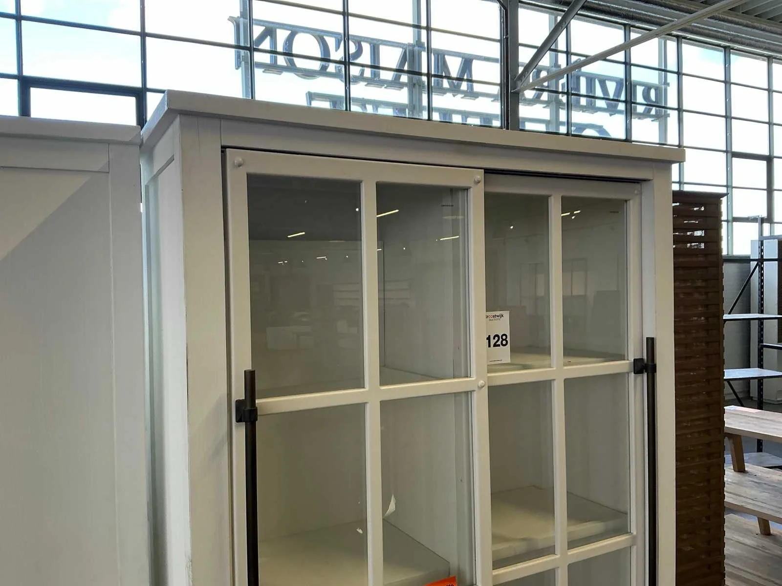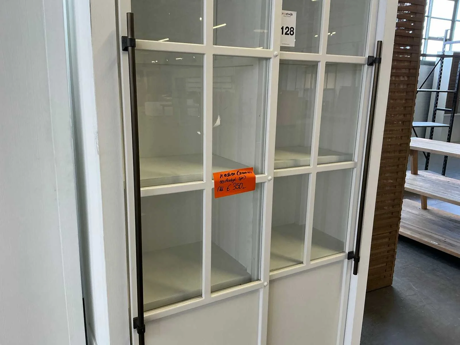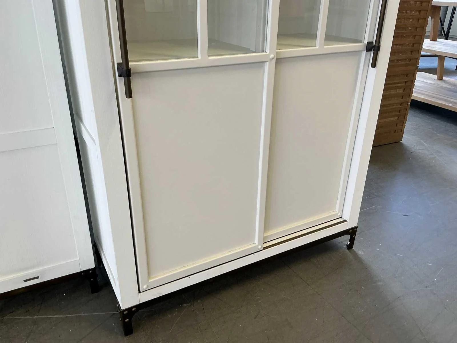 2 schuifdeuren met glazen ruiten. Merk: Rivièra Maison Model: Oliviera Kleur: Wit Lengte: 106cm Breedte: 43cm Hoogte: 214cm Materiaal: Metaal / glas