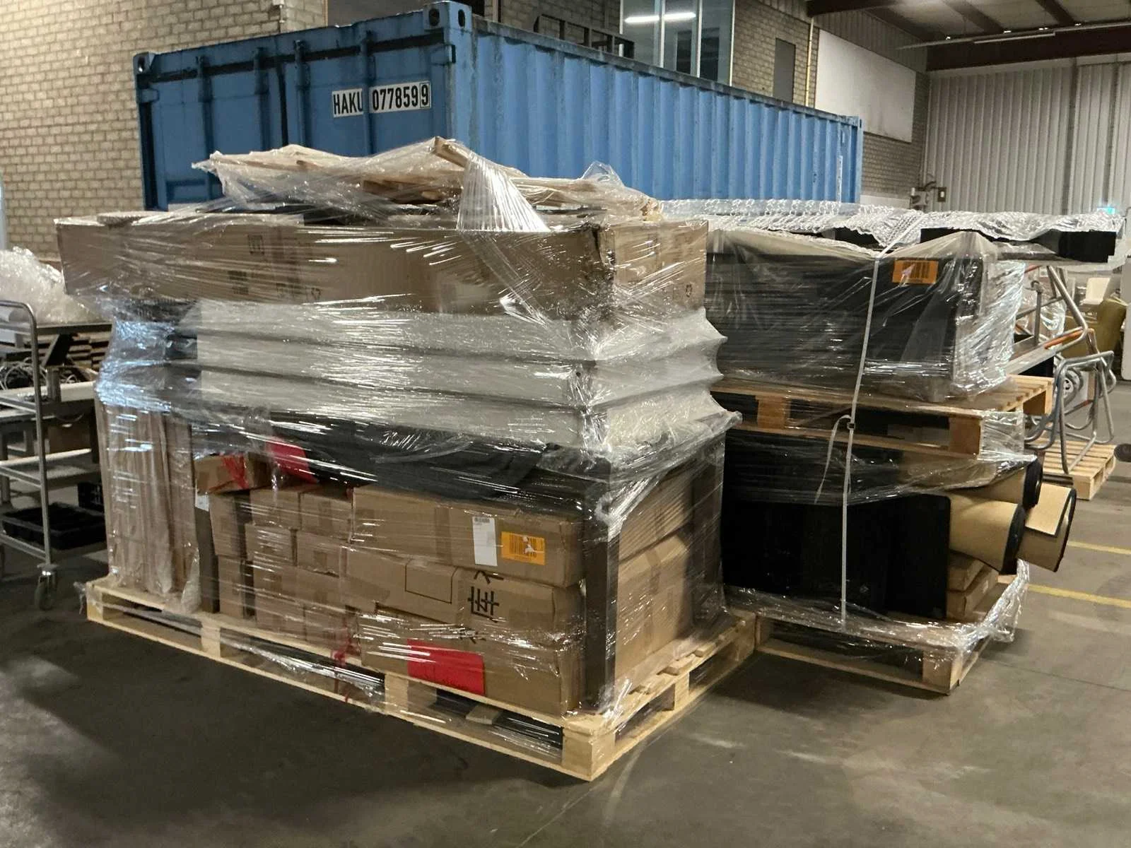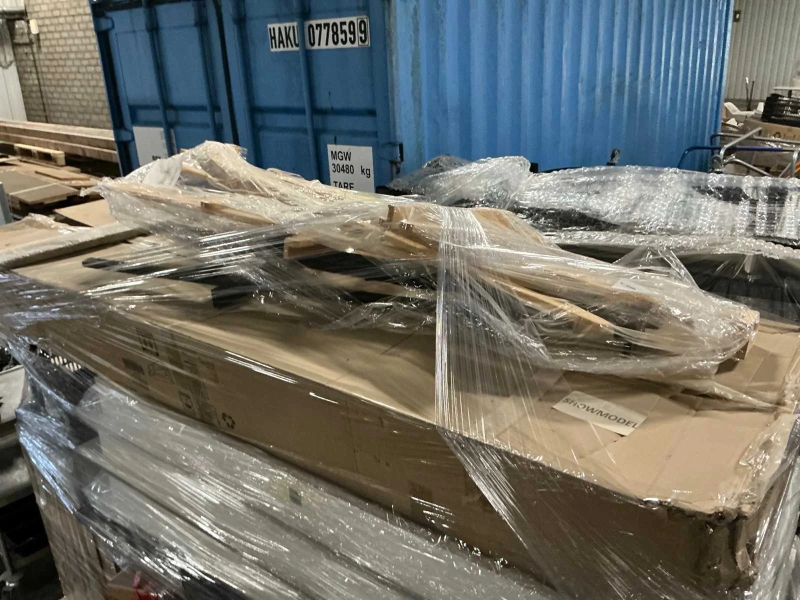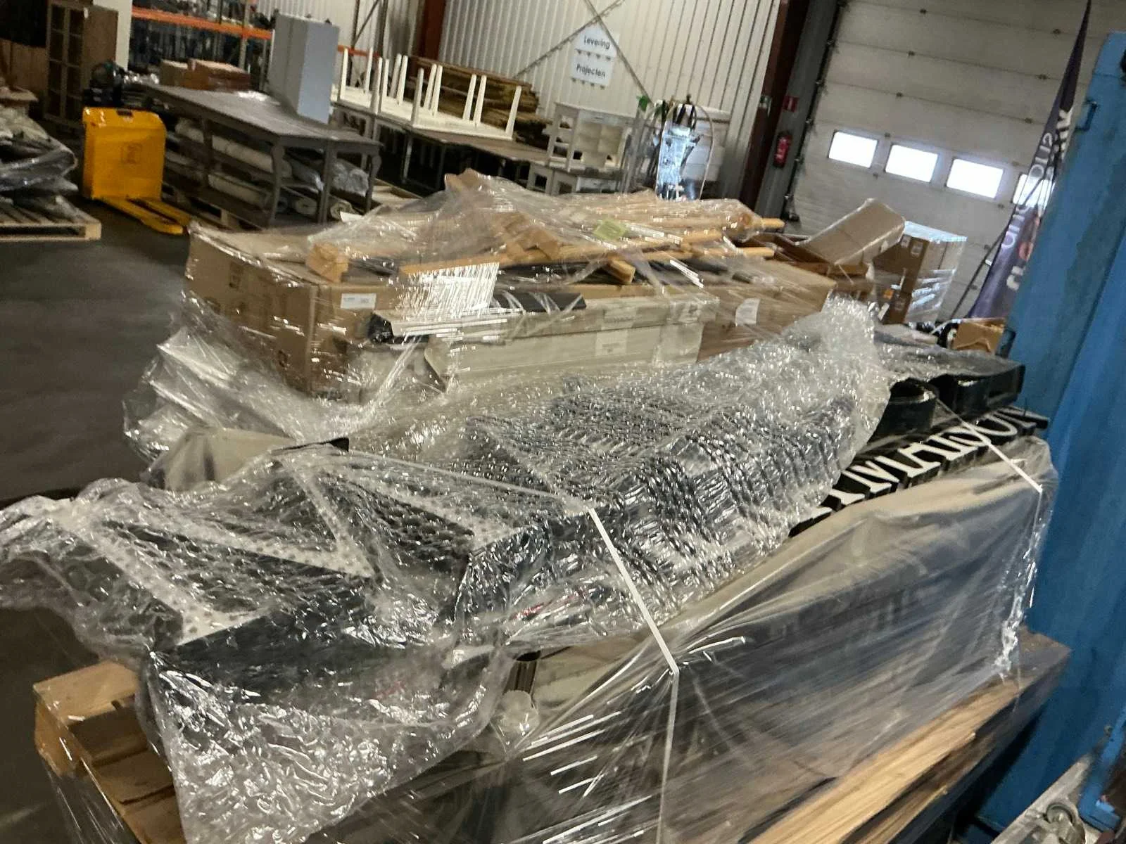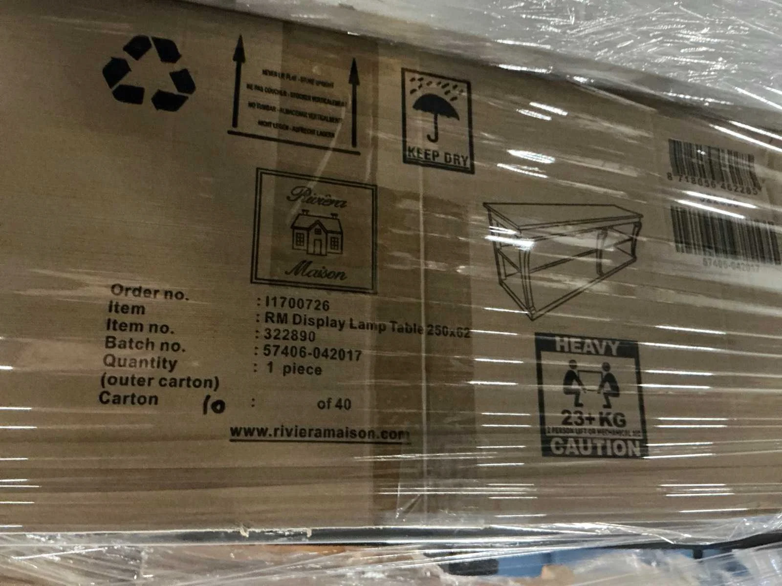 Bestaande uit 2 pallets met onder andere: Rivièra Maison borden, 2 bedden, 3 tapijten, 4 Rivièra Maison tafels, Rivièra Maison Display Lamp Table, 2 schildersezels en reserveonderdelen. Merk: Rivièra Maison