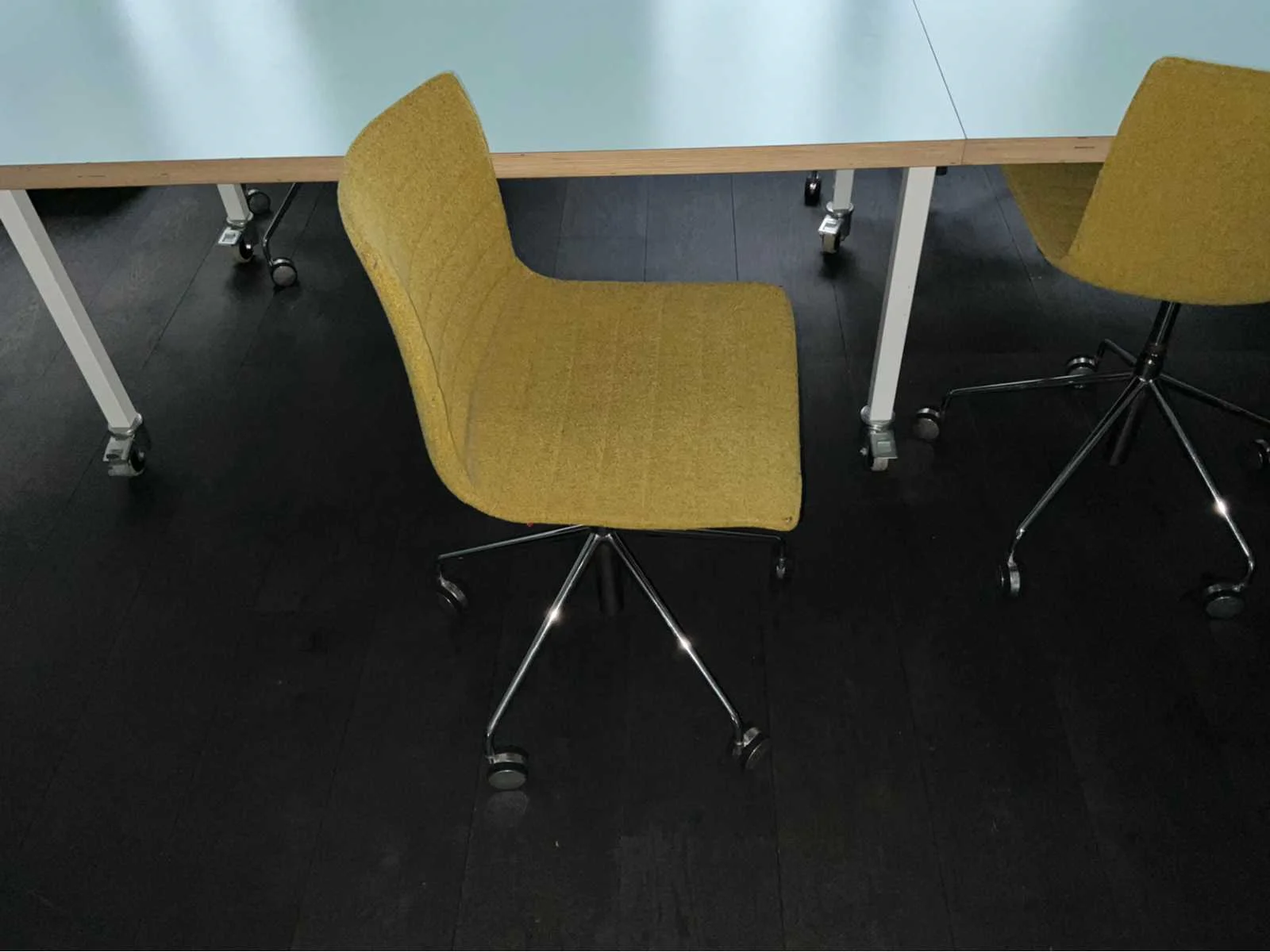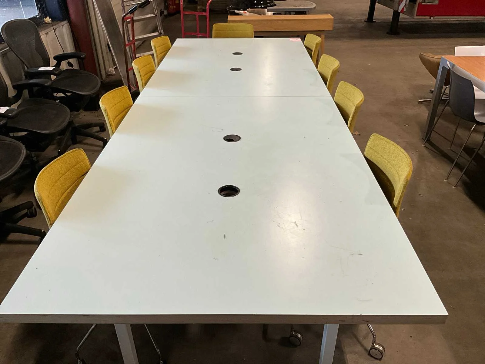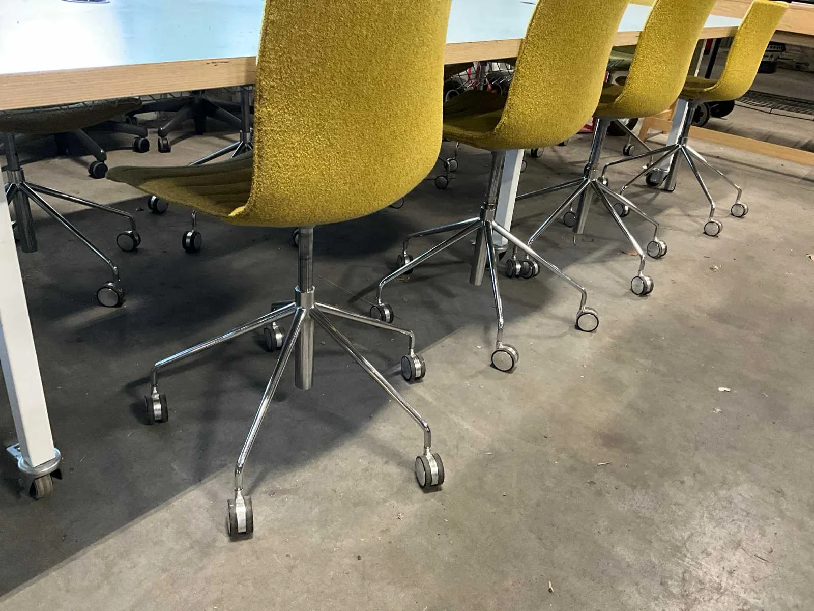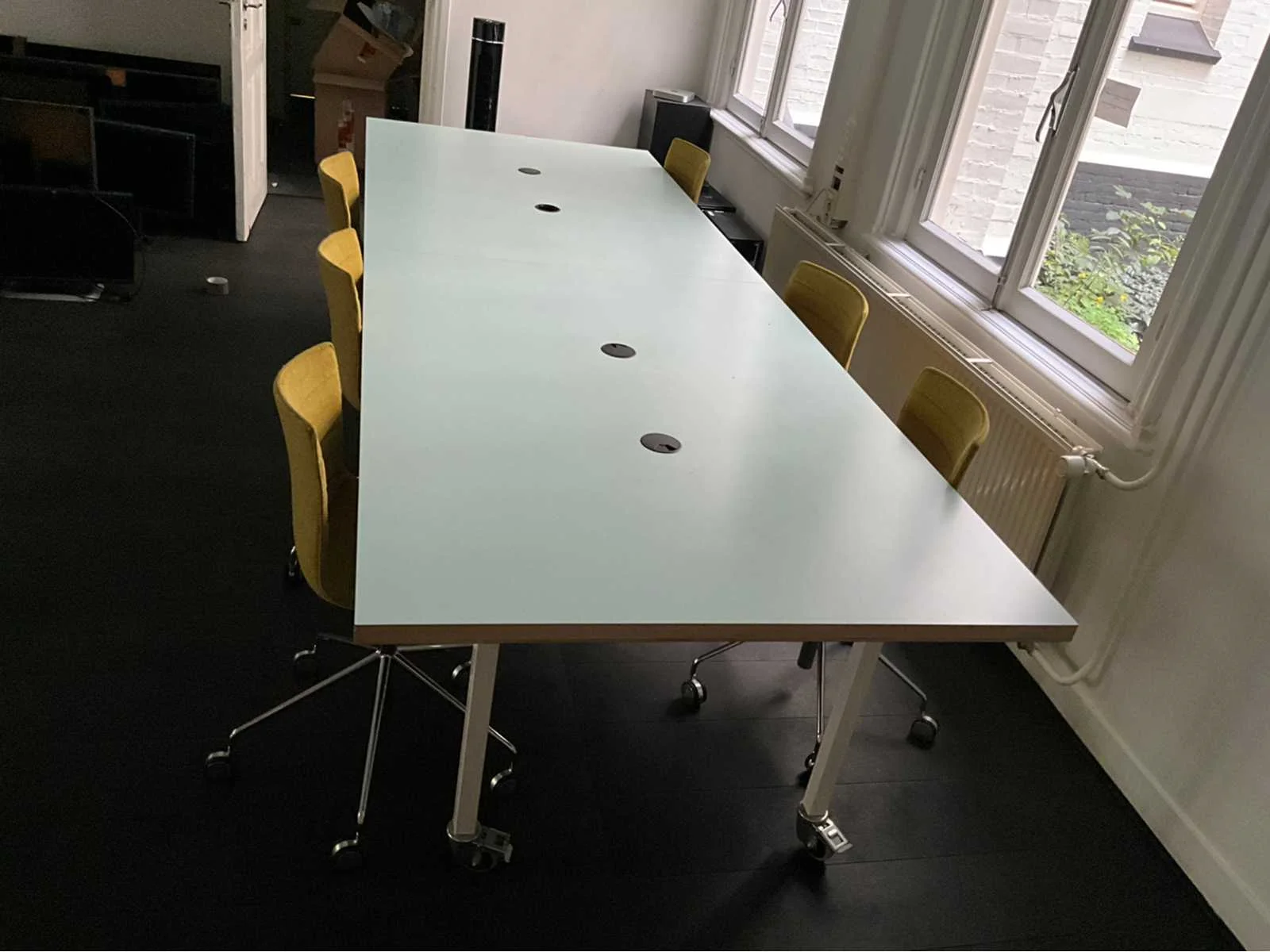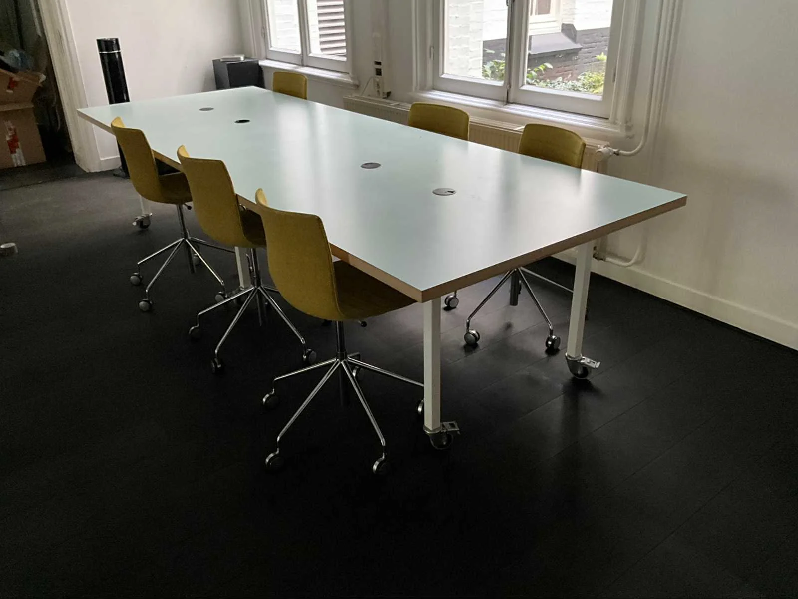 Waaronder mobiele vergadertafel afmeting 120x337x77 Cm voorzien van wit stalen onderframen en 6 zwenkwielen met 9 stuks gestoffeerde Arper bureaustoelen