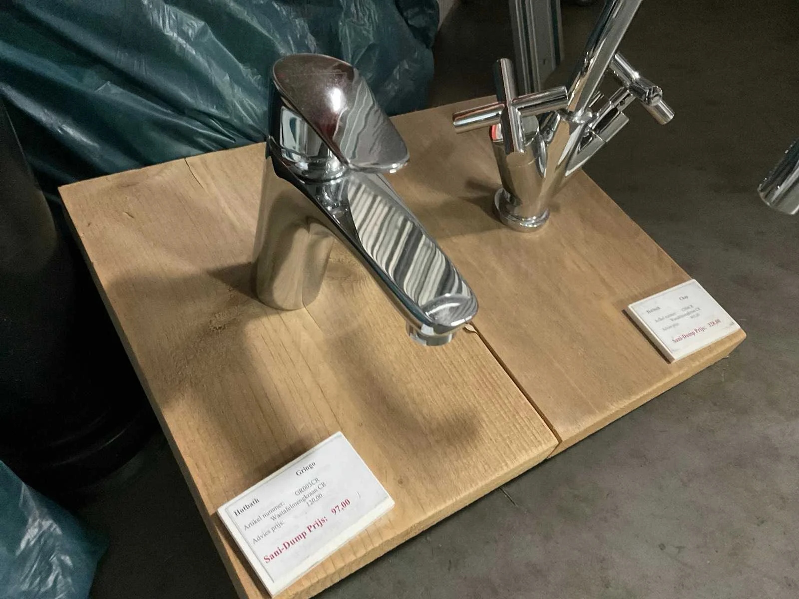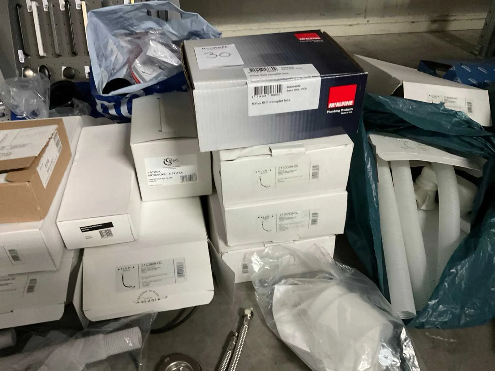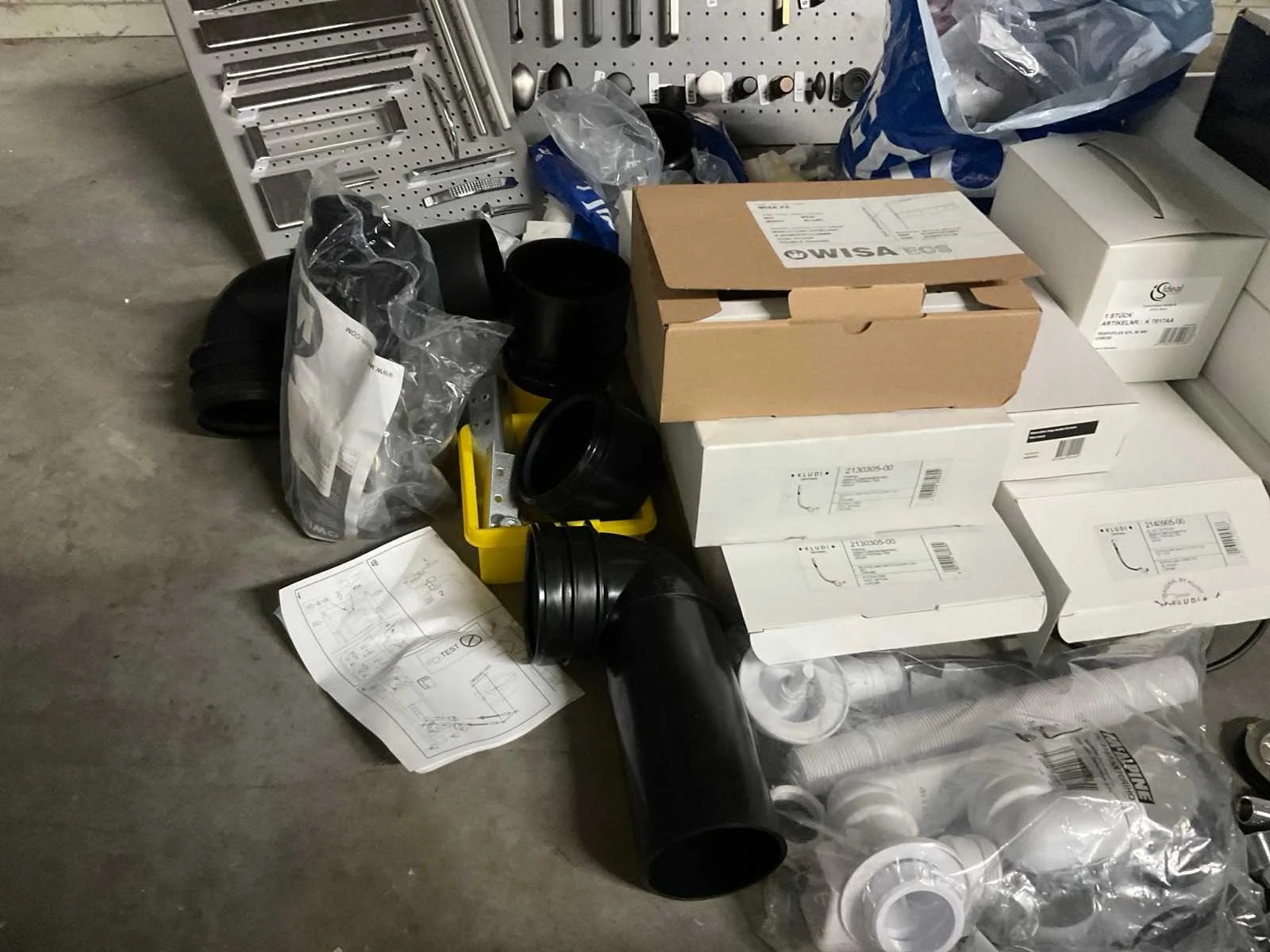 Bestaande uit diverse onderdelen en aansluitmaterialen, waaronder toilet aansluiting, showmodel kranen zonder binnenwerk, demo grepen op wandbord