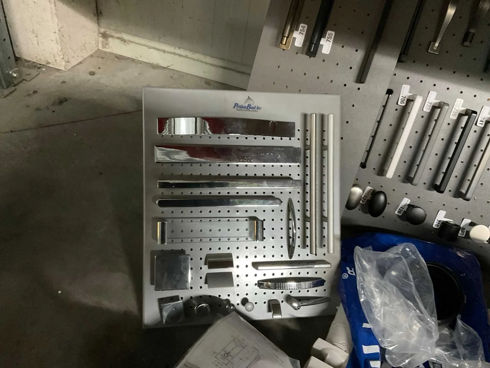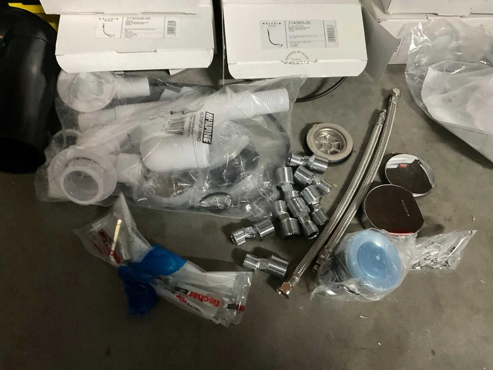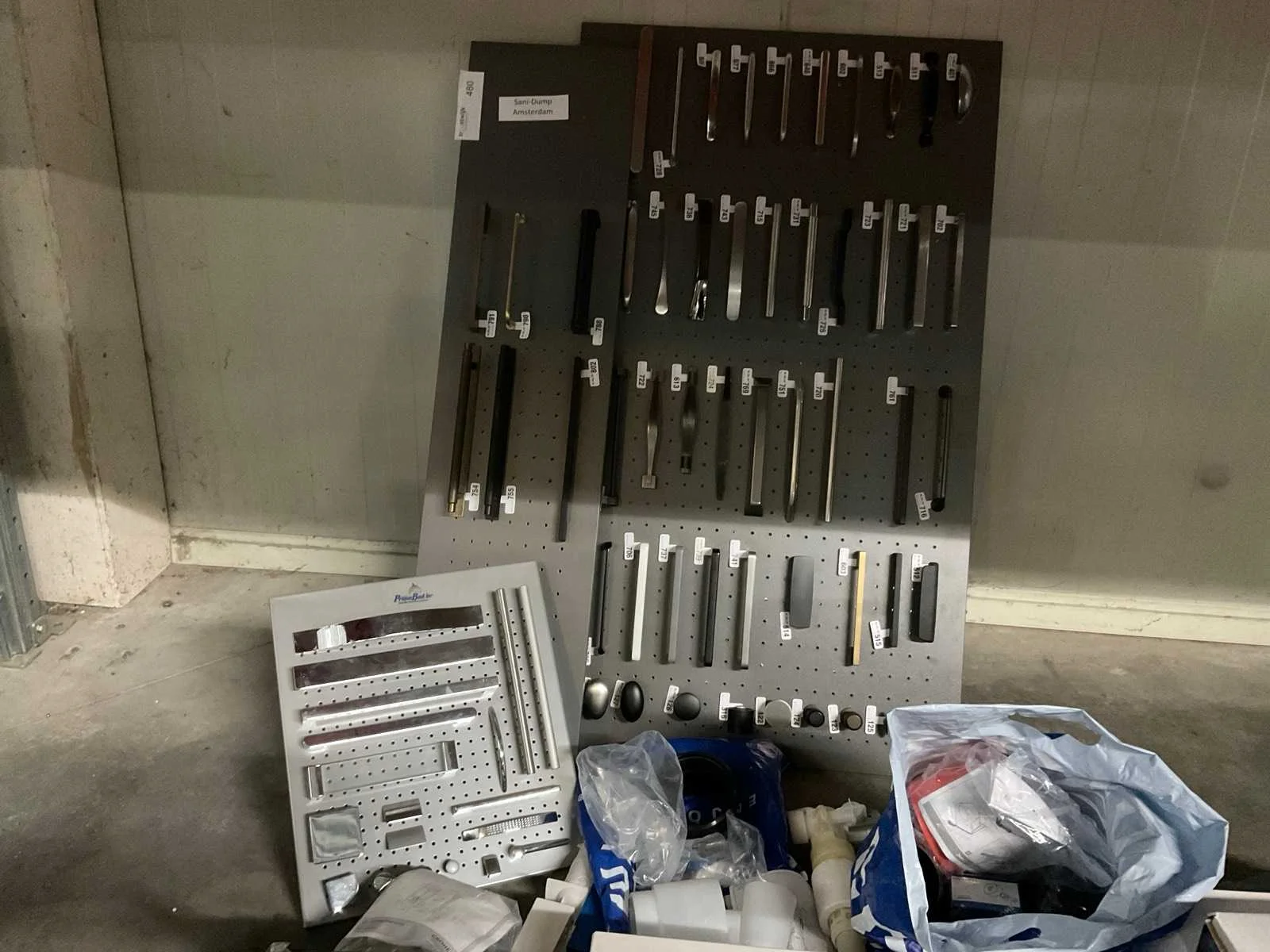 Bestaande uit diverse onderdelen en aansluitmaterialen, waaronder toilet aansluiting, showmodel kranen zonder binnenwerk, demo grepen op wandbord