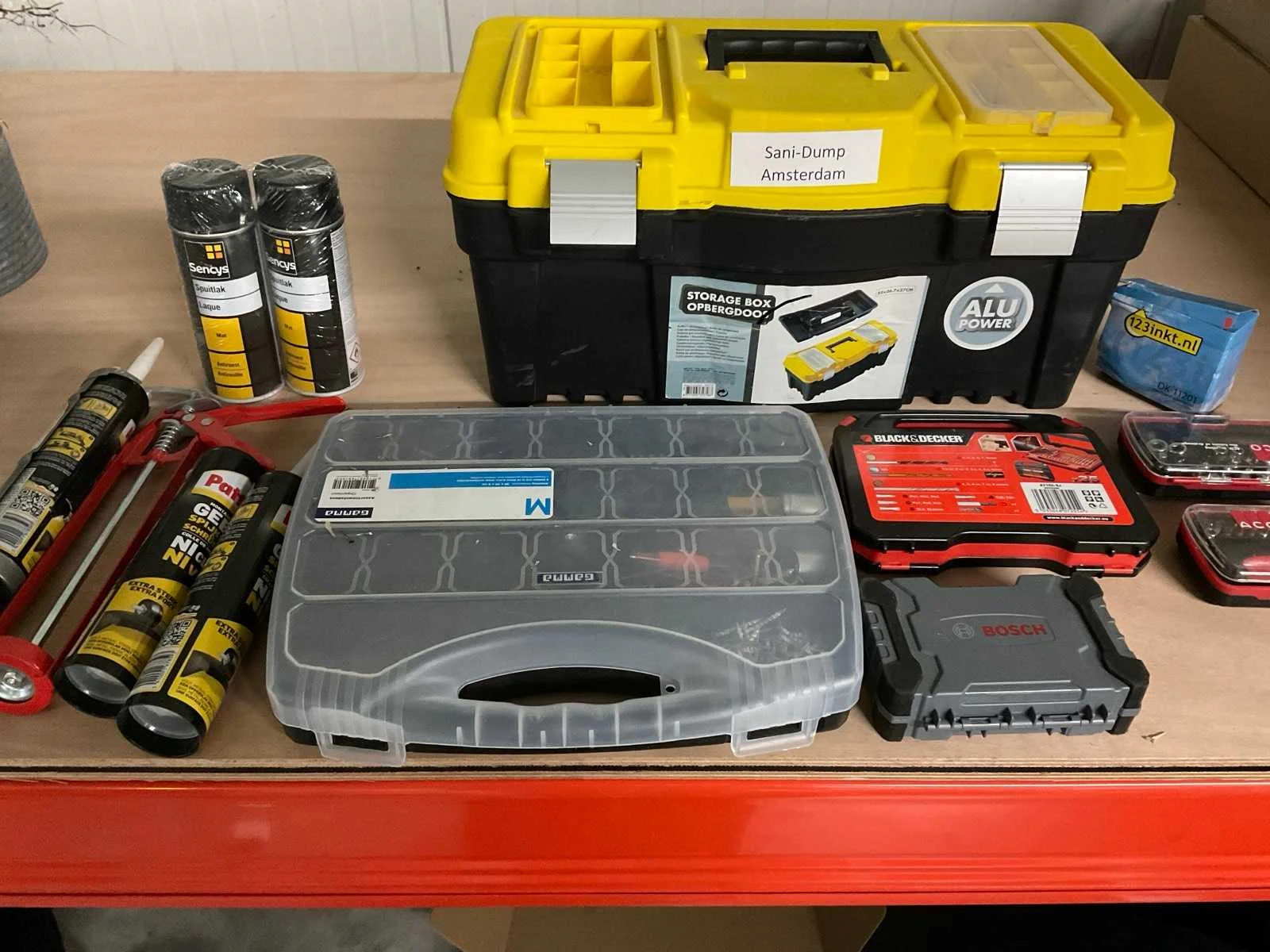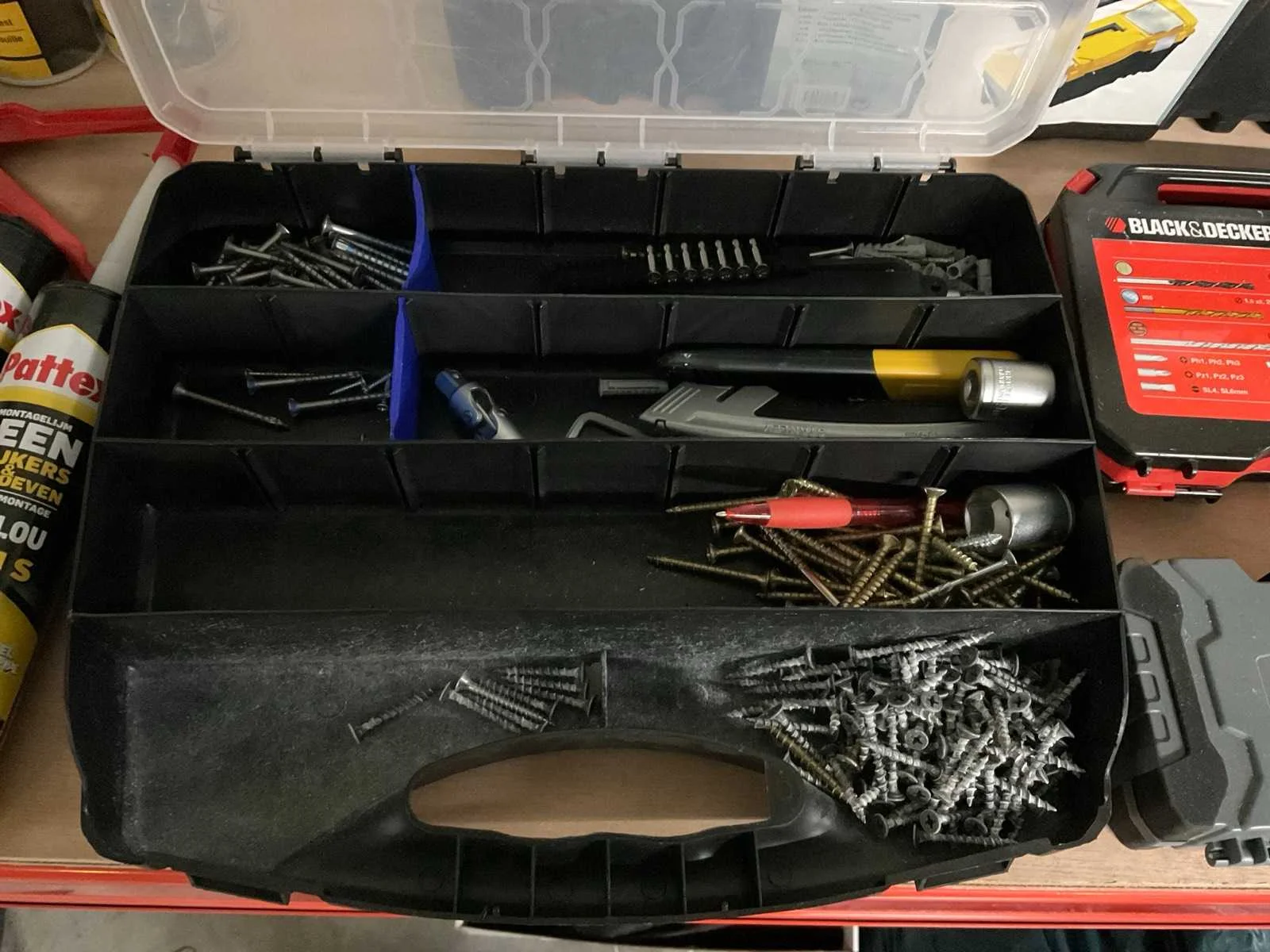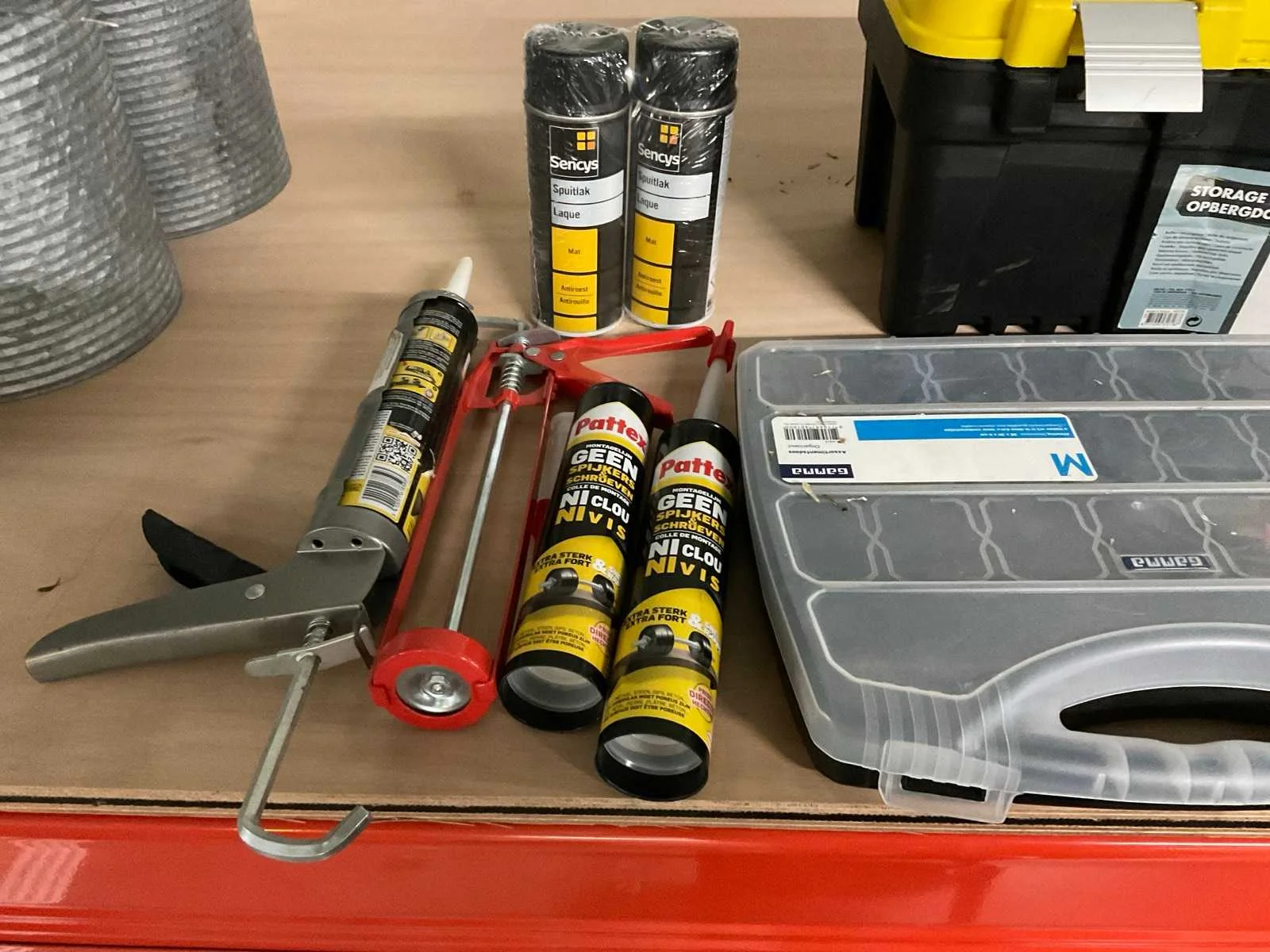 In koffer met o.a. hamer, schroevendraaier, bevestigingsmaterialen, kit, spuitlak, incomplete bitsets etc.