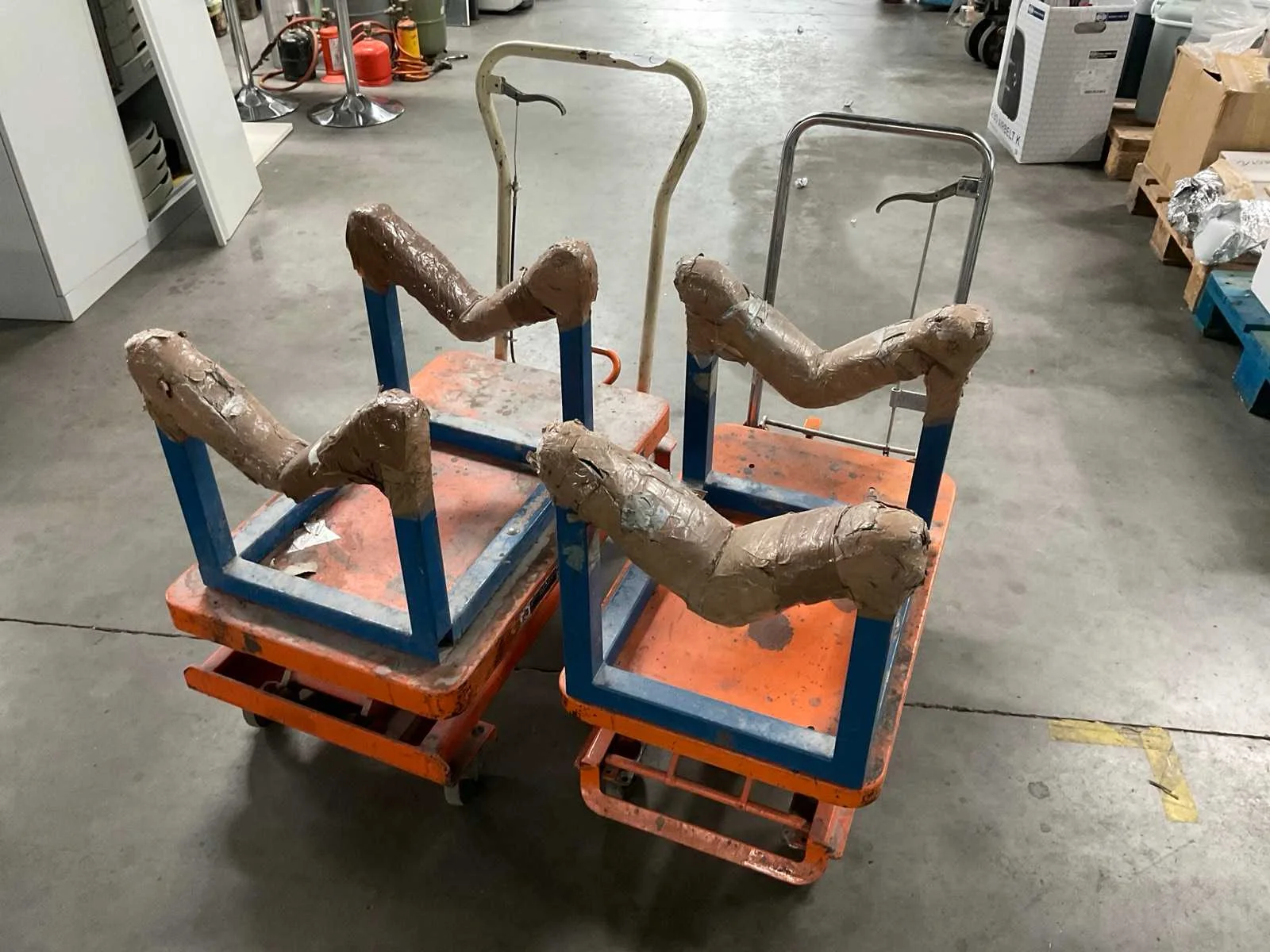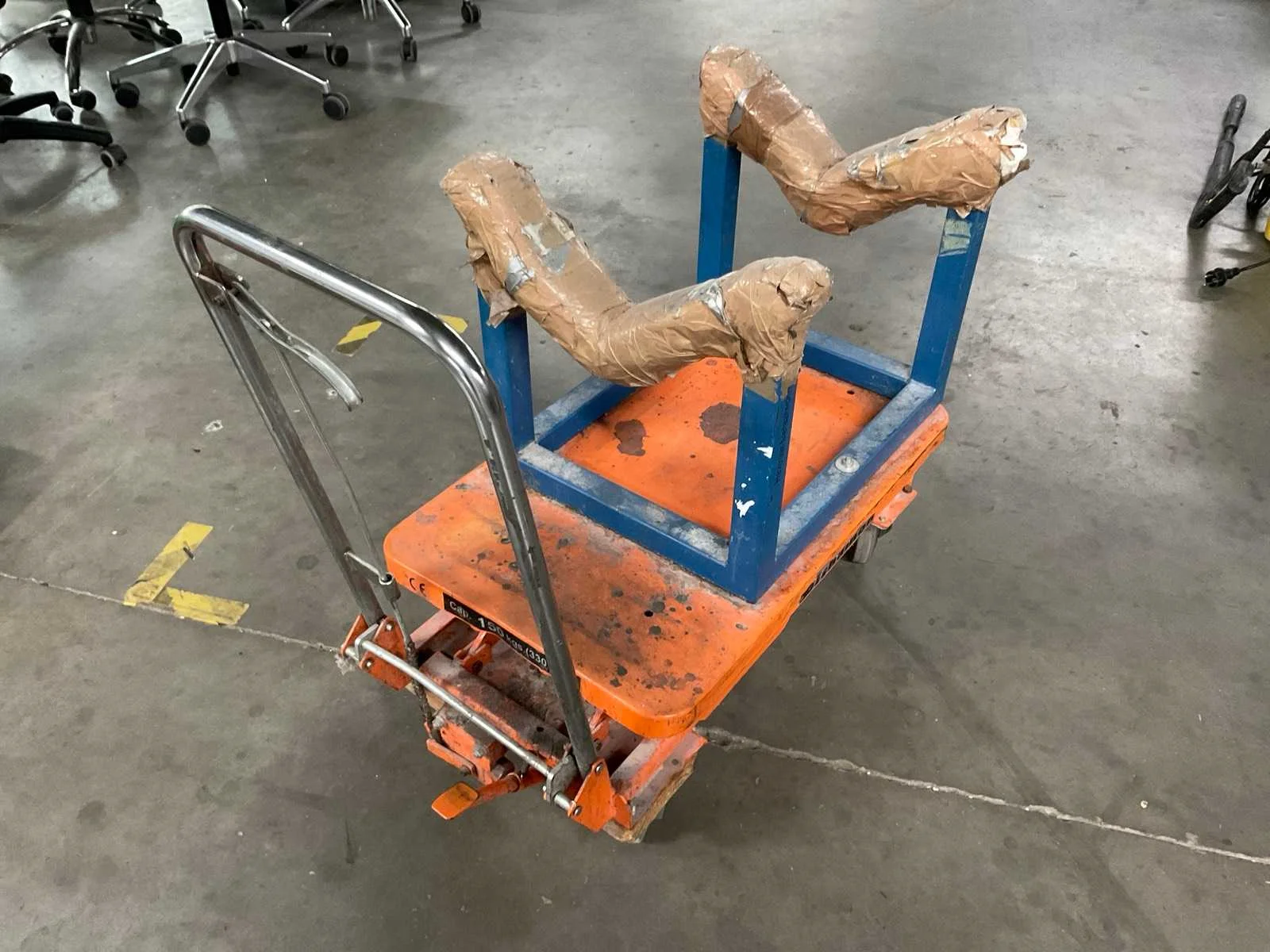 Waarvan 1x max cap. 150kg en 1x max cap. 300kgV.v. gemonteerde rolhouder, hefhoogte ca. 74 cm en 4 zwenkwielen. Merk: Bishamon Product type: Hoogheffer Kleur: Oranje Lengte: 85 Breedte: 45 Hoogte: 82 Materiaal: Metaal Laadvermogen: 150