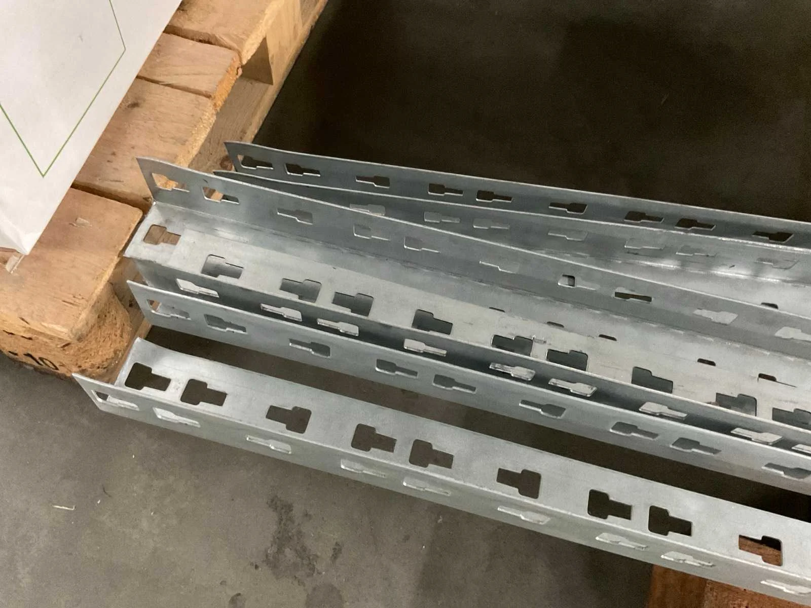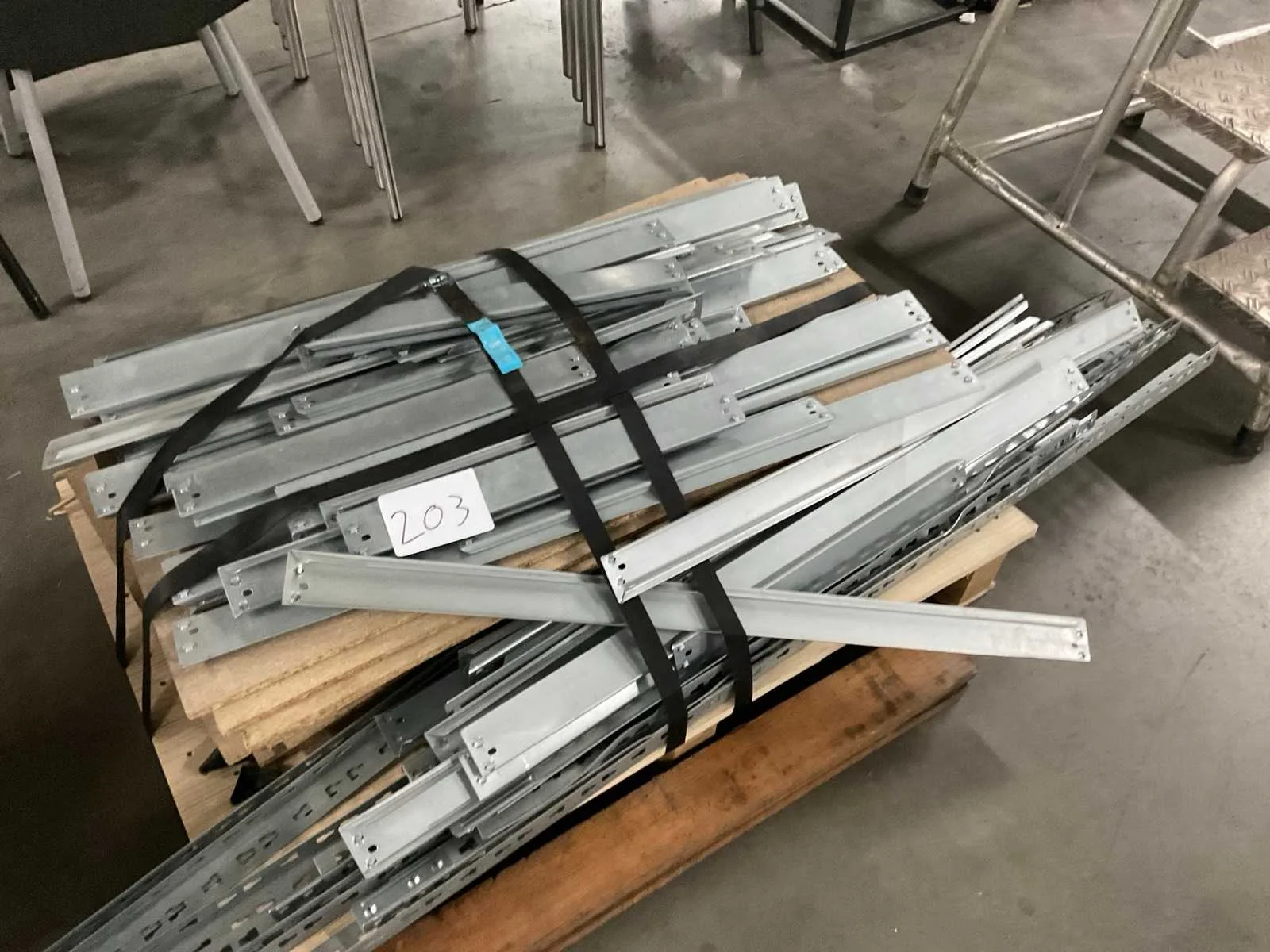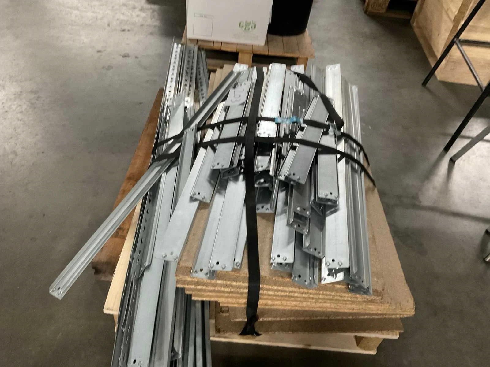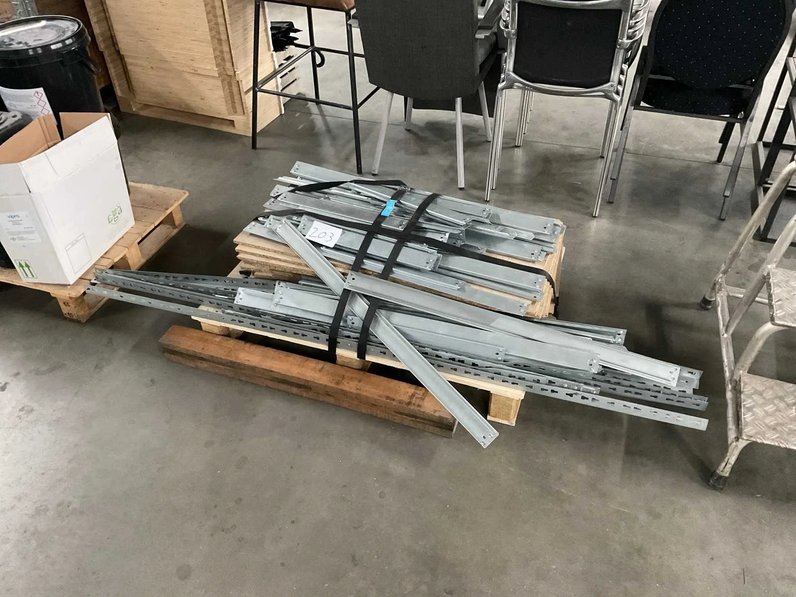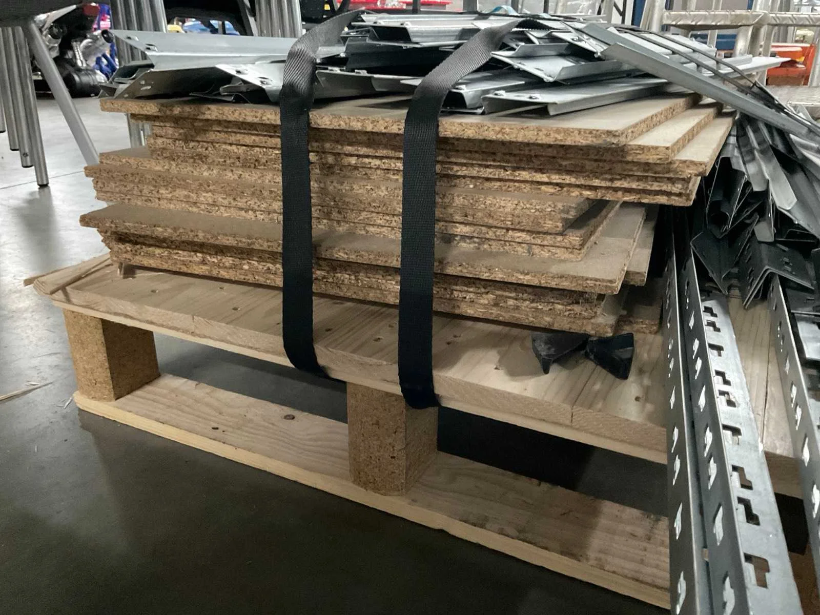 Ca. 180cm hoogte. 6 staanders, 15 legborden. Inclusief pallet en houten balk