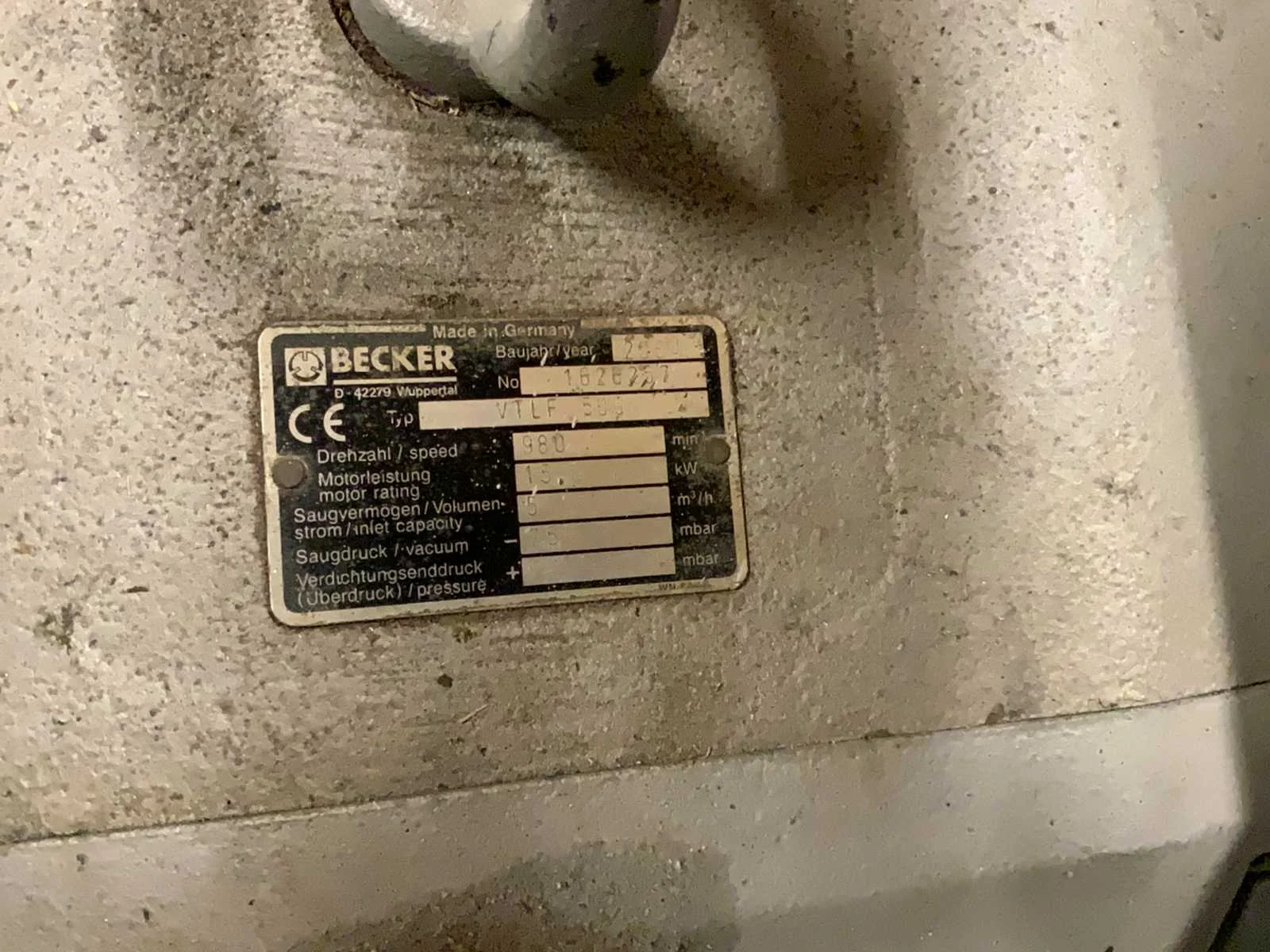 750 mbar. Reeds gedemonteerd, zie foto’s Merk: Becker Type: VTLF5000 Bouwjaar: 2000 Vermogen: 15kW Nominale capaciteit: 500m³/hr Aansluiting: 400V Totale afmeting L: 1600mm Totale afmeting Breedte: 770mm Totale afmeting Hoogte: 900mm
