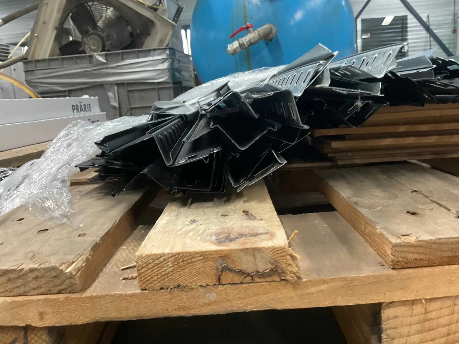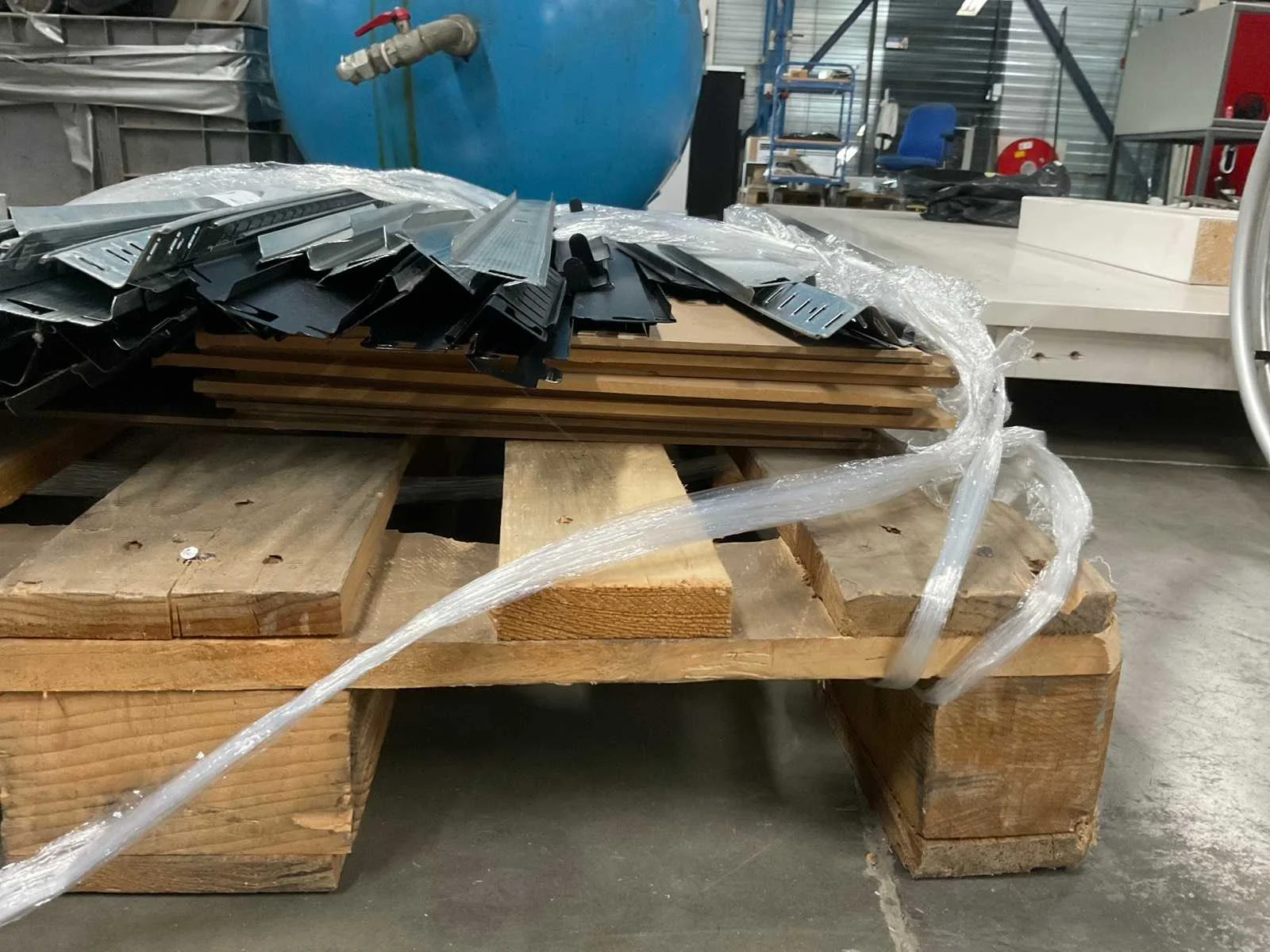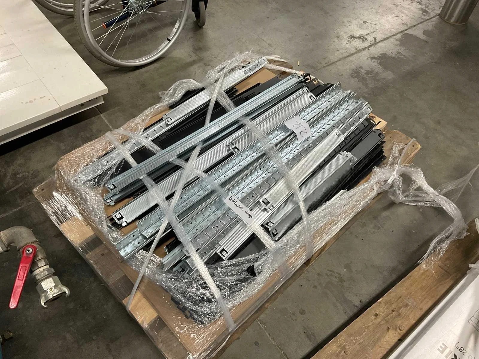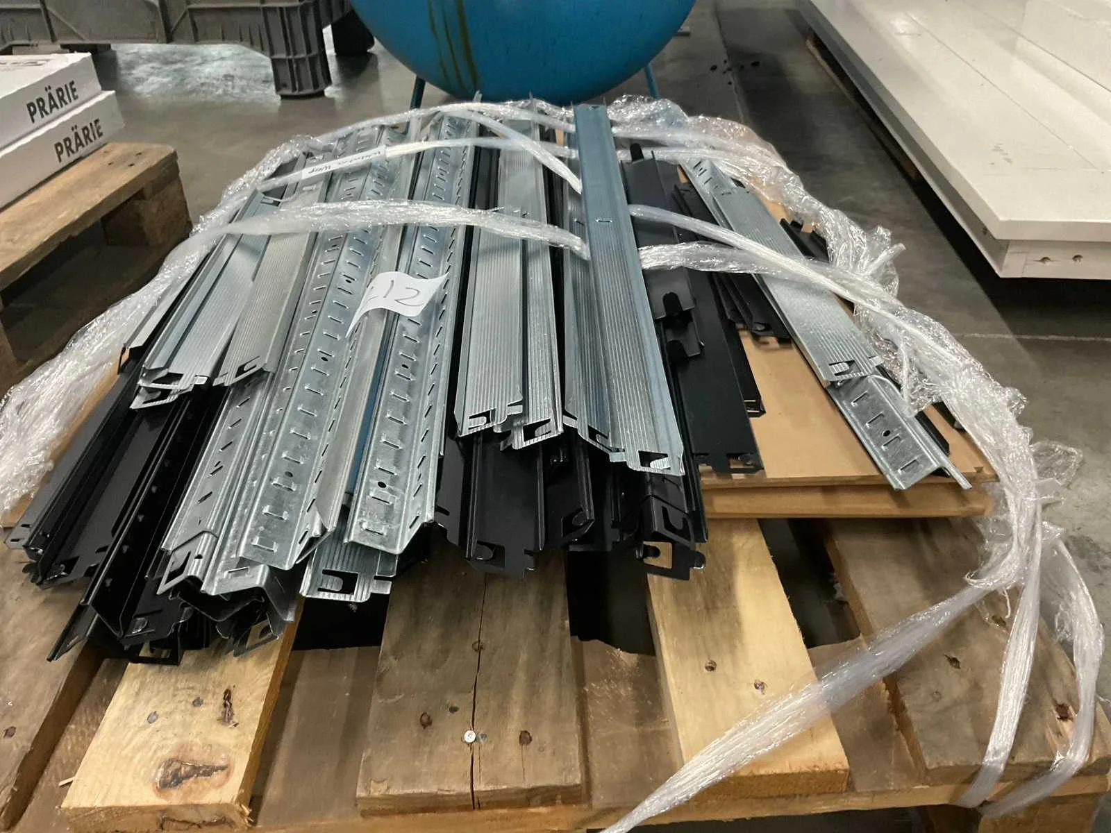 Afmetingen onbekend. Zowel zilveren als zwarte delen. Circa 12 legborden. Exclusief pallet